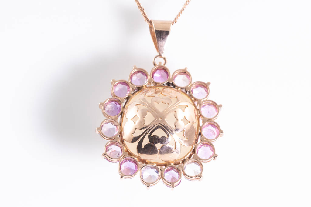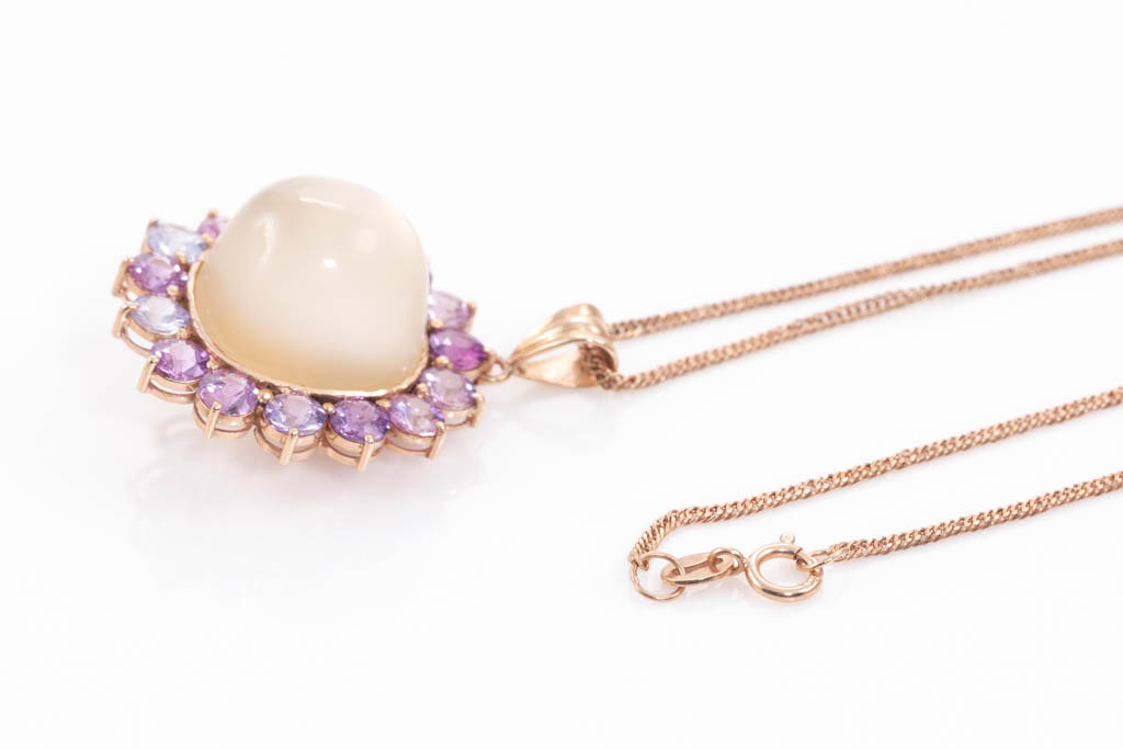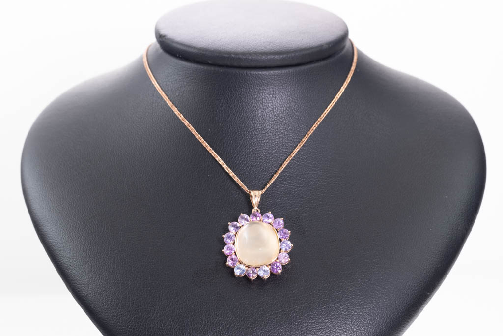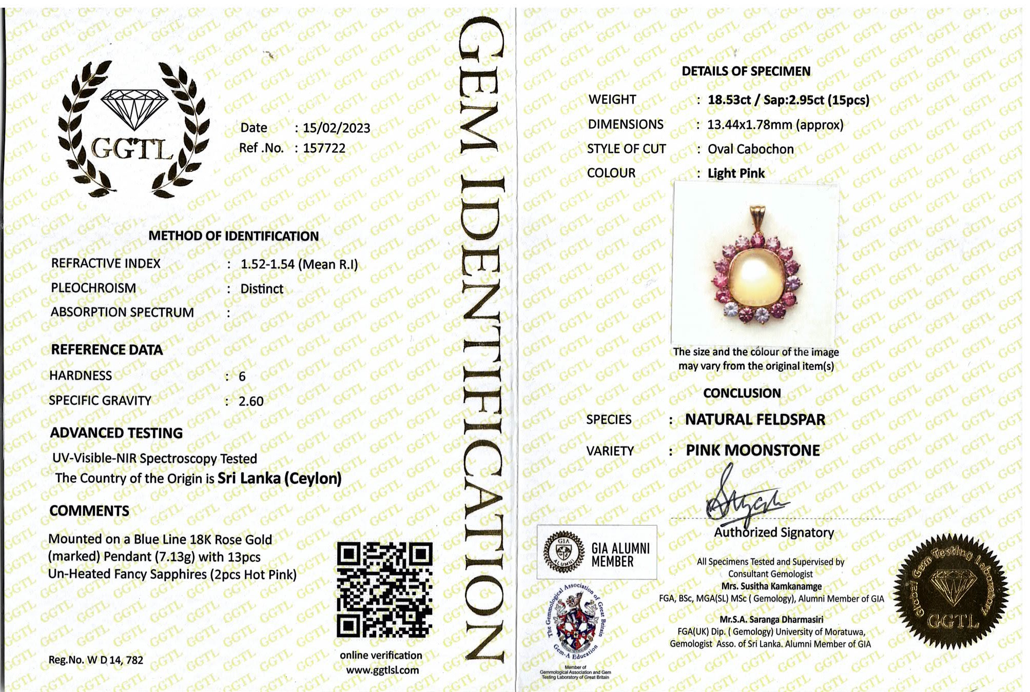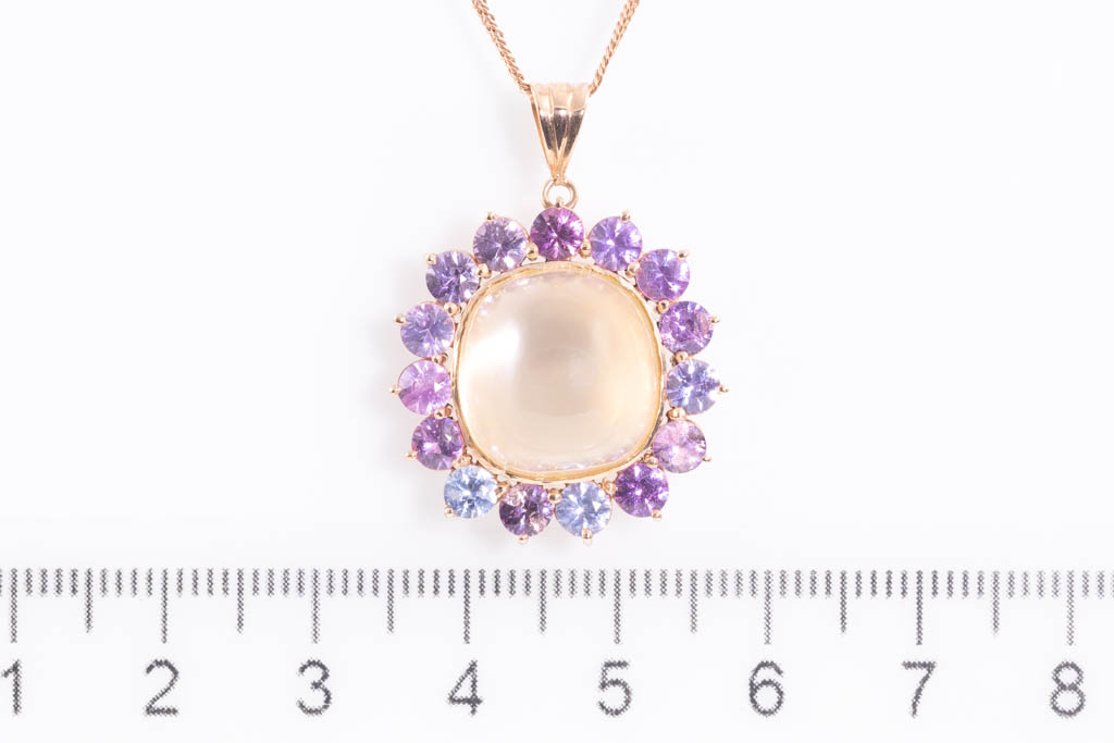 Moonstone and Sapphire pendant with oval cabochon cut Moonstone of 18.53ct and round multi-coloured unheated Ceylon Sapphires totalling 2.95cts. 18ct rose gold with 18ct rose gold 45cm chain. With GGTL Certificate #157722. Weight: 8.2g (Pre-owned)