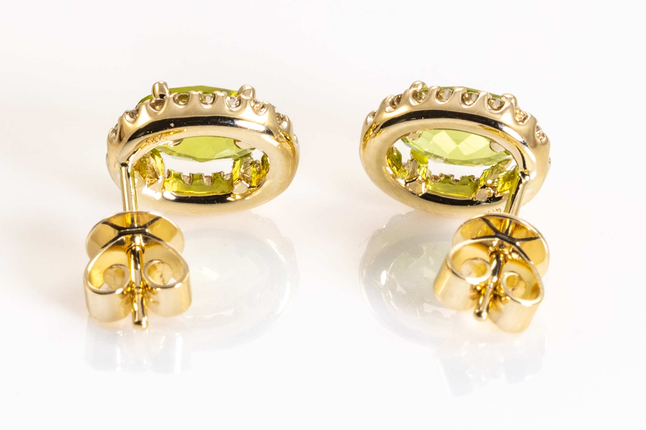 Peridot and Diamond earrings with oval Peridot totalling 1.85cts and round Diamonds totalling 0.23cts. 14ct yellow gold. Weight: 2.6g. (New)