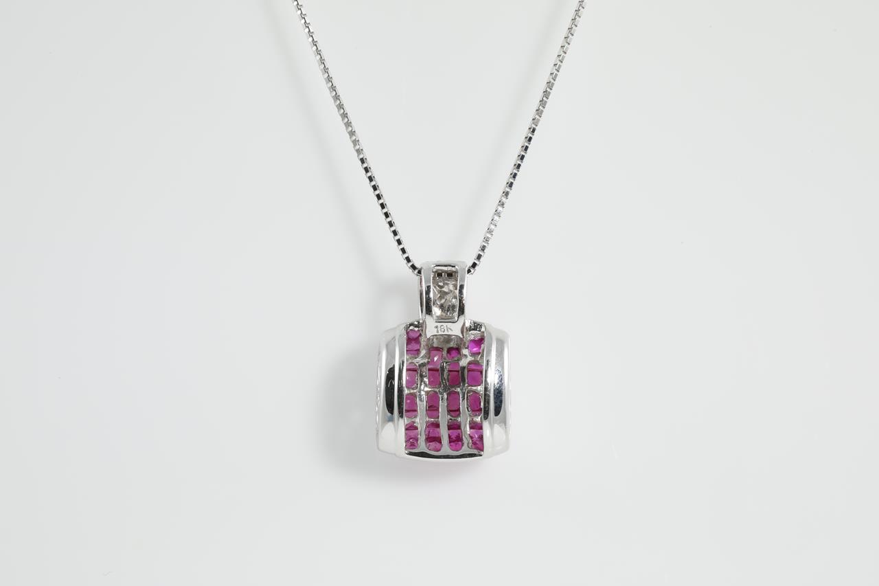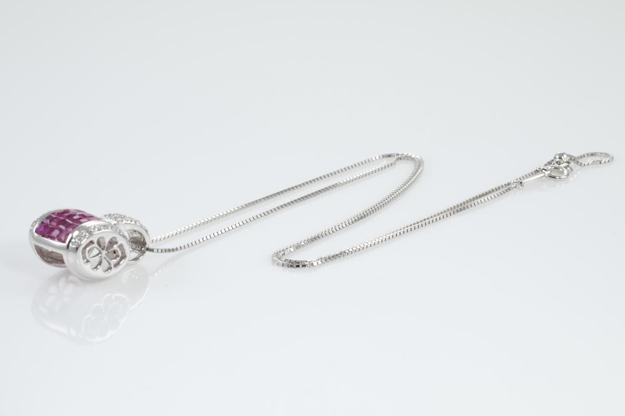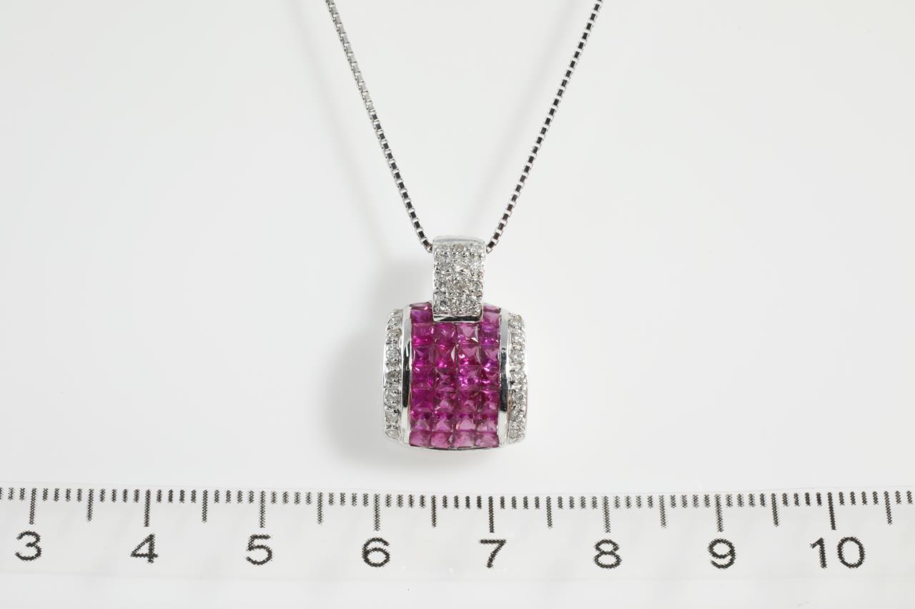 Ruby and Diamond pendant with carre cut Rubies totalling 1.85cts and Diamonds totalling 0.25cts (estimated grading: I P1). 18ct white gold with 18ct 45cm adjustable chain. Weight: 6.9g (pre-owned)