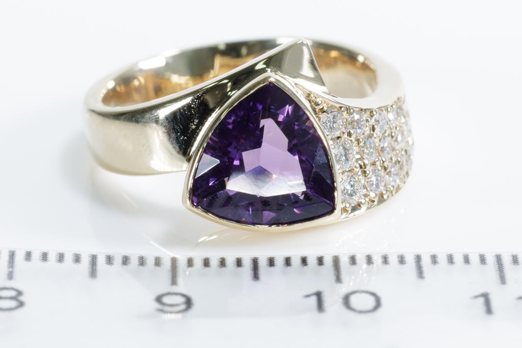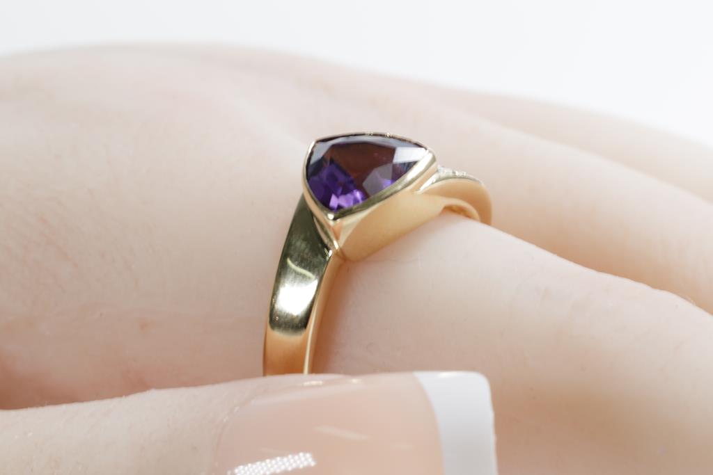 Amethyst and Diamond ring with a trilliant cut Amethyst of 1.87ct and round Diamonds totalling 0.27cts. 18ct yellow gold. Ring size O. Weight: 9.5g. (Pre-owned)