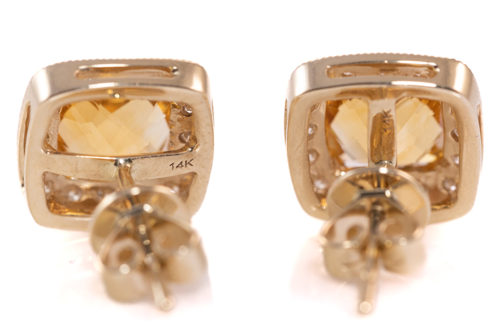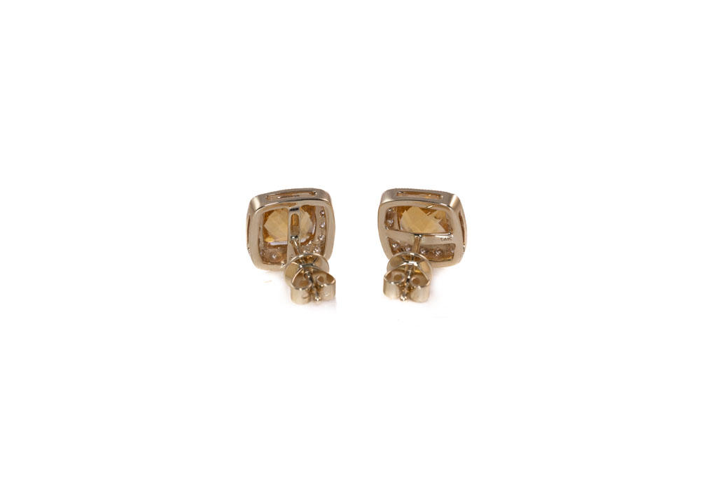 Citrine and Diamond earrings with cushion cut Citrine totalling 1.87cts and round Diamonds totalling 0.21cts. 14ct yellow gold. Weight: 2.6g. (New)