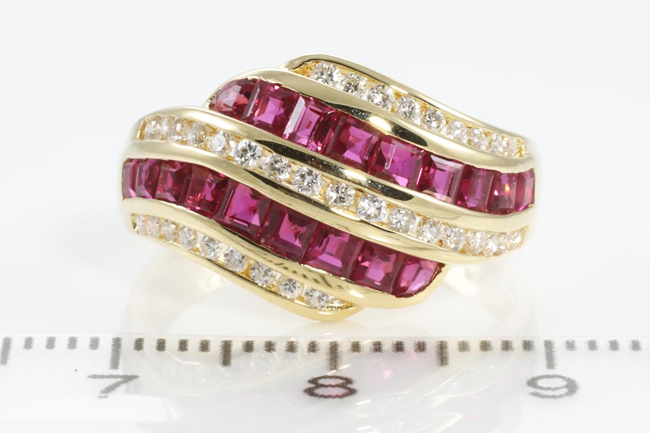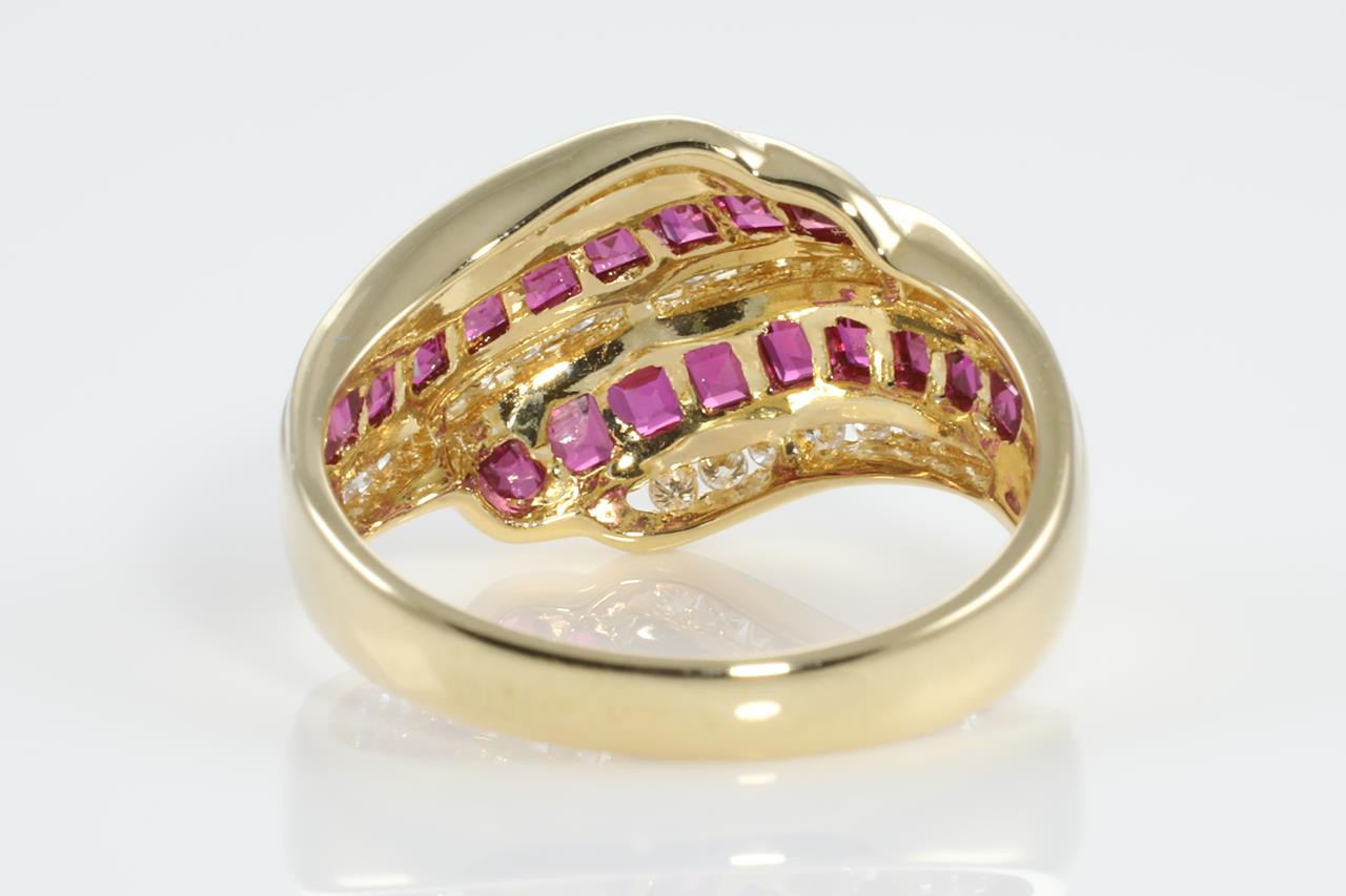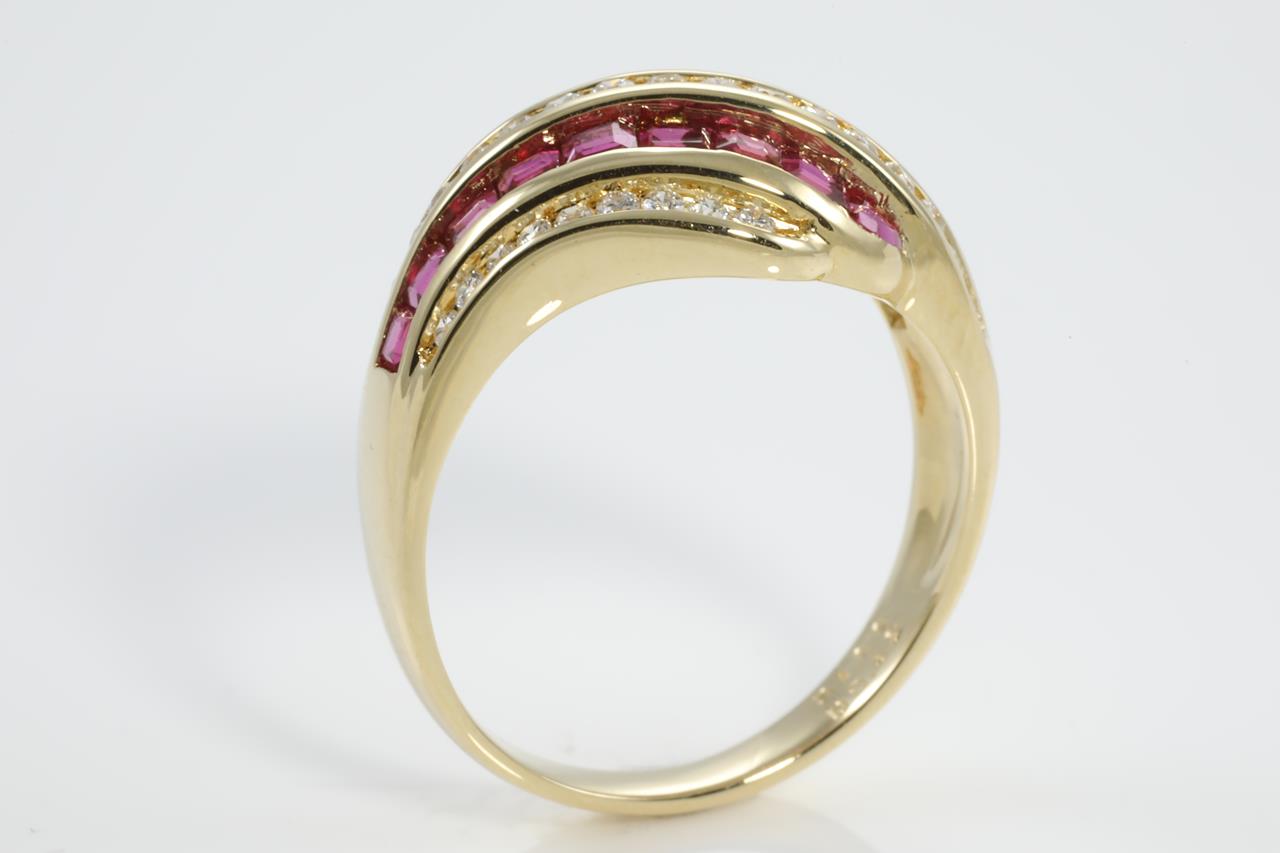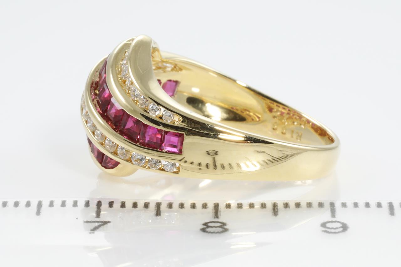 Ruby and Diamond ring with princess cut Rubies totalling 1.88cts and round Diamonds totalling 0.42cts (Estimated grading : H SI). 18ct yellow gold. Ring size O - Ring resizing is not recommended. Weight:5.3g (Pre-owned)