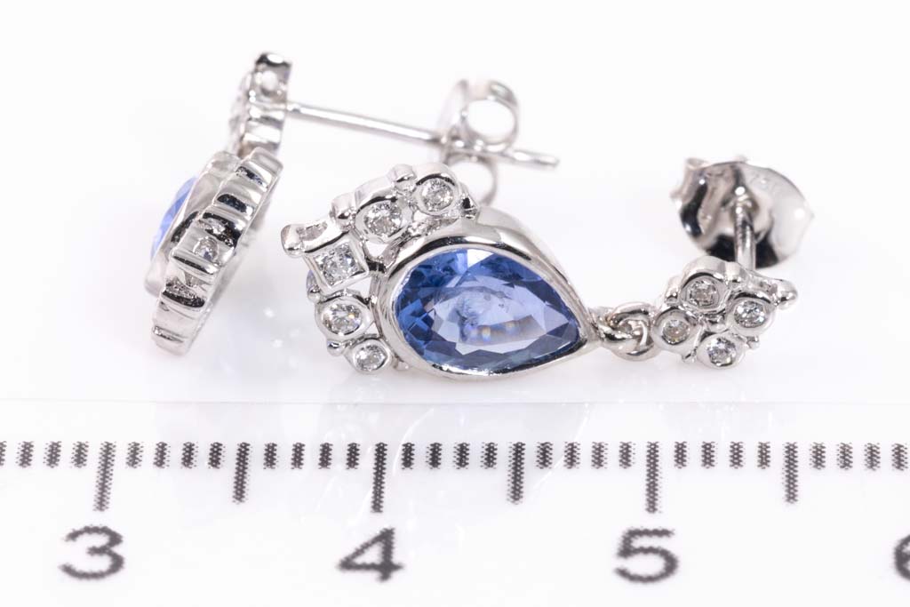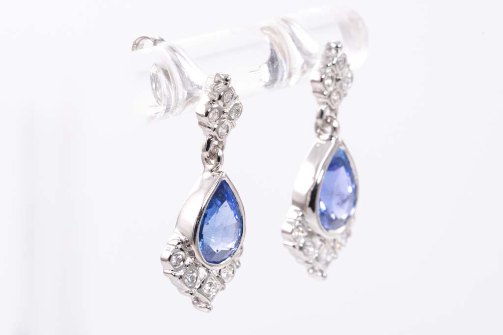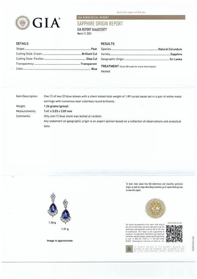 Sapphire and Diamond earrings with 2 pear shape Sri Lanka blue Sapphires totalling 1.89cts (with GIA report # 5466022077) and round Diamonds totalling 0.18cts. 18ct white gold. Weight: 2.6g. (Pre-owned)