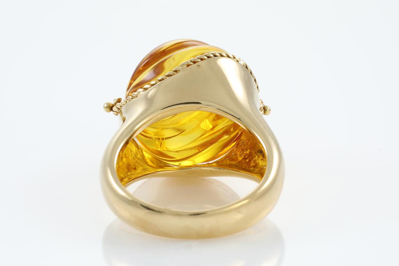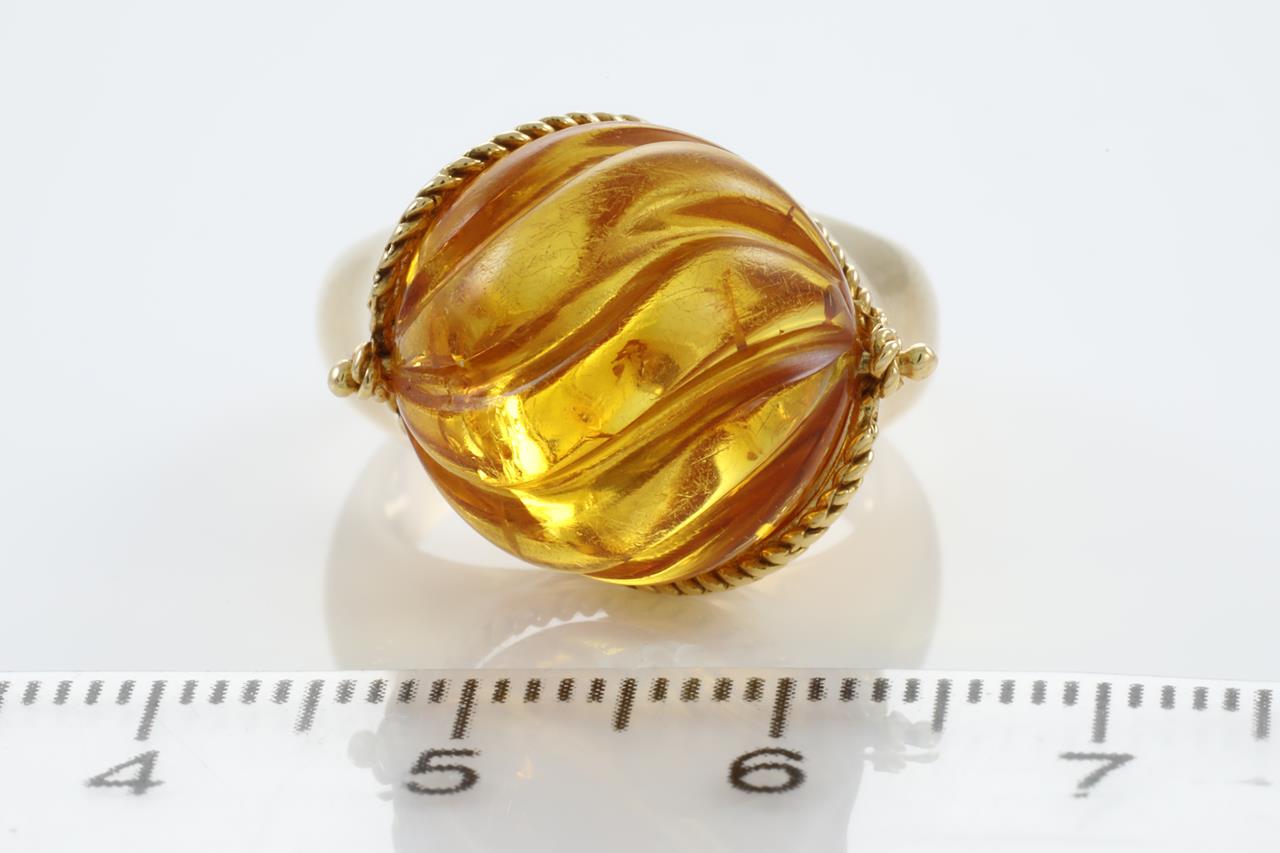 Amber Ring with with fancy cut Amber. 18ct yellow gold. Ring size M. It is not recommended to resize this ring. Weight: 11.3g (Pre-owned)