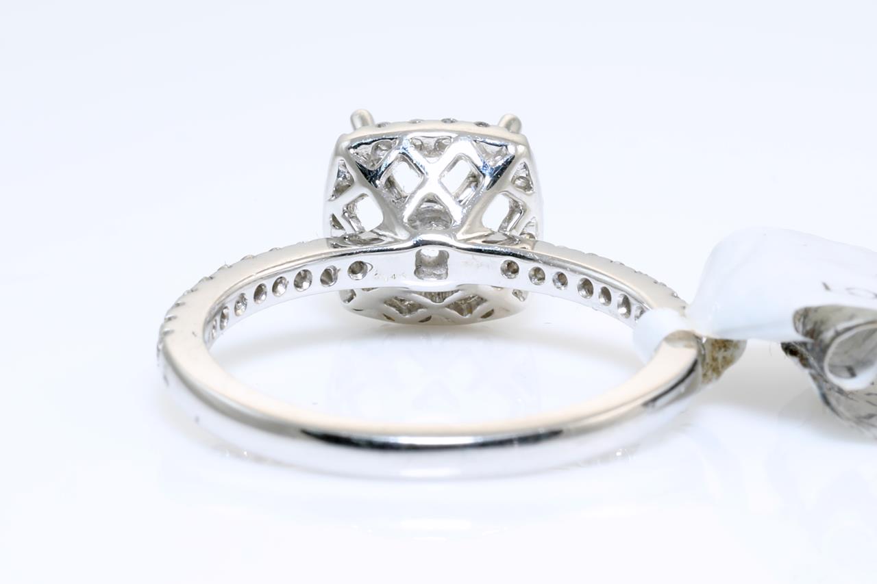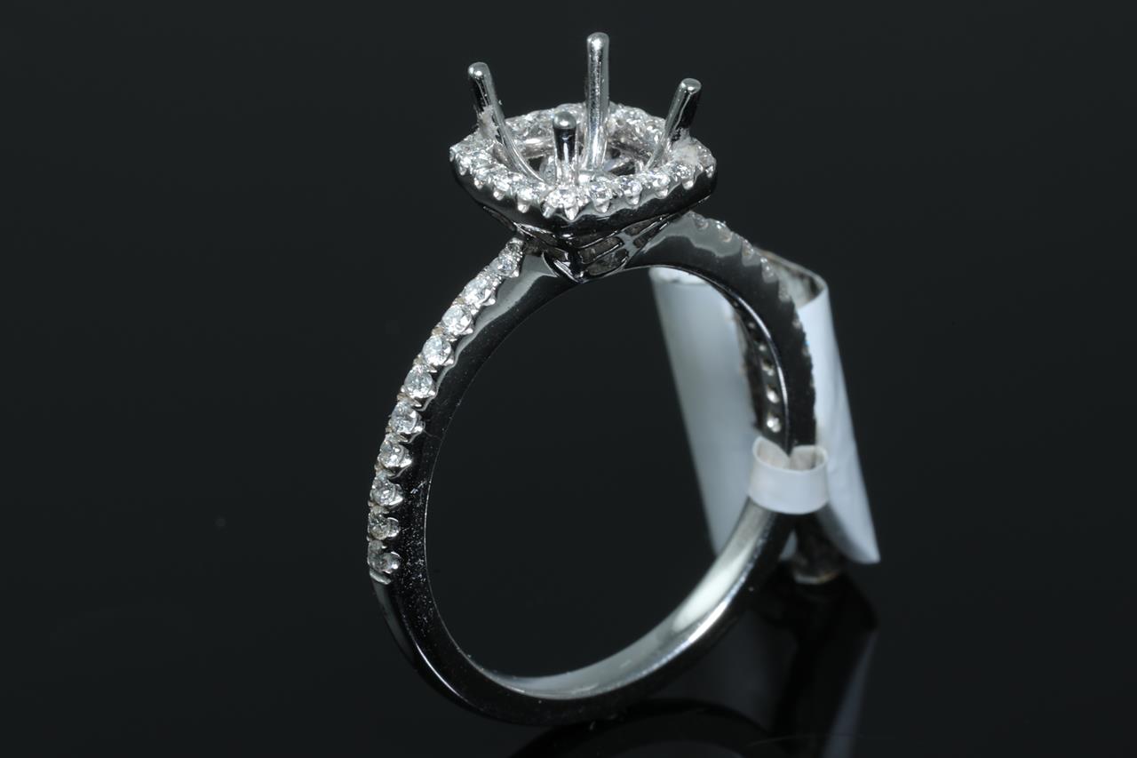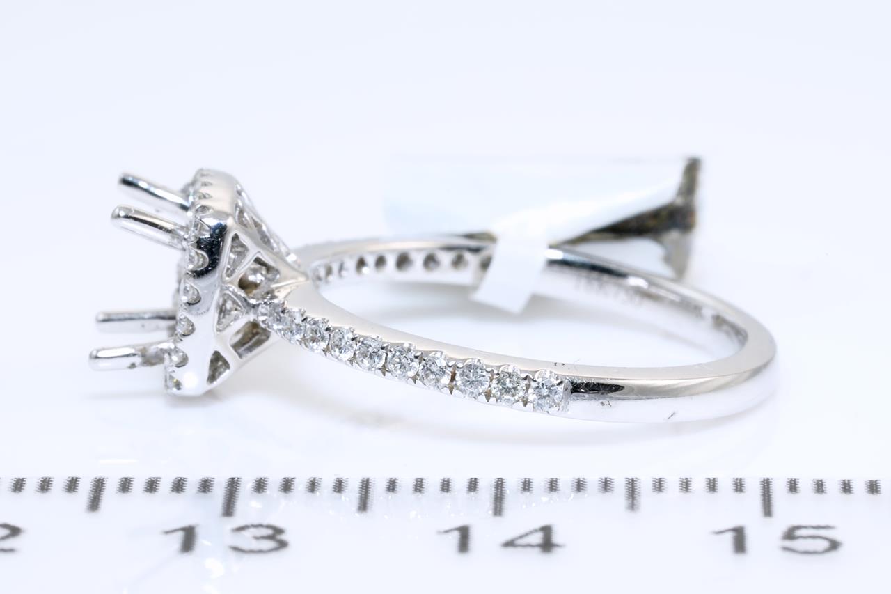 18ct white gold 4 claw halo semi mount ring for 6mm x 6mm centre cushion cut stone. Side Diamonds totalling 0.32cts (Estimated grading: G SI). Ring size M - cannot be resized up, down with ring clip. Weight: 3.5. (As new)