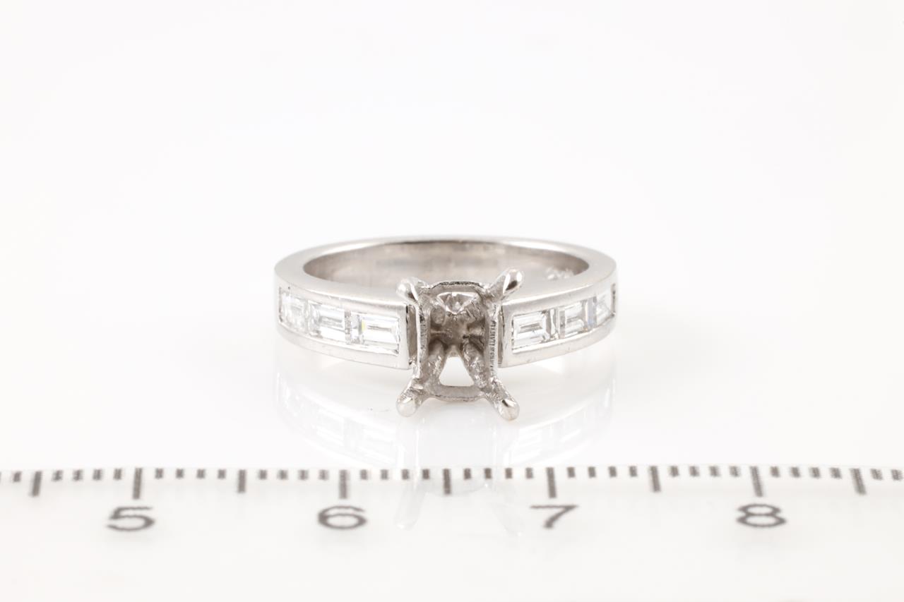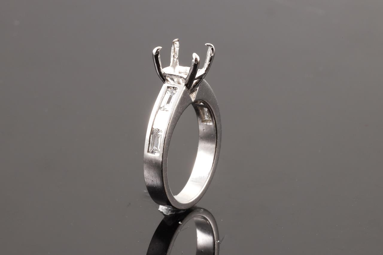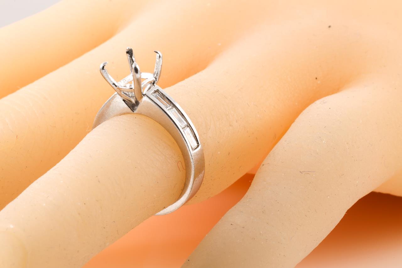 18ct white gold semi mount ring for centre 6.3mm x 4mm cushion cut stone (original centre stone has been removed) . 6 baguette cut shoulder Diamonds totalling 0.24cts. Ring size H - cannot be resized up, down with ring clip. Weight: 4.6g. (Pre-owned)