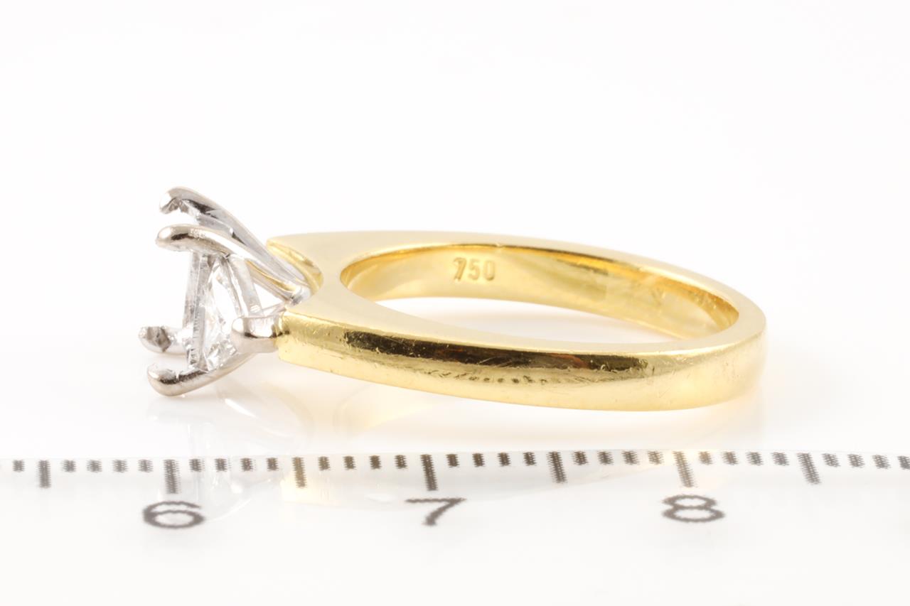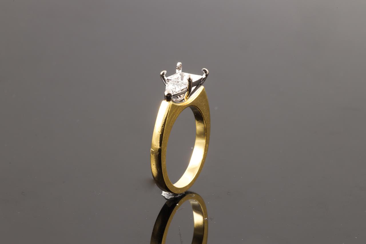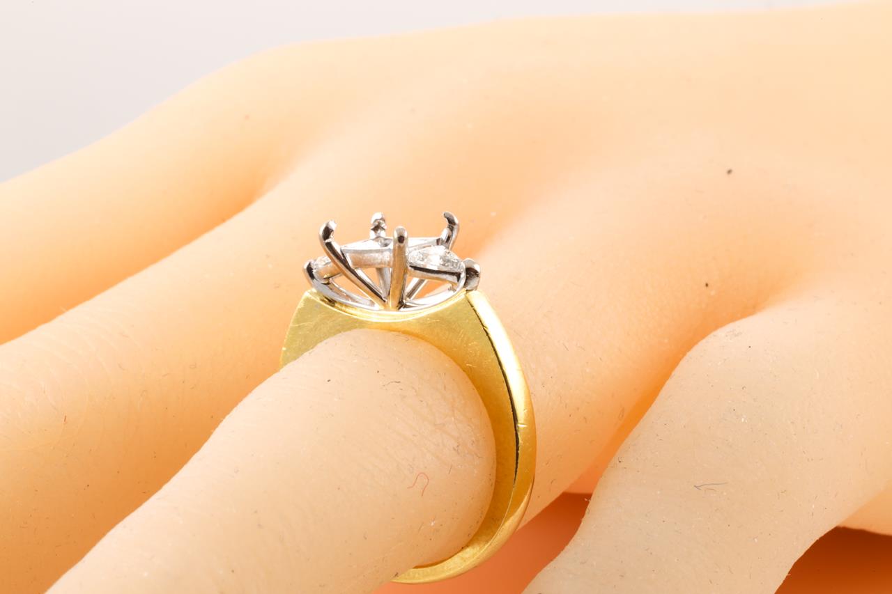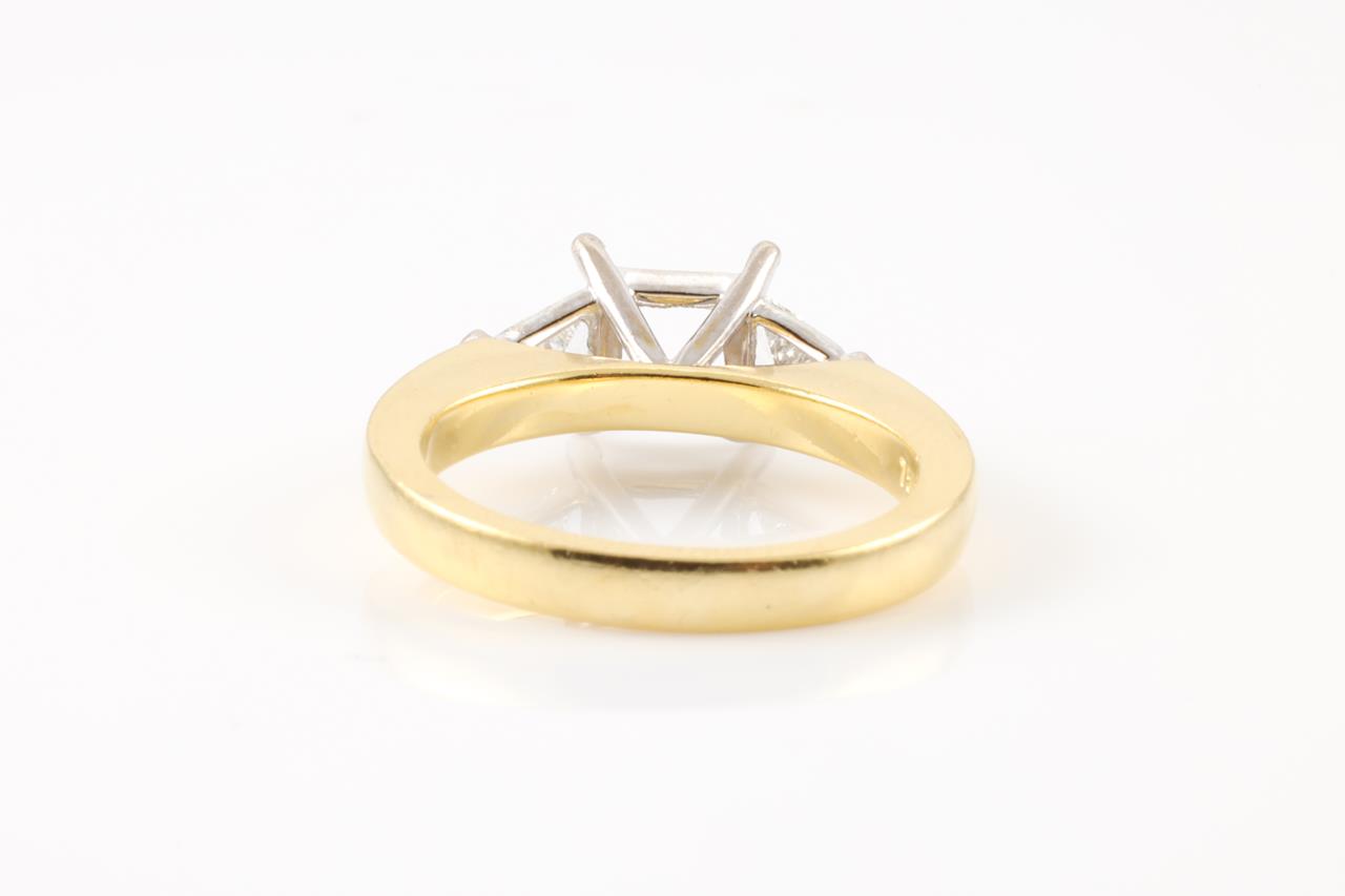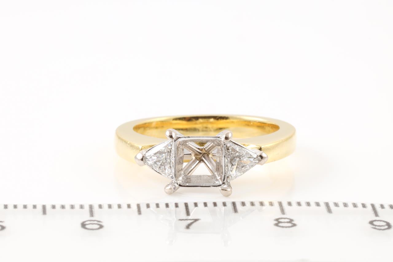 18ct yellow & white gold 4 claw semi mount ring (original centre stone has been removed) for 5.5mm x 5.5mm centre princess cut stone. 2 side trilliant cut Diamonds totalling approximately 0.22cts (Estimated grading: H SI). Ring size K3/4 - cannot be resized up, down with ring clip.. Weight: 5.8g. (Pre-owned)