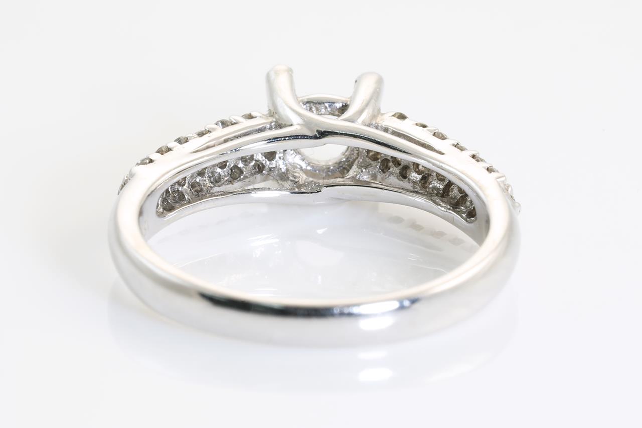 18ct white gold 4 claw (original centre stone has been removed) semi mount ring for 4.5mm centre round stone. Side Diamonds totalling approximately 0.38cts (Estimated grading: G SI). Ring size O - cannot be resized up, down with ring clip. Weight: 4.4g. (Pre-owned)