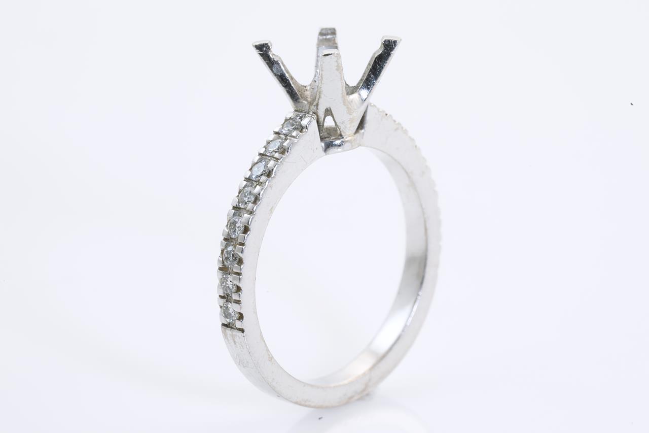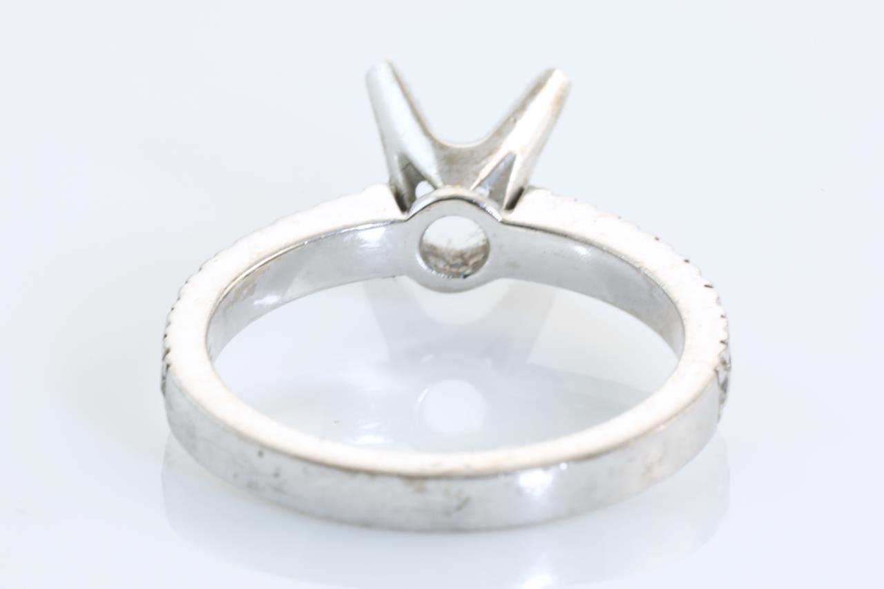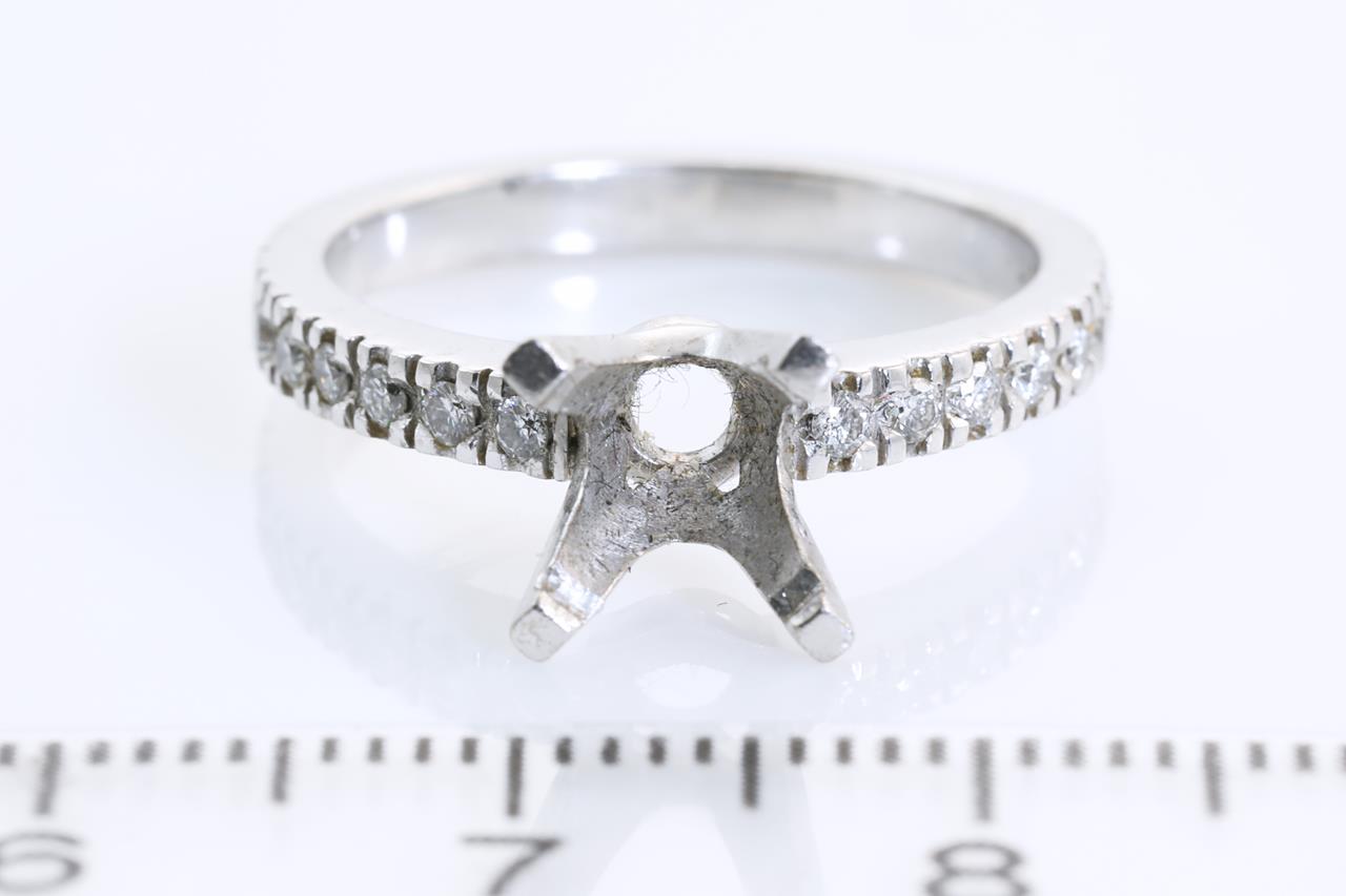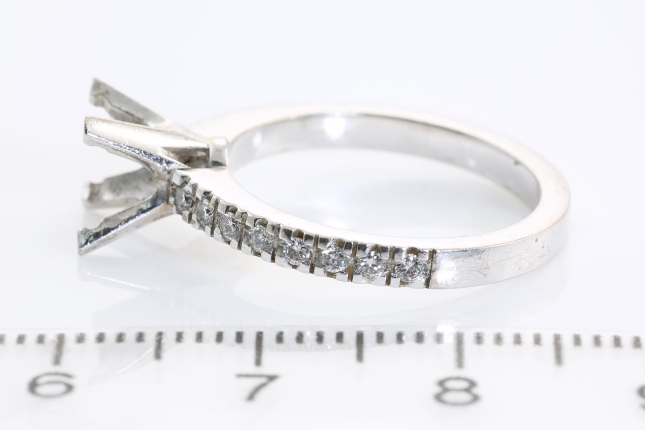18ct white gold 4 claw ring mounting (original centre stone has been removed) for 7mm centre round stone. Side Diamonds totalling approximately 0.32cts (Estimated grading: H SI). Ring size L - cannot be resized up, down with ring clip. Weight: 4.3g. (Pre-owned)