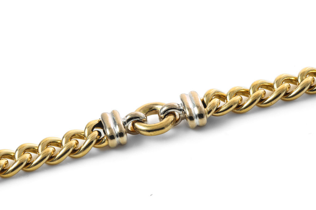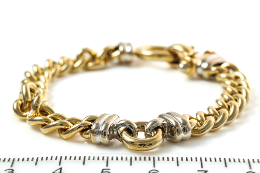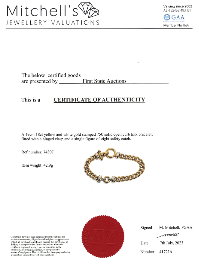 Gold curb links bracelet with 18ct Yellow and white gold. Length: 19cm. Weight: 42.9g. With Certificate #417216. (Pre-owned)