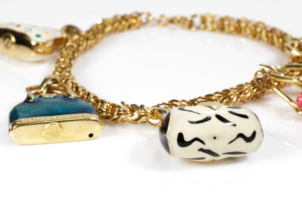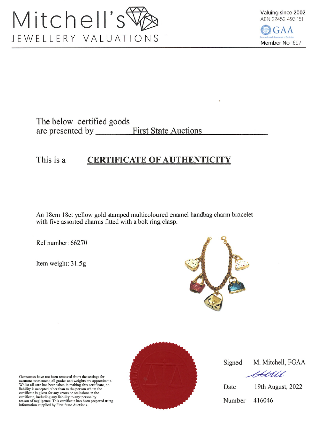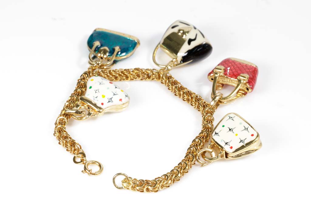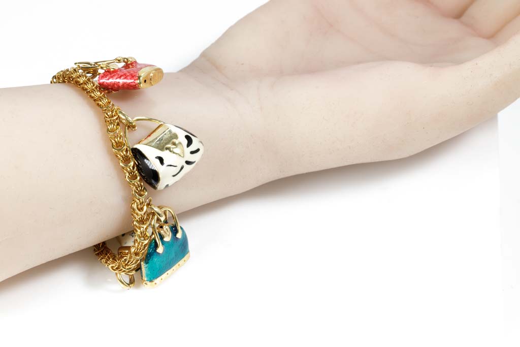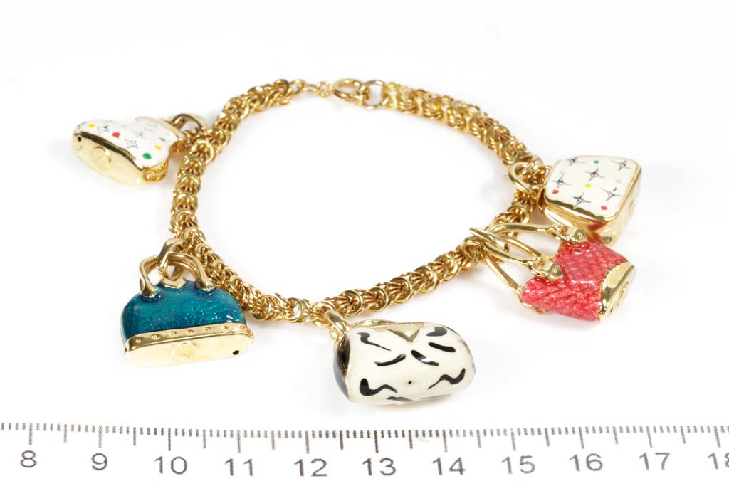 Bracelet with 5 multi-colour enamel hand bag charms. Length: 18cm. 18ct yellow gold. Weight: 31.5g. With Certificate #416046. (pre-owned)