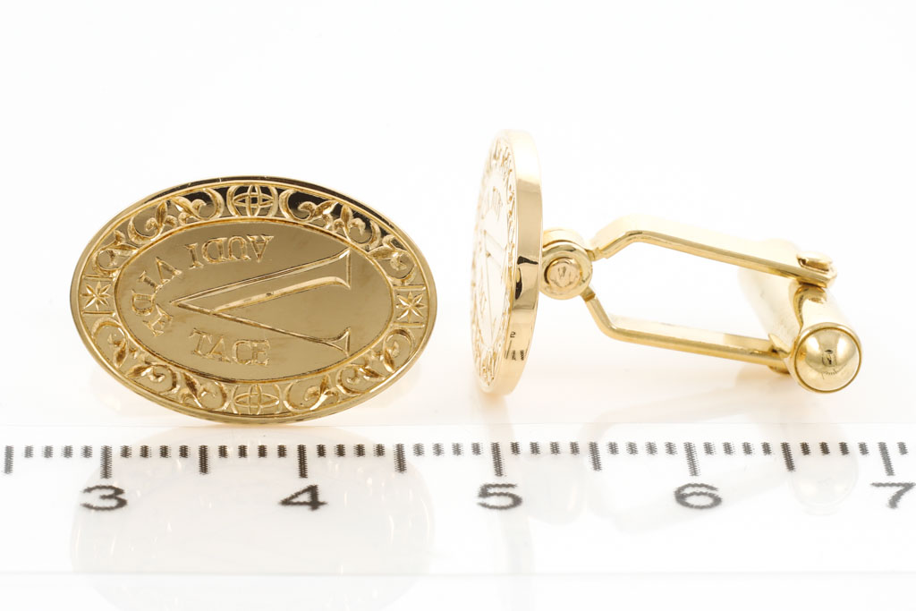 18ct yellow gold cuff links with Latin inscription 'Audi, Vide, Tace' meaning Hear, See, Be Silent and letters SC at the back. Weight: 13.0g. (Pre-owned)