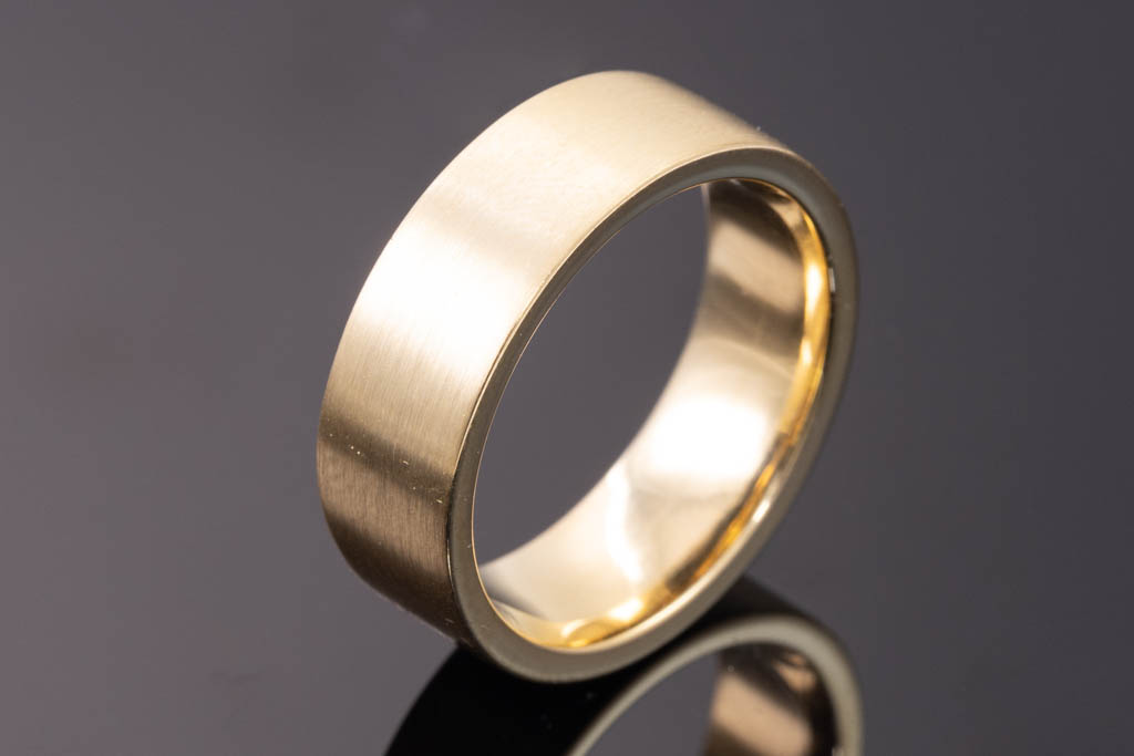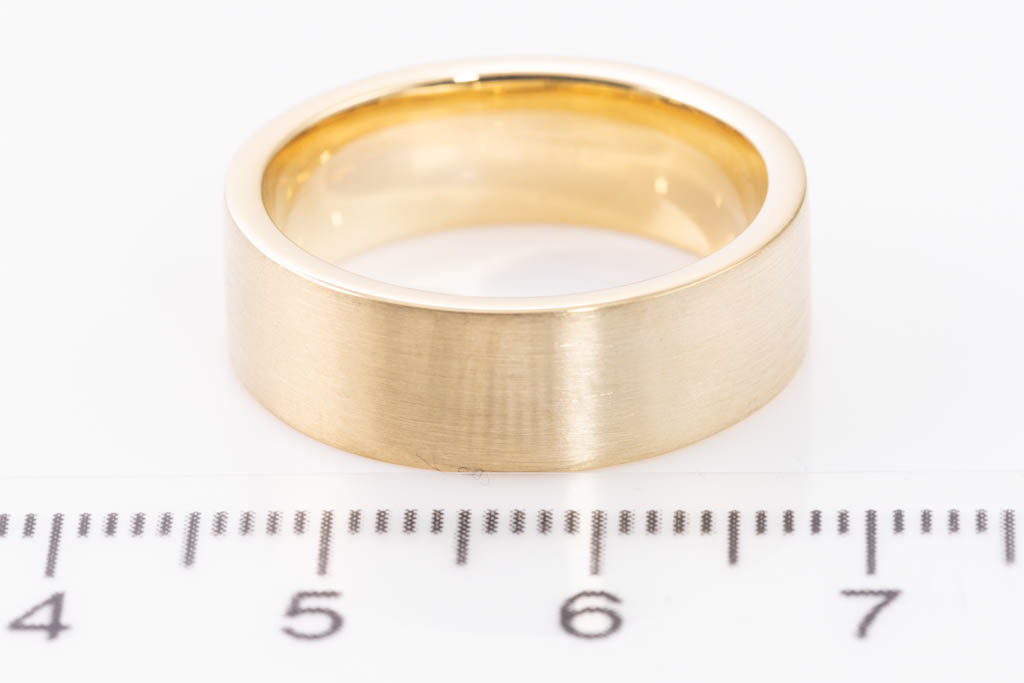 Mens wedding band. 18ct yellow gold with a matt finish. Width: 7mm. Ring size O - ring resizing is not recommended. Weight: 12.4g. With Valuation Certificated dated 05/11/2016. (Pre-owned)