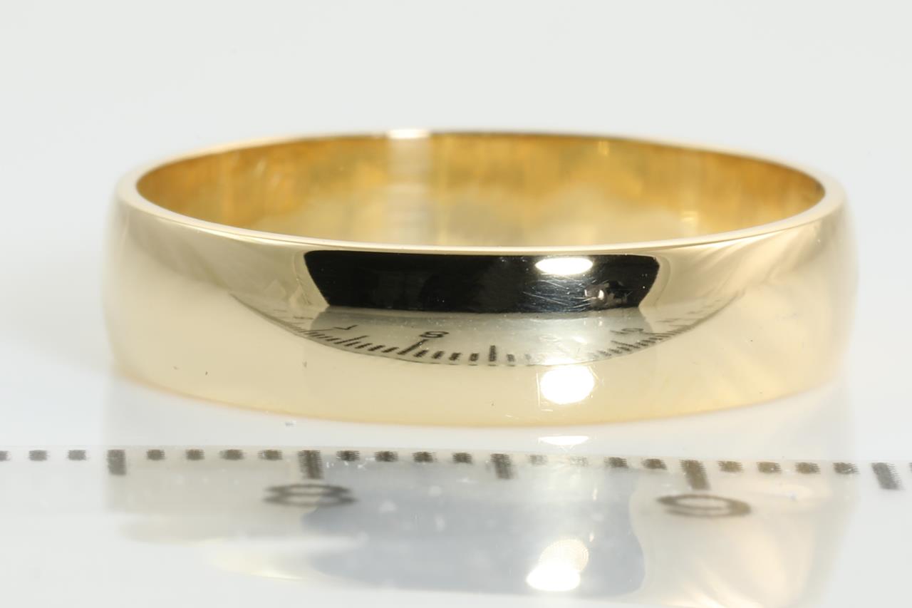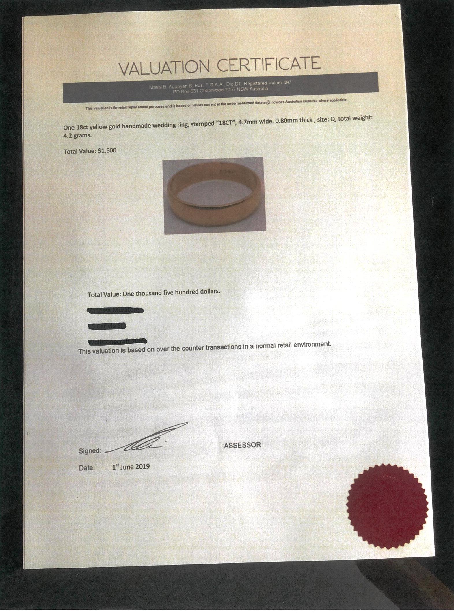 18ct yellow gold wedding band. Ring size O1/2 - Note it is not recommended to resize this ring. With a copy of valuation certificate dated 1 June 2019. Weight: 4.2g (Pre-owned)