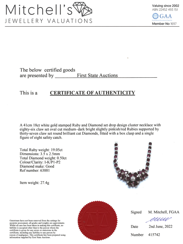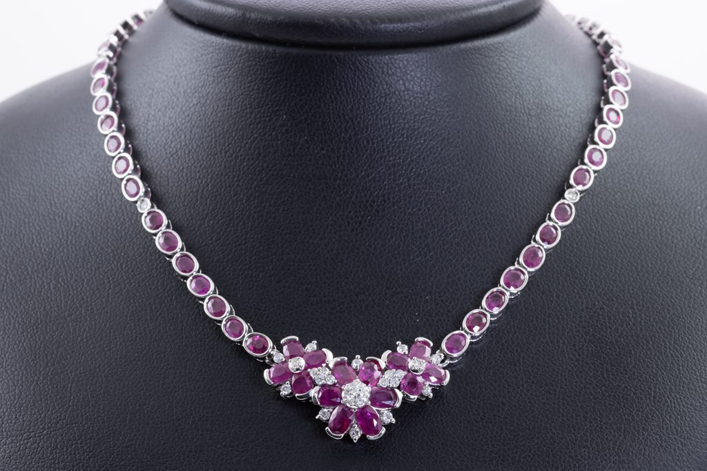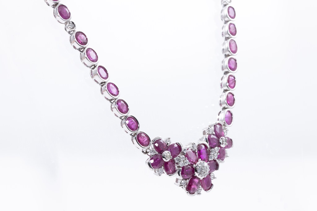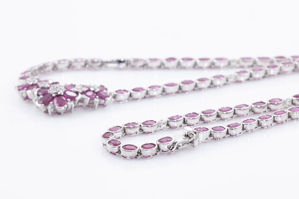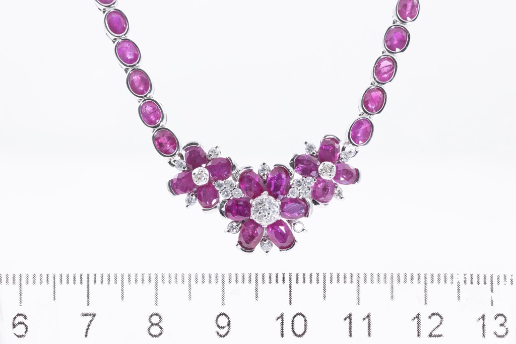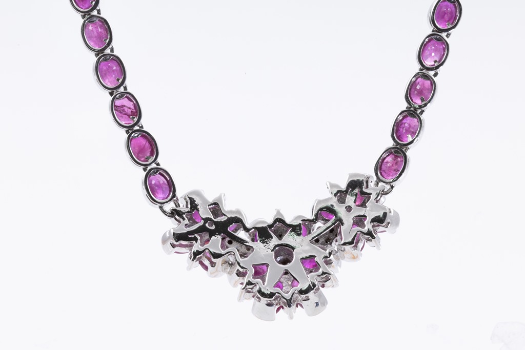 Ruby and Diamond necklace with oval Rubies totalling 19.05cts and round Diamonds totalling 0.50cts (Estimated grading: I-K P1-P2). 18ct white gold. Length: 41cm. Weight: 27.4g. With Certificate #415742. (Pre-owned)