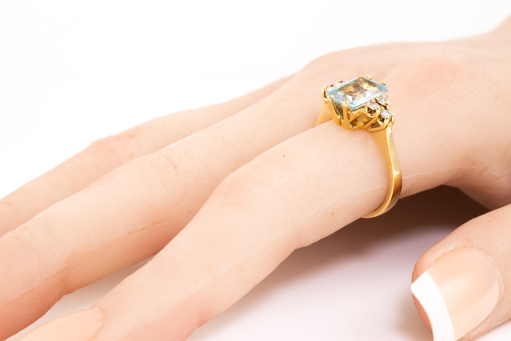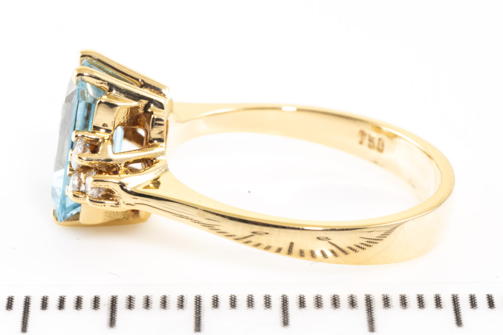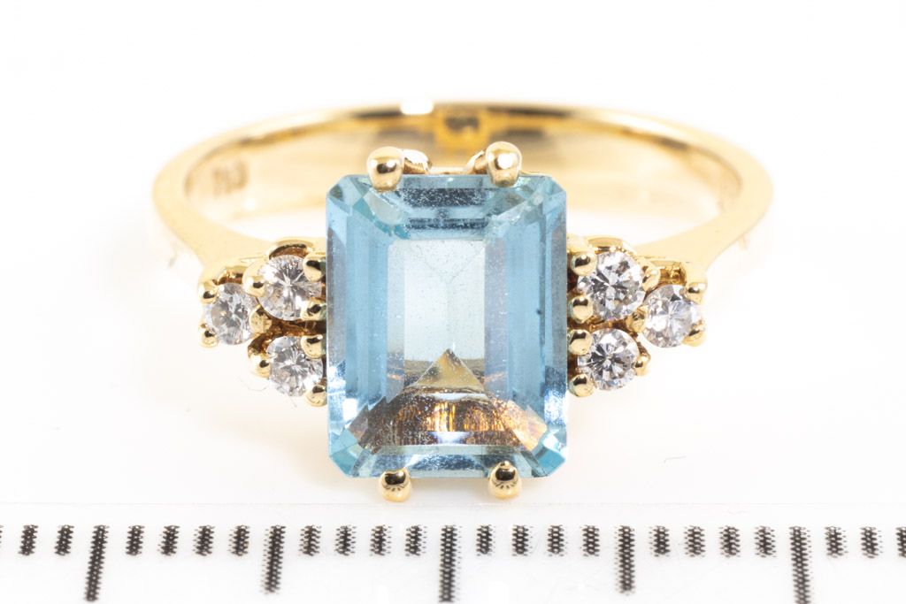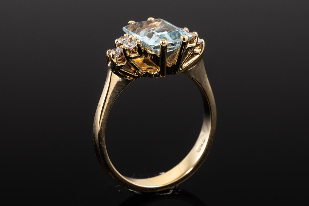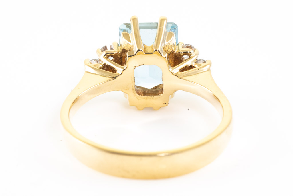 Aquamarine and Diamond ring with an emerald cut Aquamarine of approximately 1.90cts and 6 Diamonds totalling 0.17cts. 18ct yellow gold. Ring size M3/4. Weight: 5g. (Pre-owned)