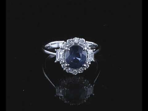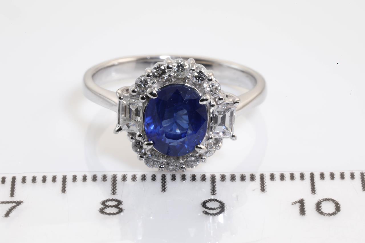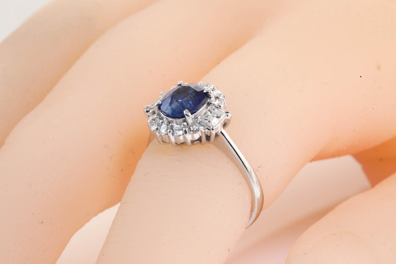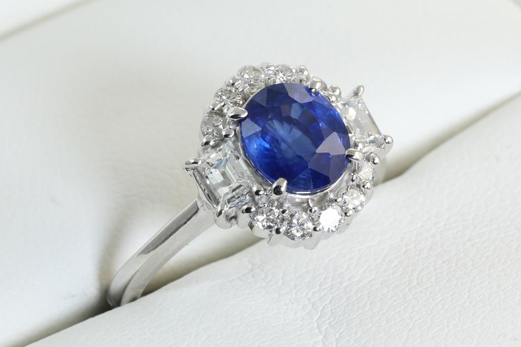 Sapphire and Diamond ring with oval blue Ceylon Sapphire of 1.90ct and Diamonds totalling 0.50cts (Estimated grading: G-H SI-P1). Platinum. Ring size: M (Note: ring should only be resized 3 sizes up or down). Weight: 6.0g (Pre-owned).