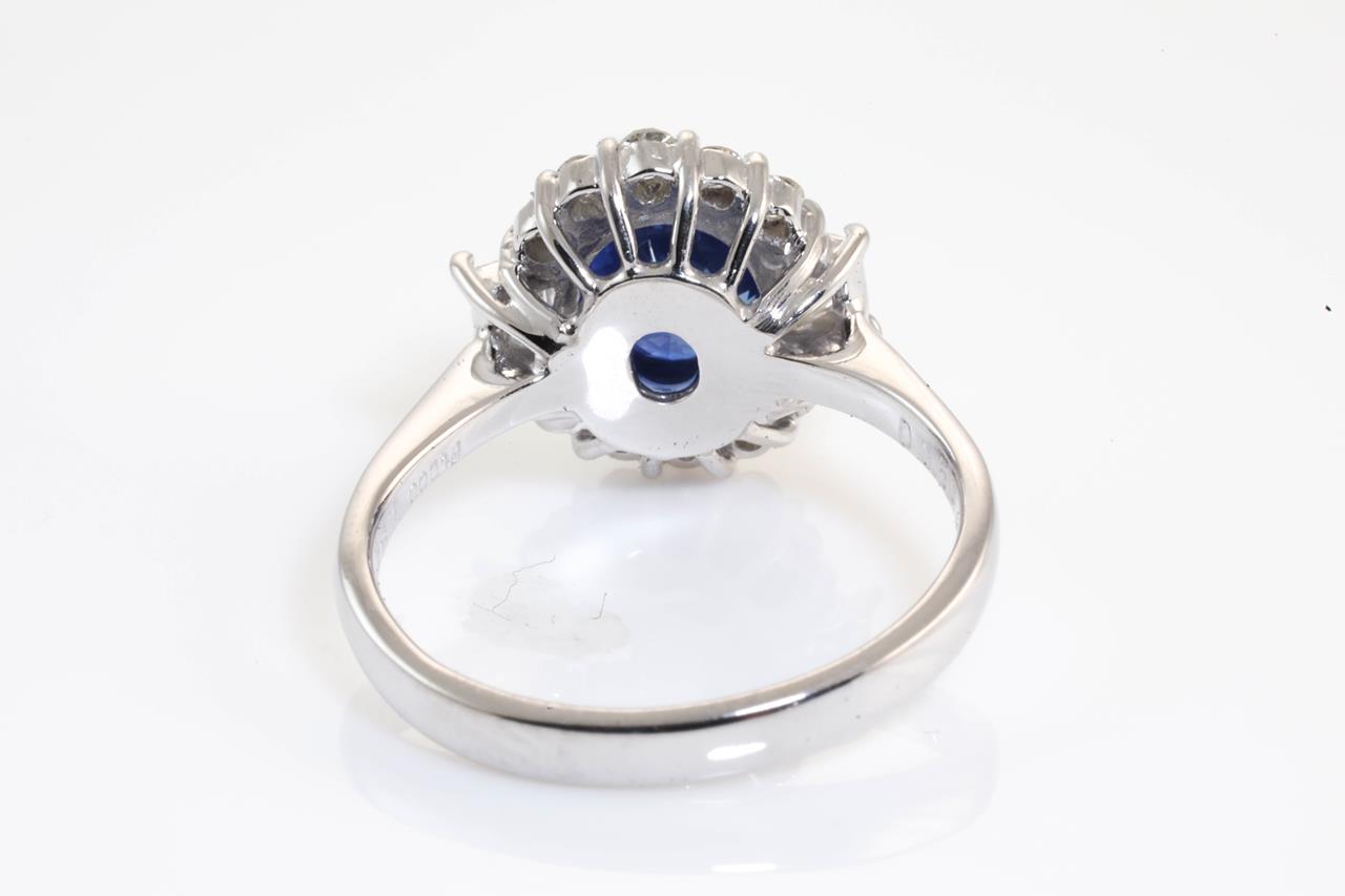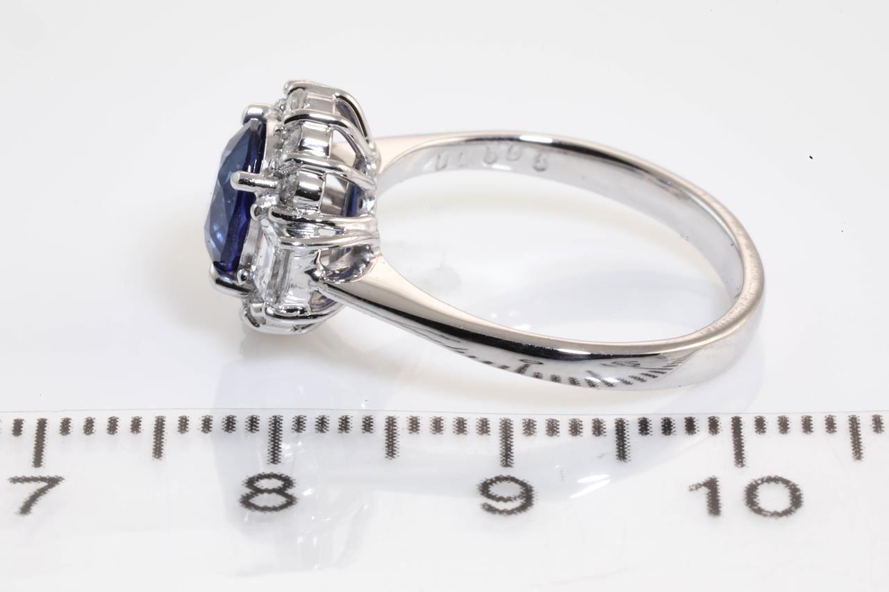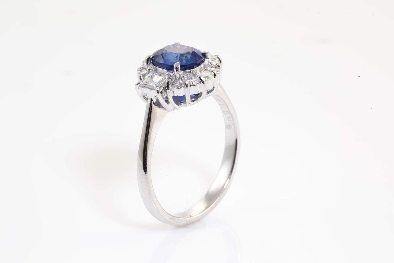 Sapphire and Diamond ring with oval blue Ceylon Sapphire of 1.90ct and Diamonds totalling 0.50cts (Estimated grading: G-H SI-P1). Platinum. Ring size: M (Note: ring should only be resized 3 sizes up or down). Weight: 6.0g (Pre-owned).