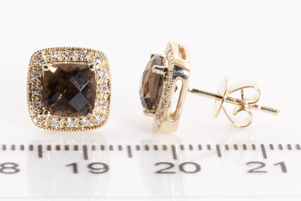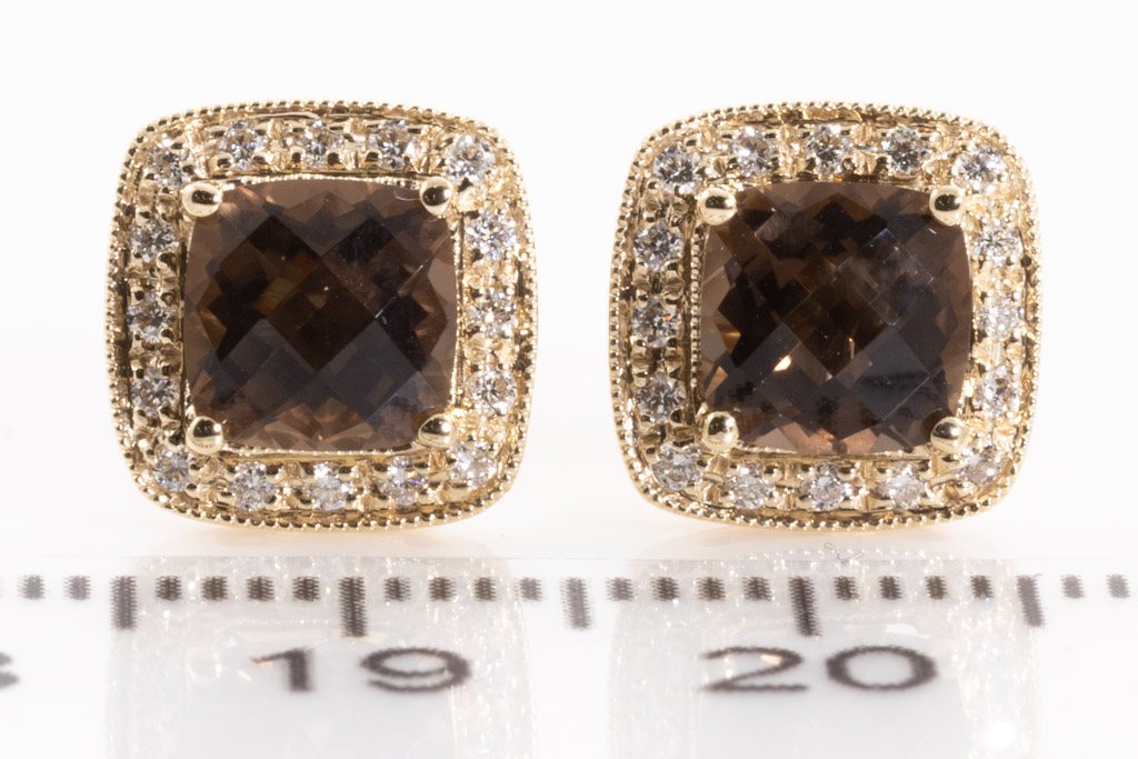 Smoky Quartz and Diamond earrings with cushion cut Smoky Quartz totalling 1.91cts and round Diamonds totalling 0.20cts. 14ct yellow gold. Weight: 2.6g. (New)