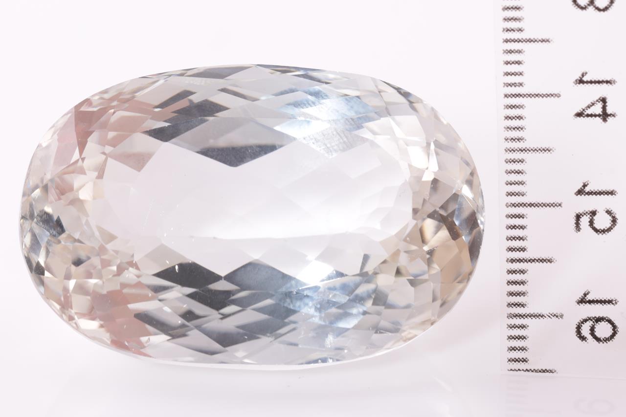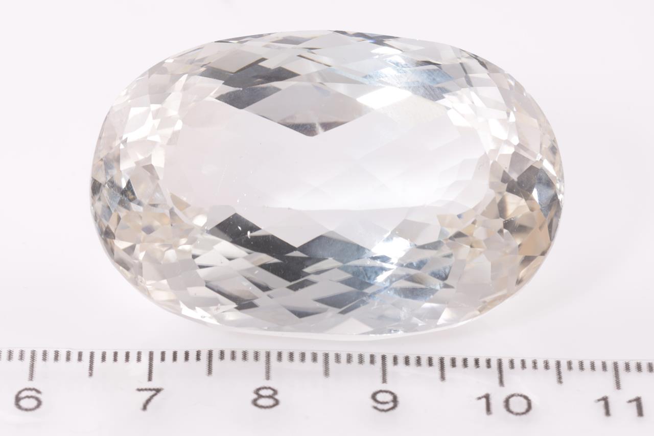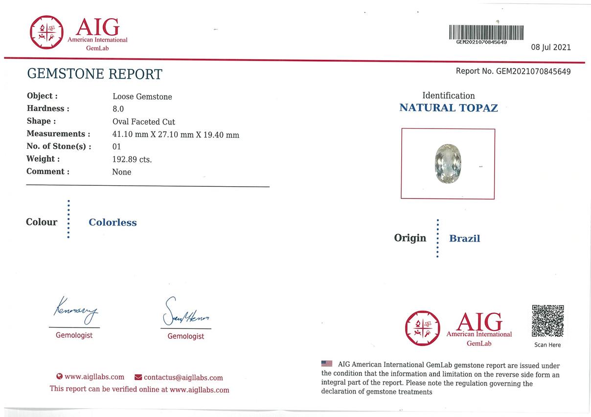 A loose oval cut Topaz of 192.89ct. Diamensions: 41.10 x 27.10 x 19.40mm. With AIG report GEM2021070845649. (As New)