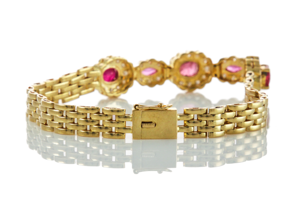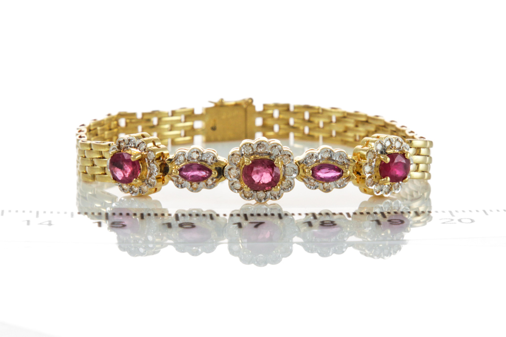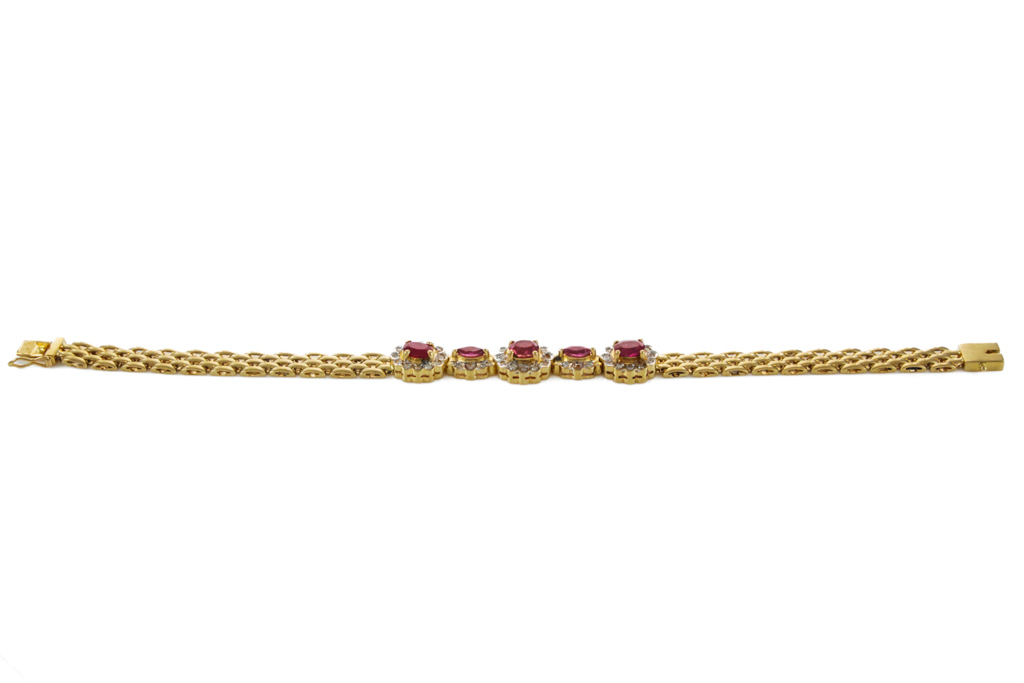 Ruby and Diamond bracelet with marquise cut and oval shape Rubies totalling 1.92cts and round Diamonds totalling 0.39cts (Estimated grading: I-K P1). 18ct yellow gold. Length: 17.0cm. Weight: 15.1g. (Pre-owned)