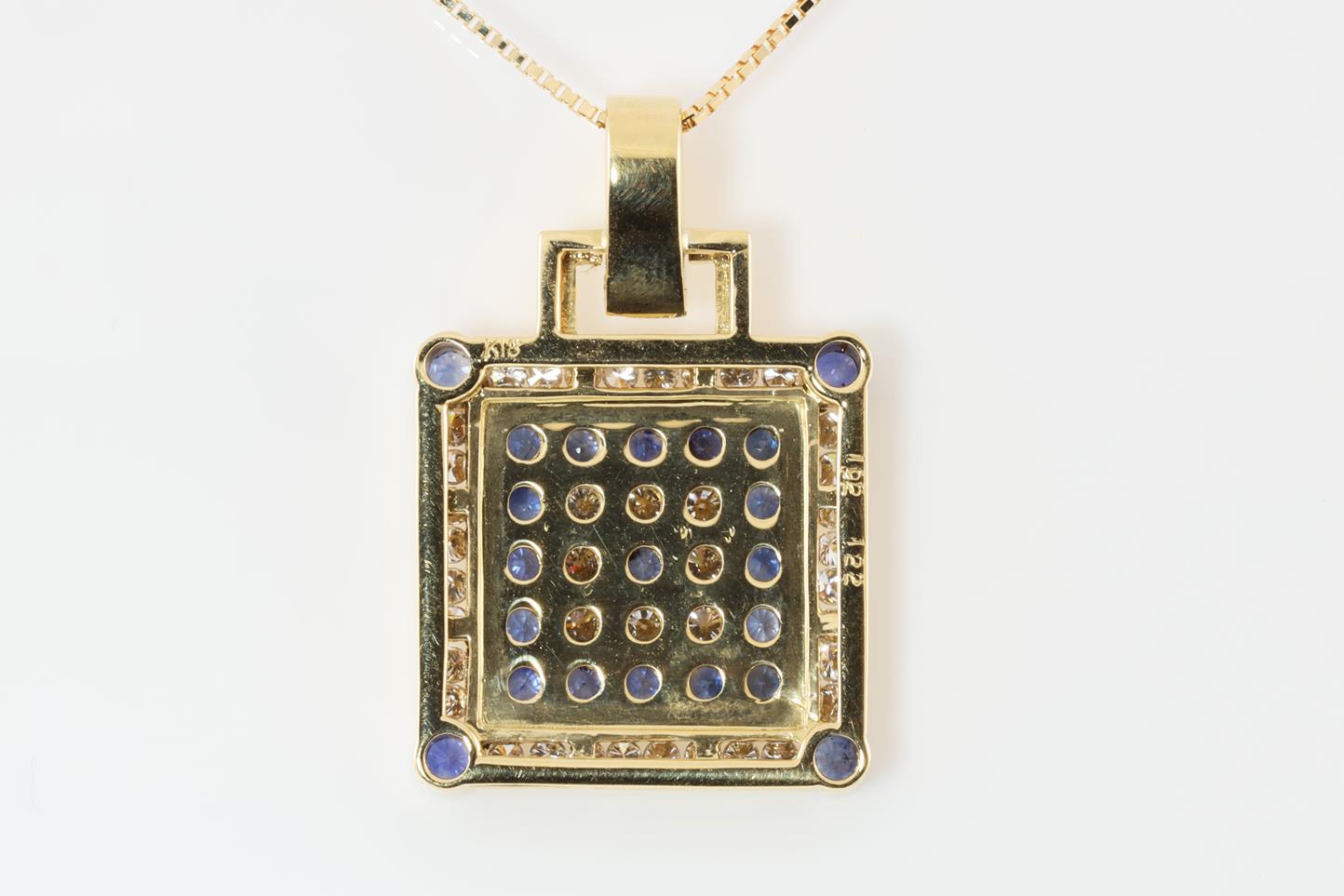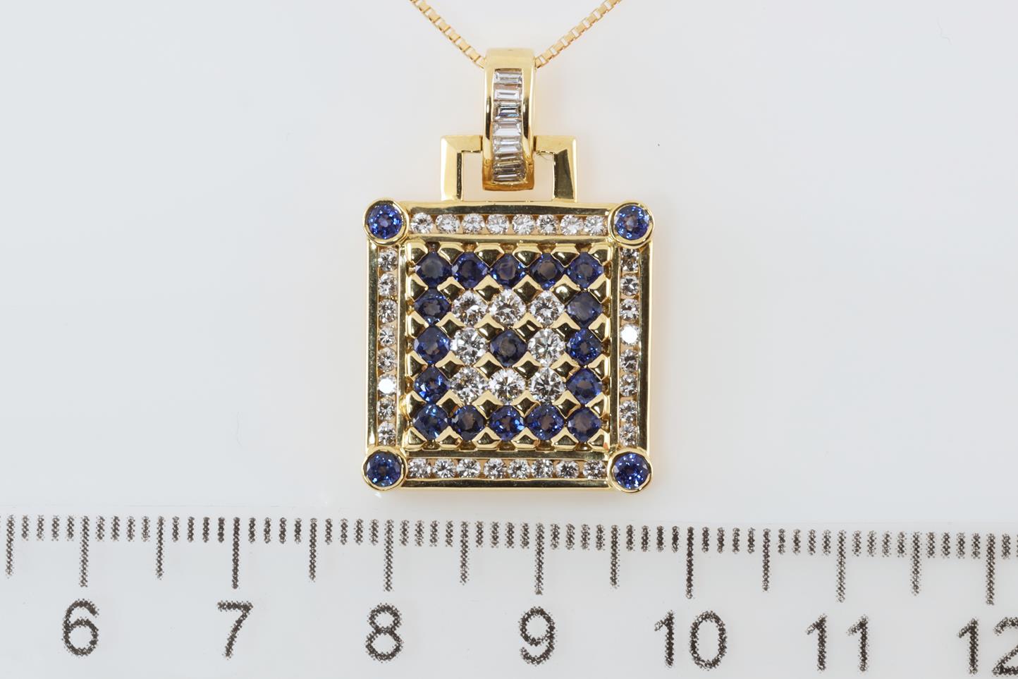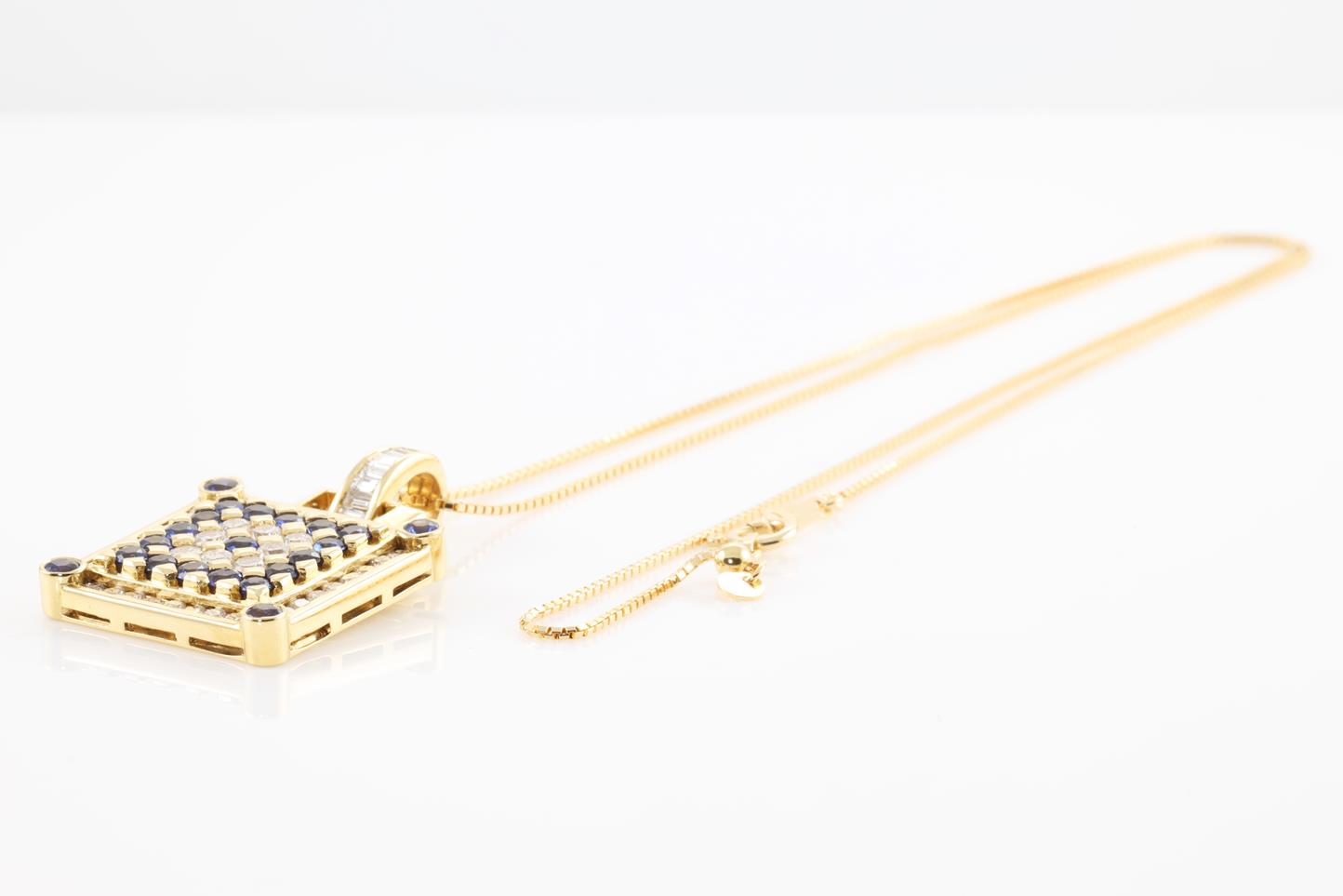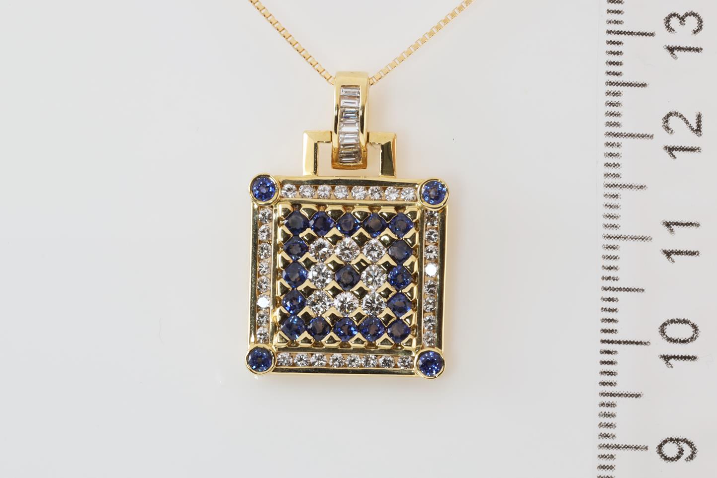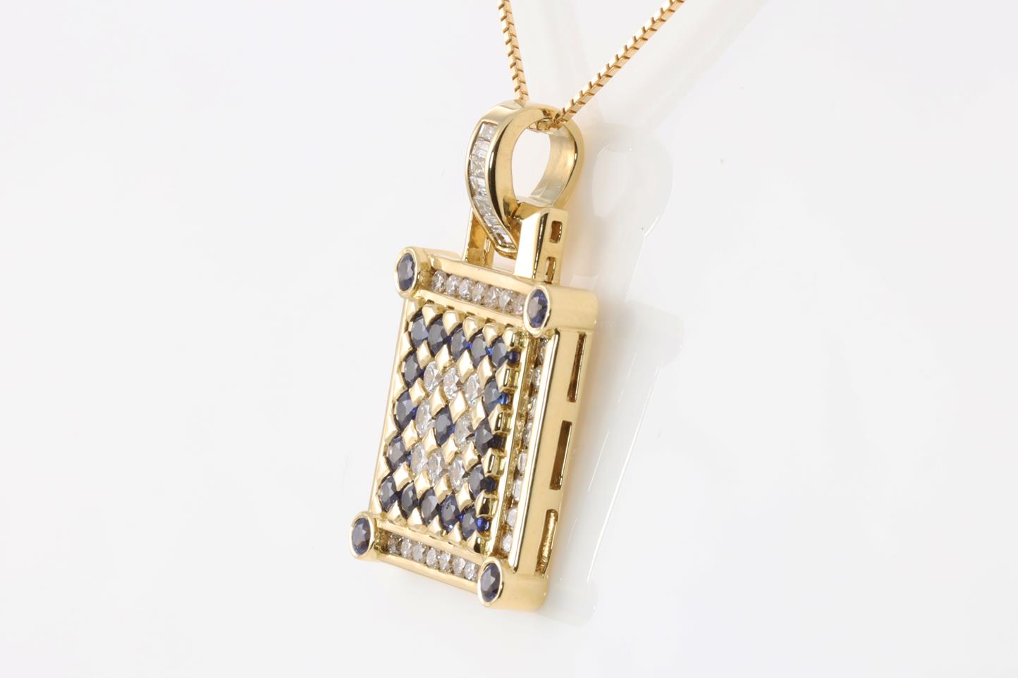 Sapphire and Diamond pendant with round Sapphires totalling 1.92cts and Diamonds totalling 1.22cts (Estimated grading: I SI). 18ct yellow gold with 18ct yellow gold 45cm adjustable chain. Weight: 11.0g (Pre-owned)