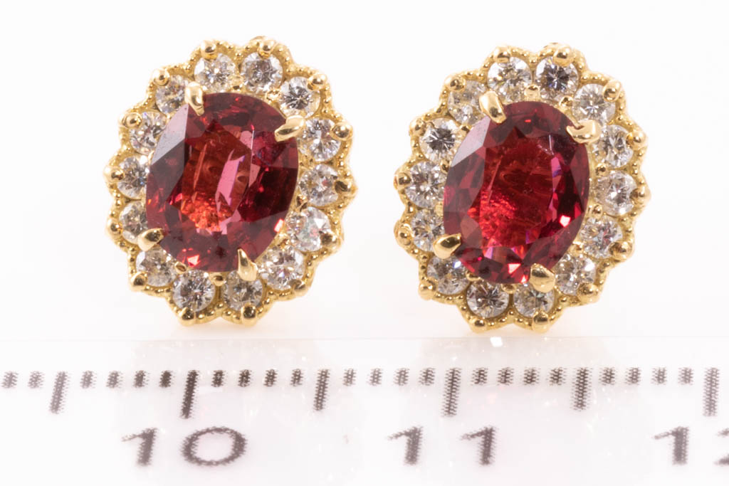 Spinel and Diamond earrings with 2 oval red Spinel totalling 1.92cts and round Diamonds totalling 0.54cts (Estimated grading: H-I VS-SI). 18ct yellow gold with 18ct yellow gold & silicon backs. Weight: 2.8g. (Pre-owned)