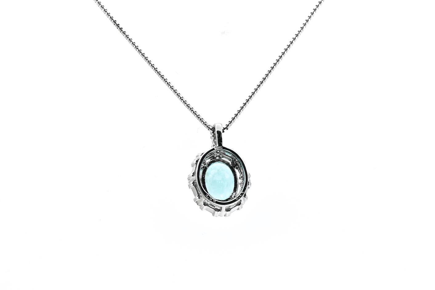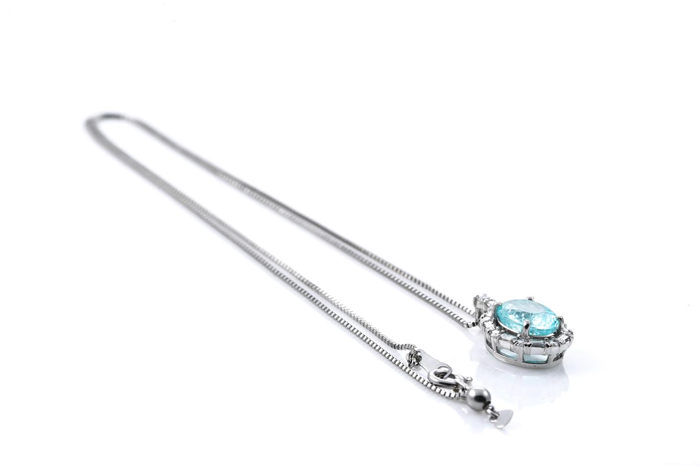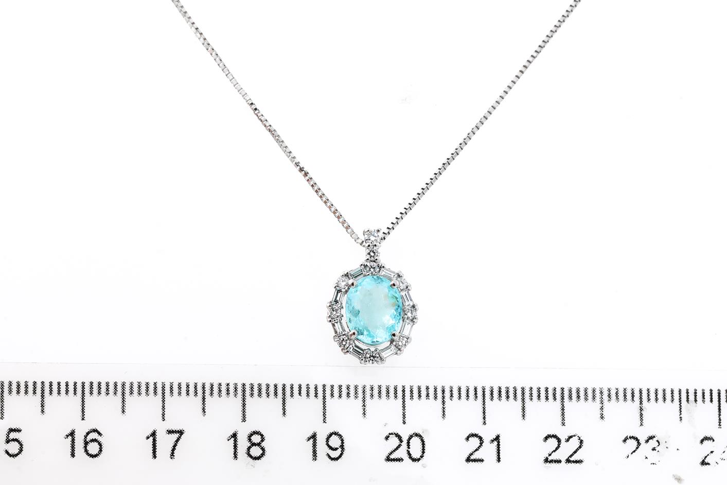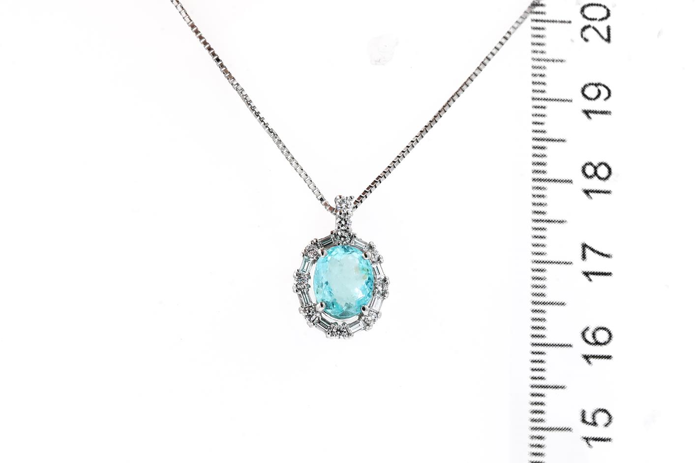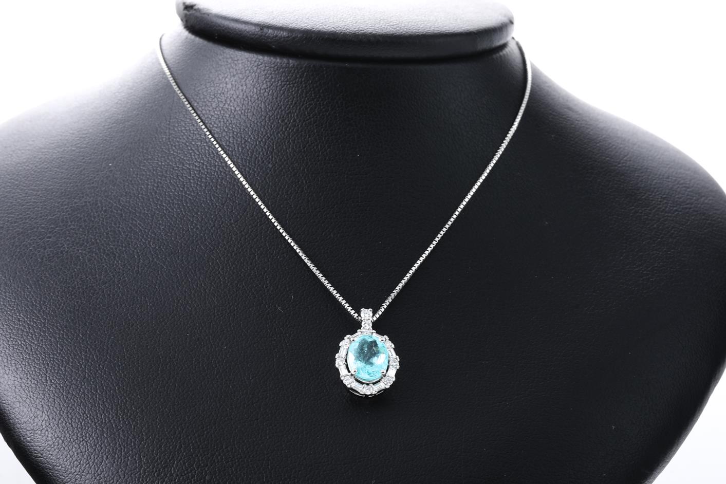 Tourmaline and Diamond pendant with an oval Paraiba Tourmaline of 1.93ct and round & baguette cut Diamonds totalling 0.41cts (Estimated grading: G-H VS). Platinum with adjustable 45cm platinum chain. Weight: 9.1g. With certificate #415921. (Pre-owned)