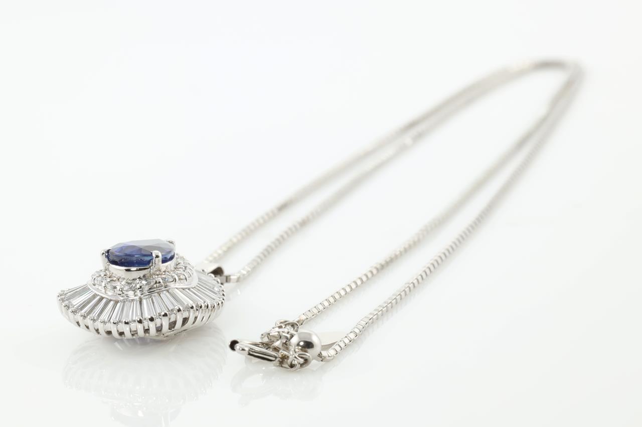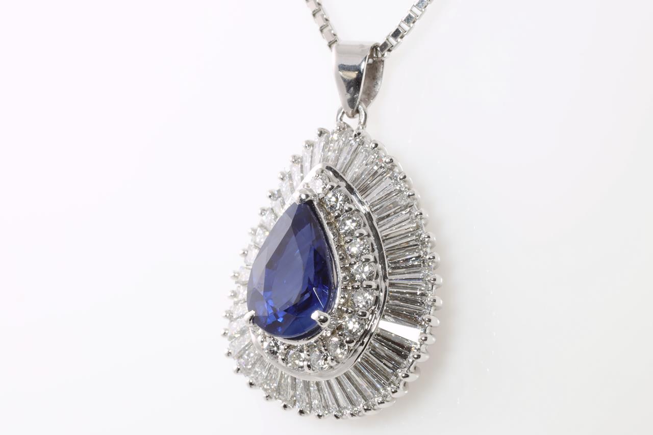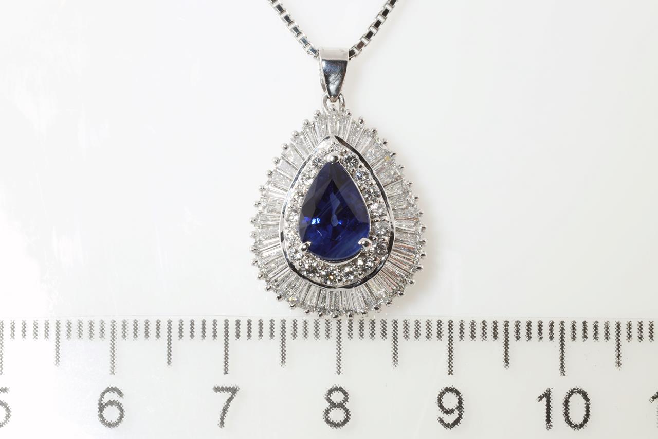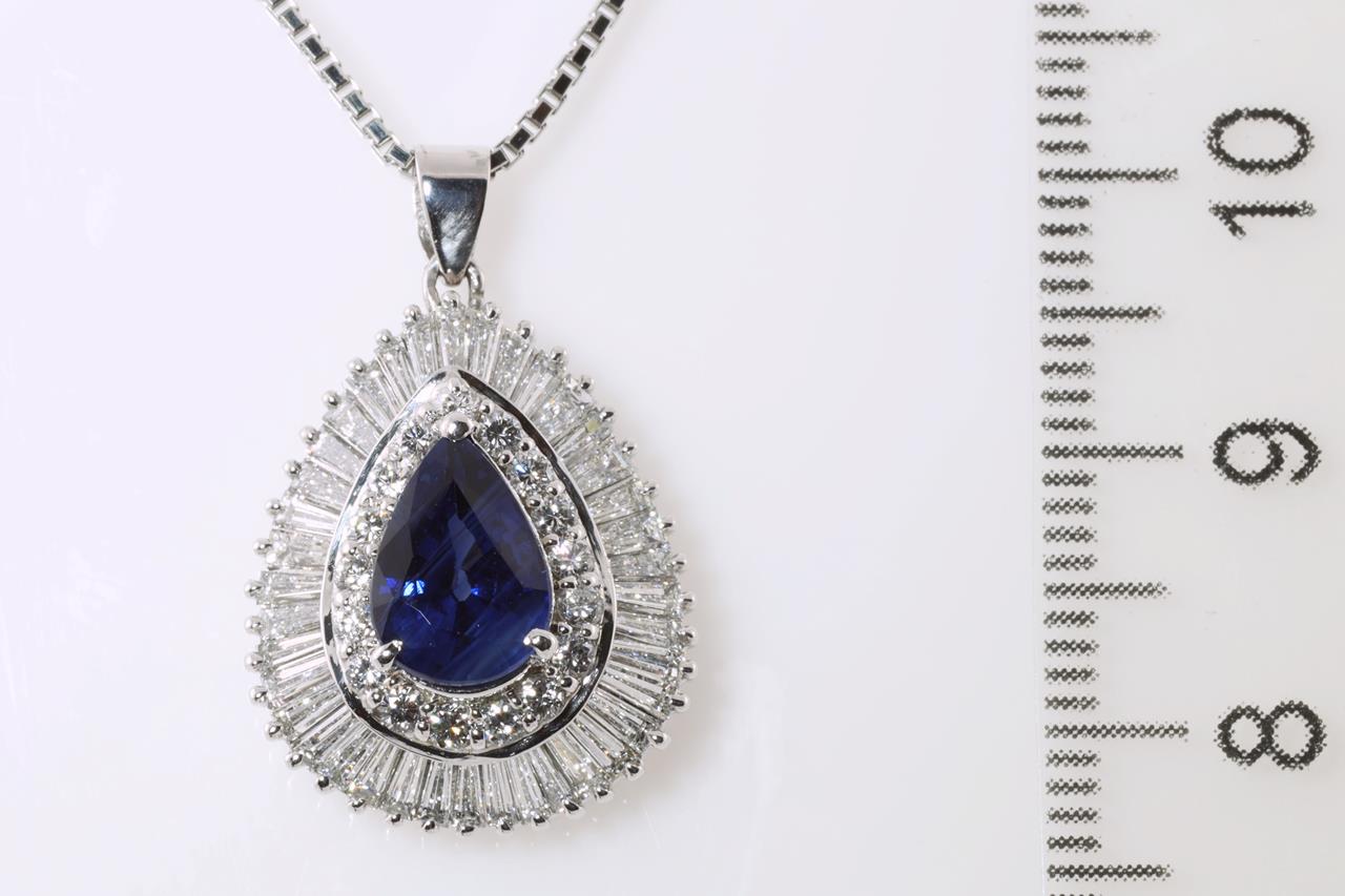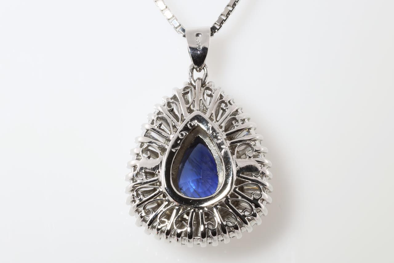 Sapphire and Diamond pendant with pear shape Sapphire of 1.93ct and Diamonds totalling 1.37cts (Estimated grading: G VS). Platinum with platinum 45cm adjustable chain. Weight: 10.6g (Pre-owned)