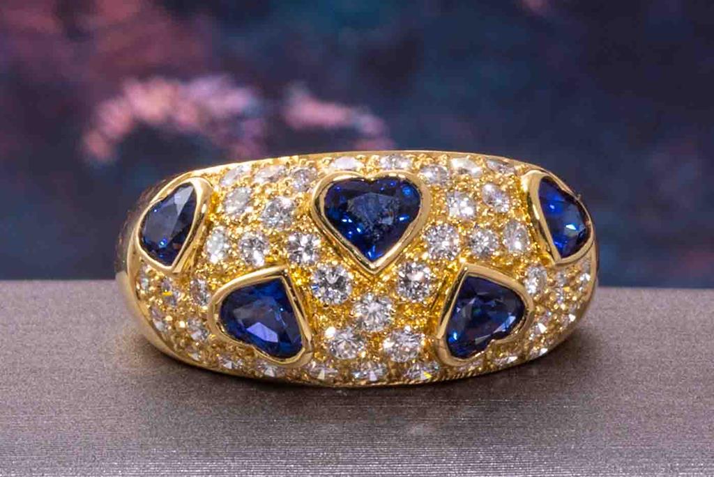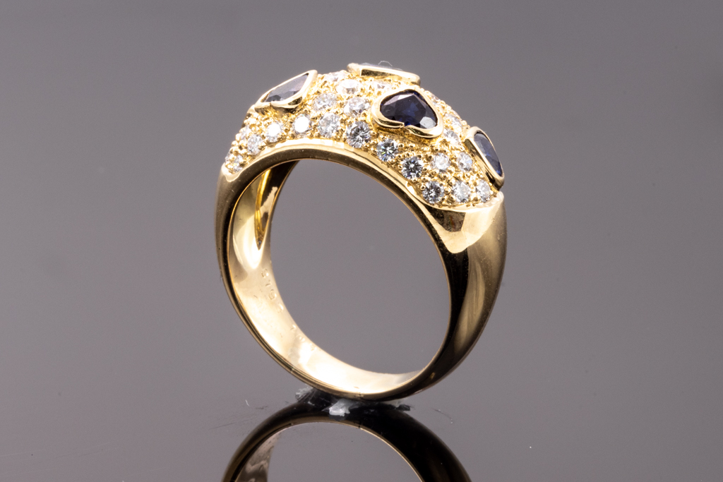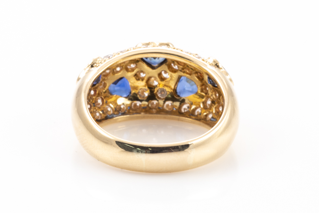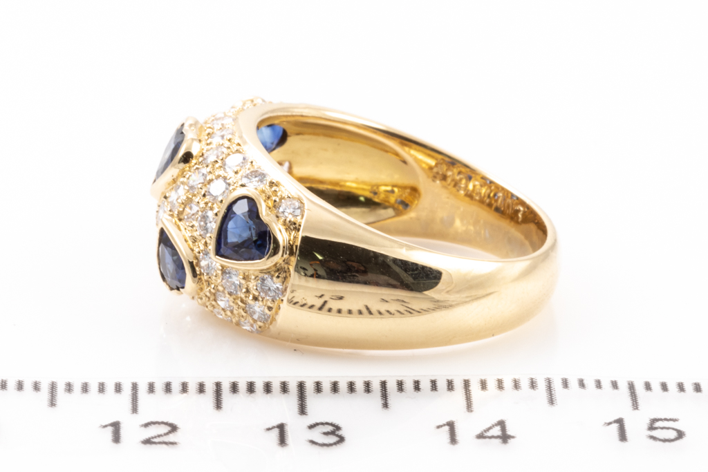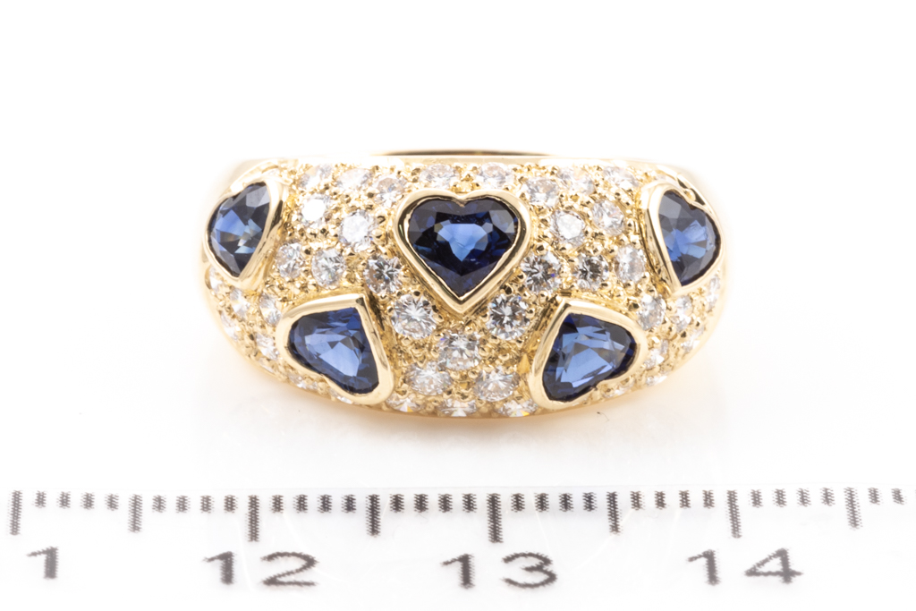 Sapphire and Diamond ring with 5 heart shape blue Sapphires totalling 1.93cts and round Diamonds totalling 1.03cts (Estimated grading: G-H SI). 18ct yellow gold. Ring size Q1/2 - ring resizing is not recommended. Weight: 10g. (Pre-owned)
