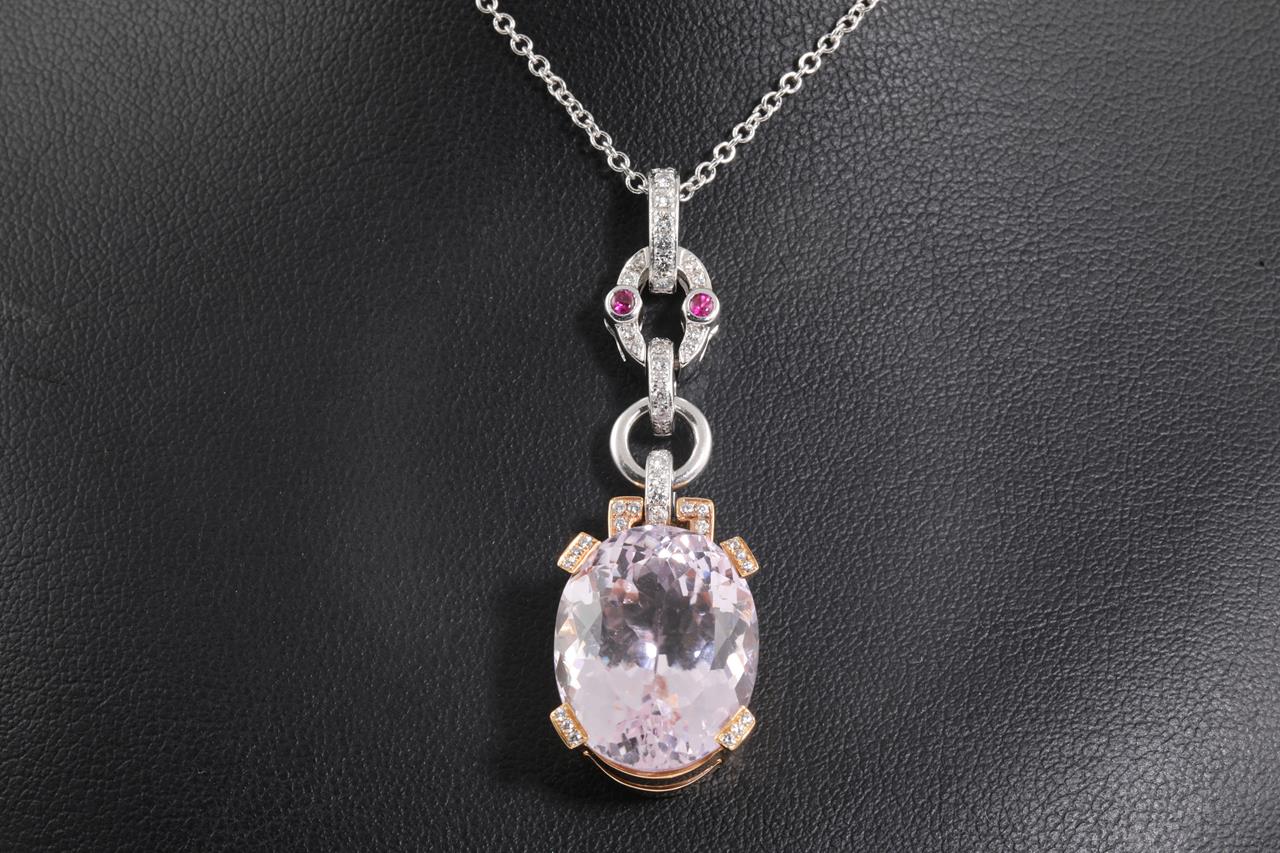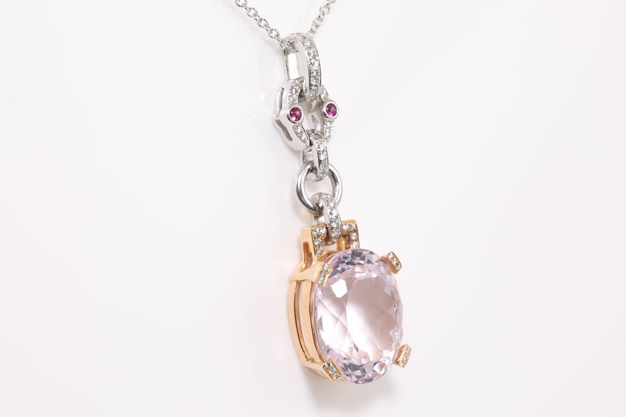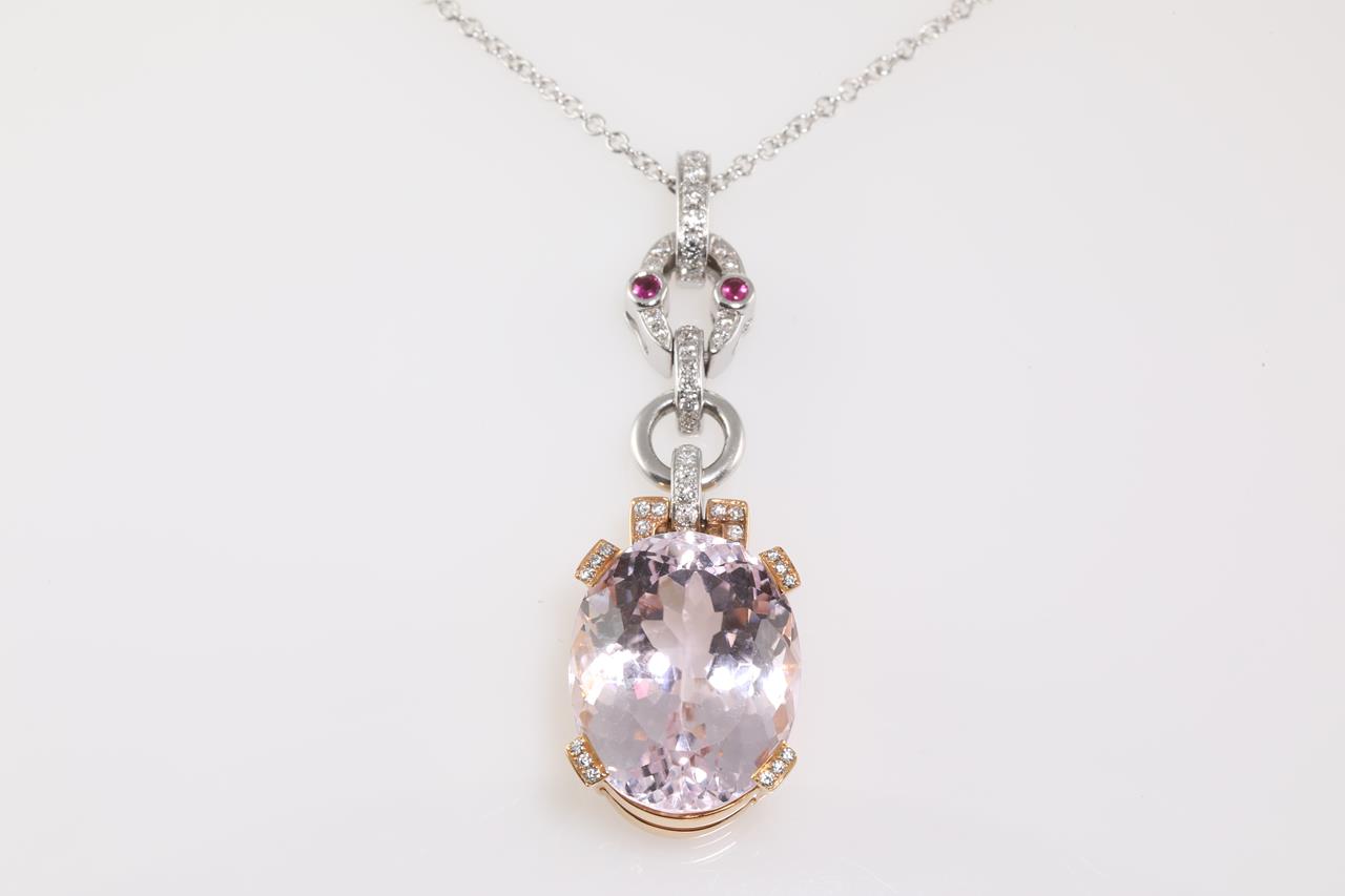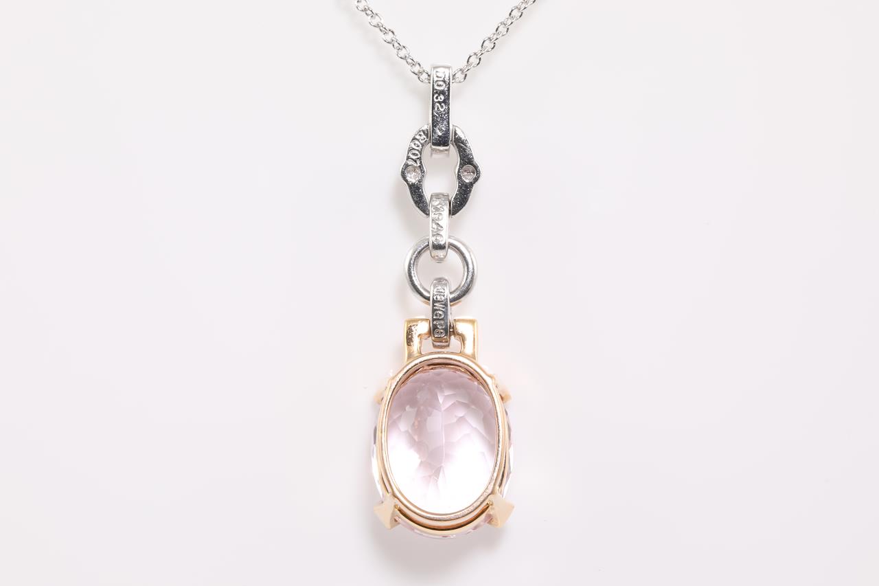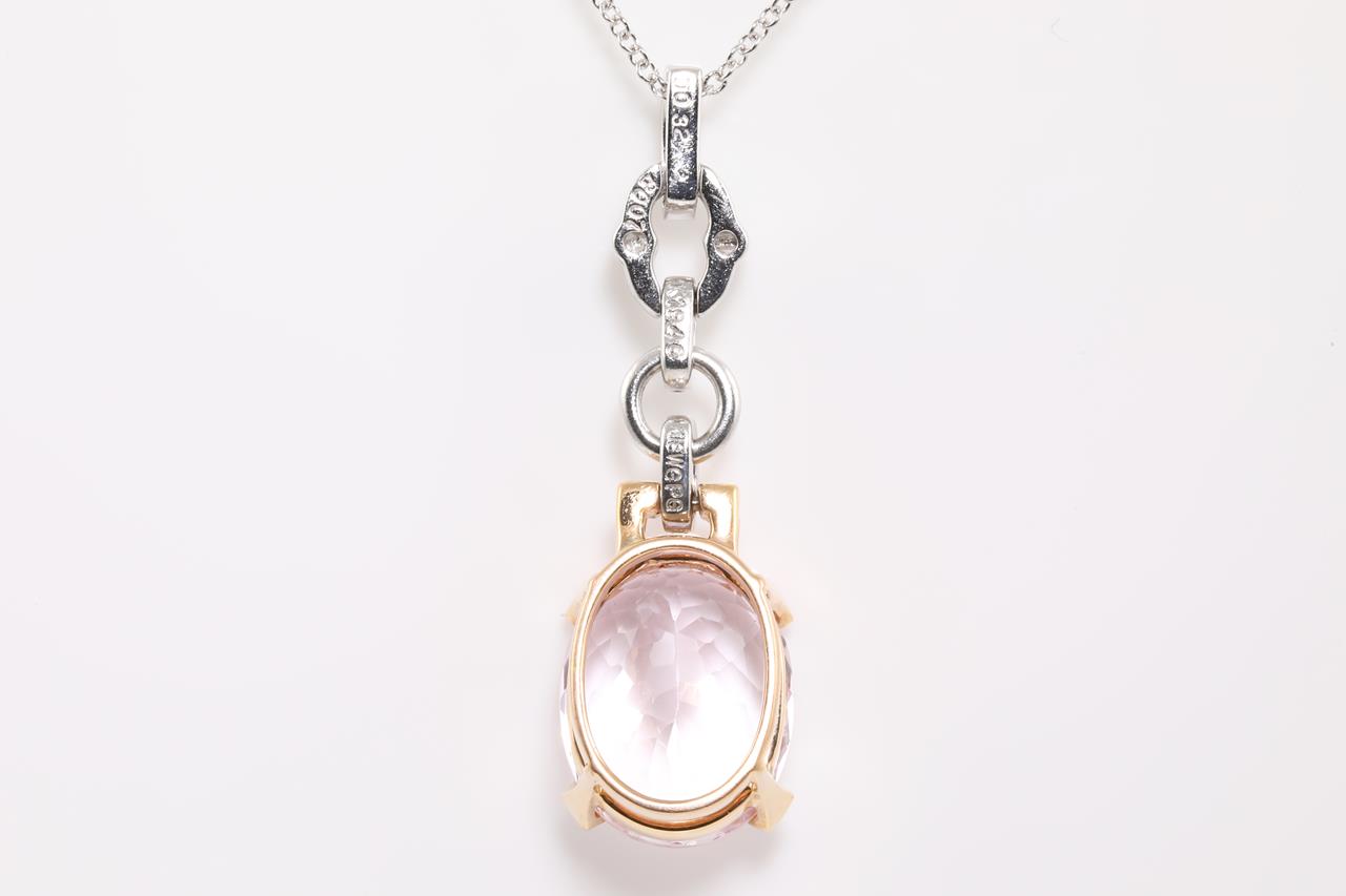 Kunzite and Diamond pendant with oval shape Kunzite of 19.46ct and Diamonds totalling 0.32cts (Estimated grading: I-J SI). 18ct white and rose gold with 45cm 18ct gold chain. Weight: 14.9g (Pre-owned)