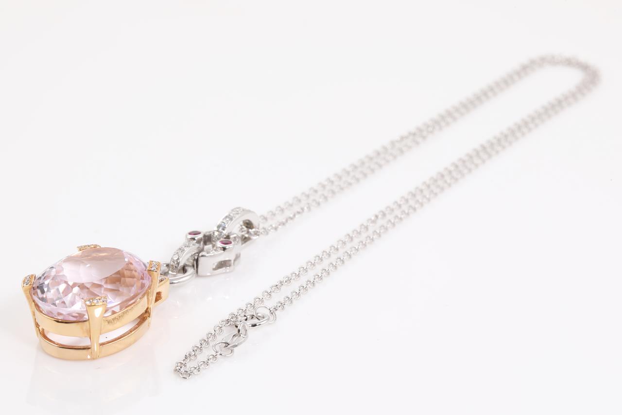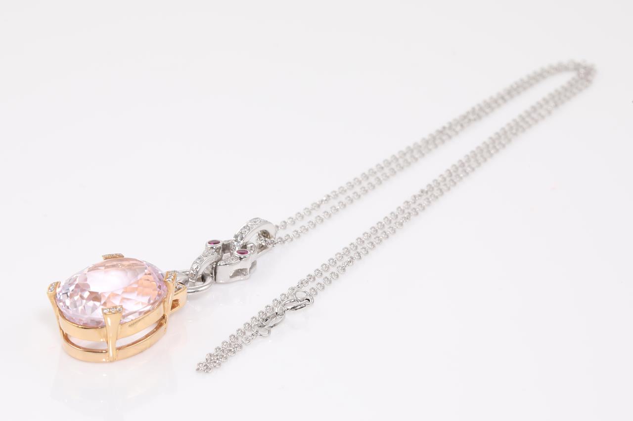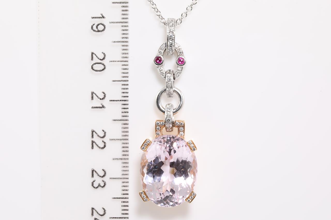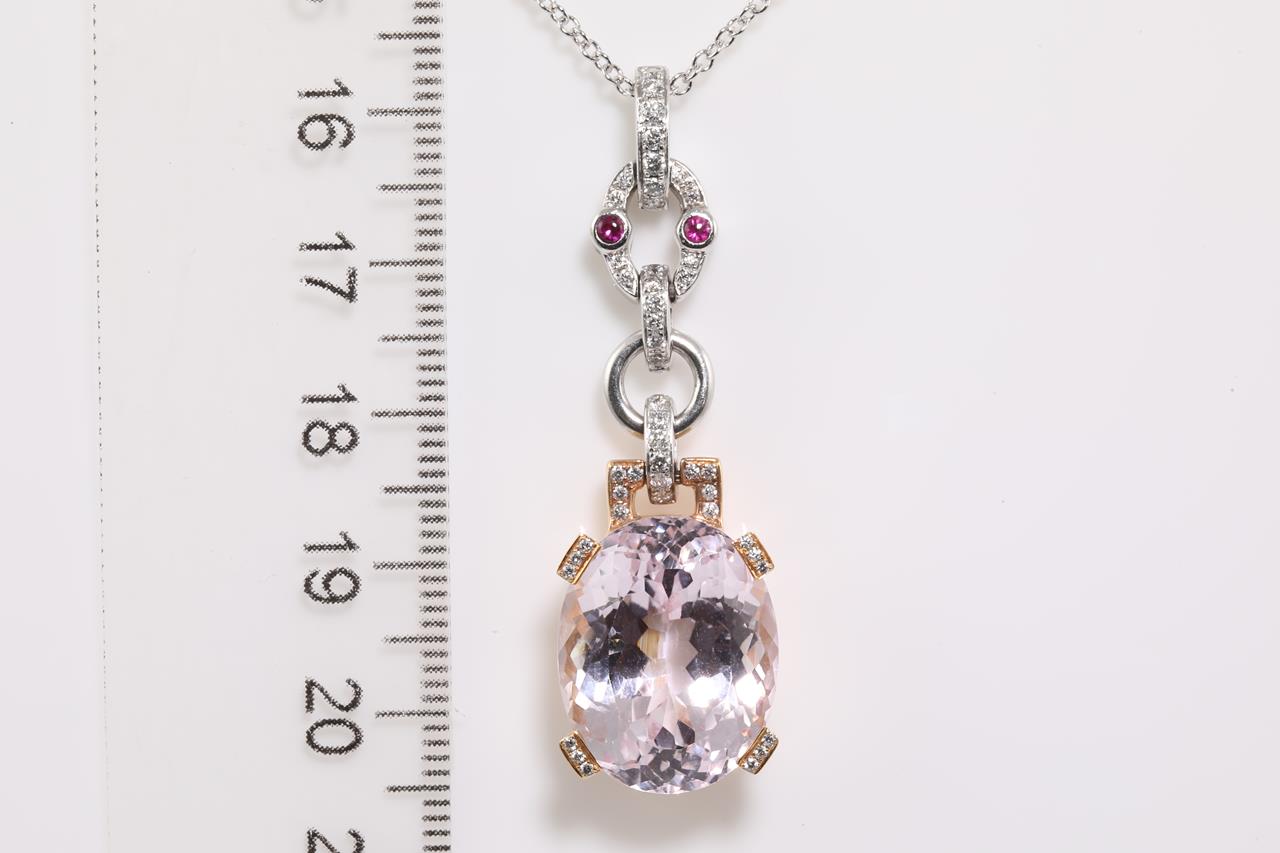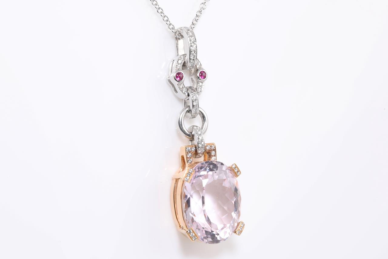 Kunzite and Diamond pendant with oval shape Kunzite of 19.46ct and Diamonds totalling 0.32cts (Estimated grading: I-J SI). 18ct white and rose gold with 45cm 18ct gold chain. Weight: 14.9g (Pre-owned)