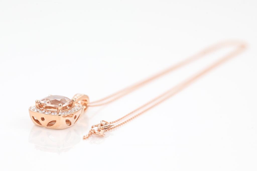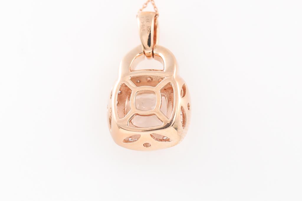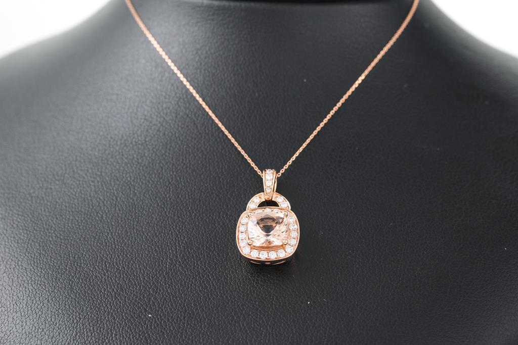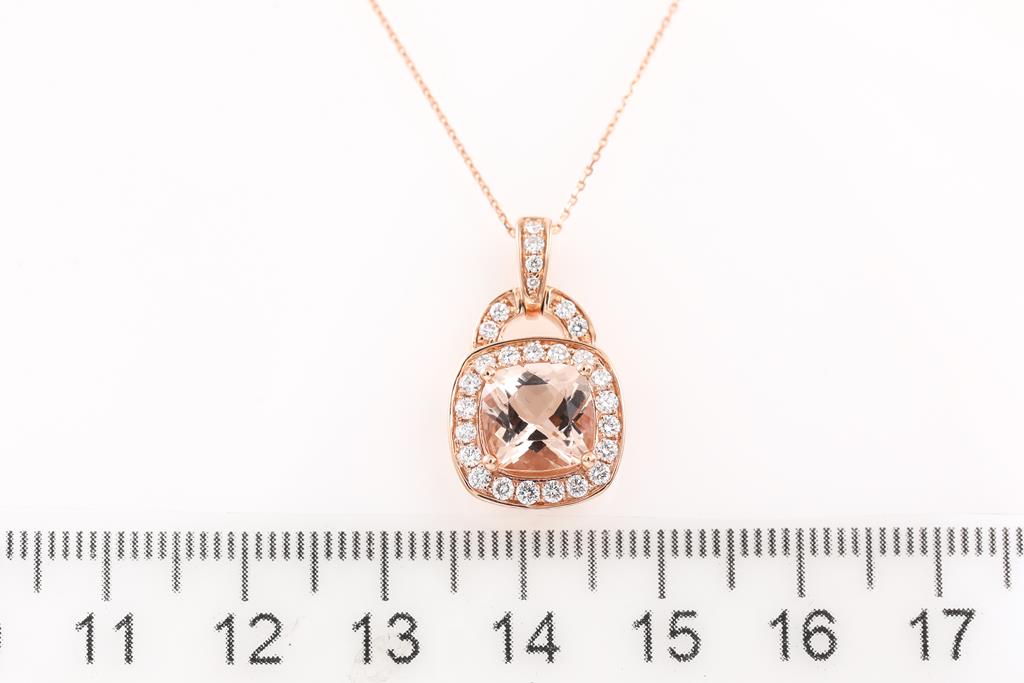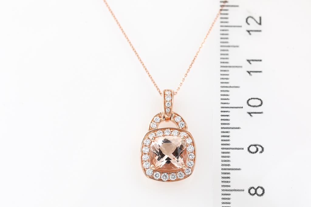 Morganite and Diamond pendant with cushion cut Morganite of 1.94ct and round Diamonds totalling 0.40cts (Estimated grading: G-H SI). 14ct rose gold with 45cm chain. Weight: 4.4g (Pre-owned)