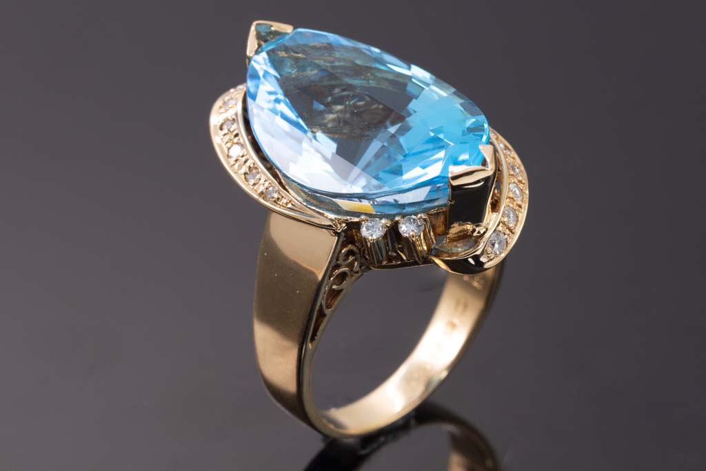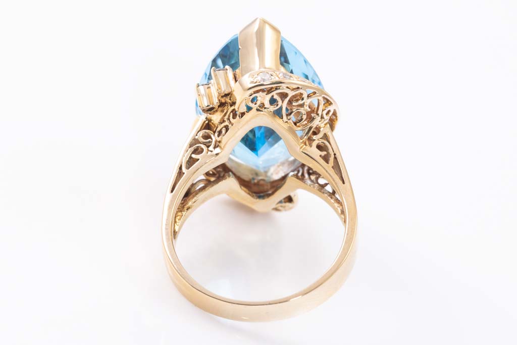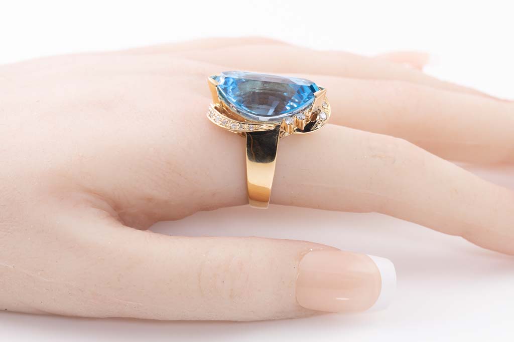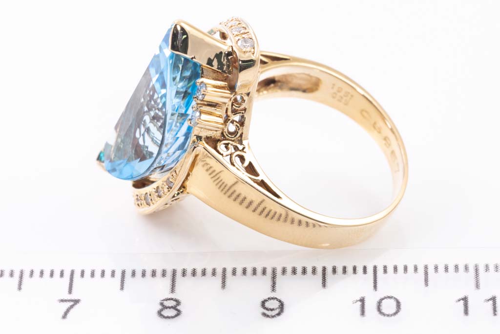 Topaz and Diamond ring with fancy cut blue Topaz of 19.51ct and Diamonds totalling 0.25cts. 18ct yellow gold. Ring size O1/2. Weight: 13.9g. (Pre-owned)