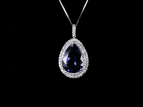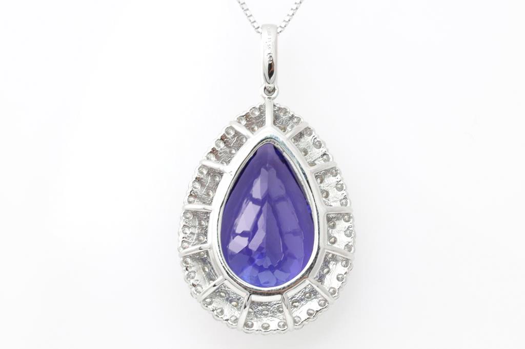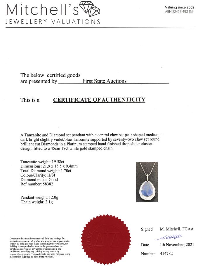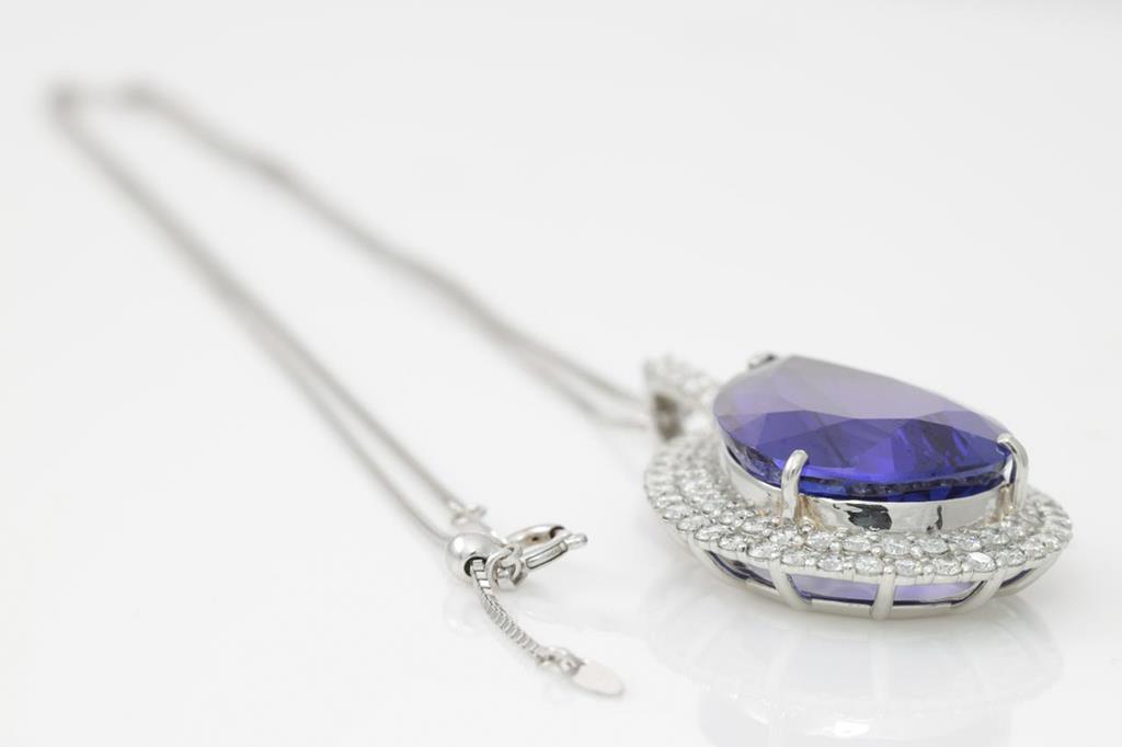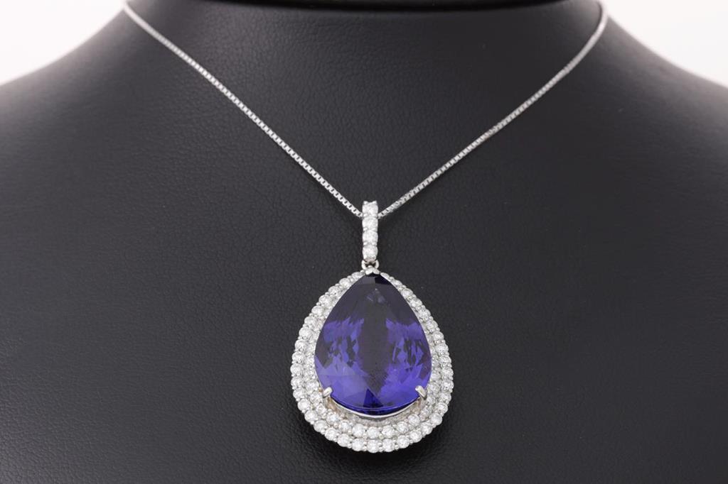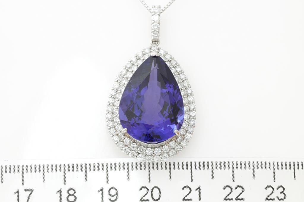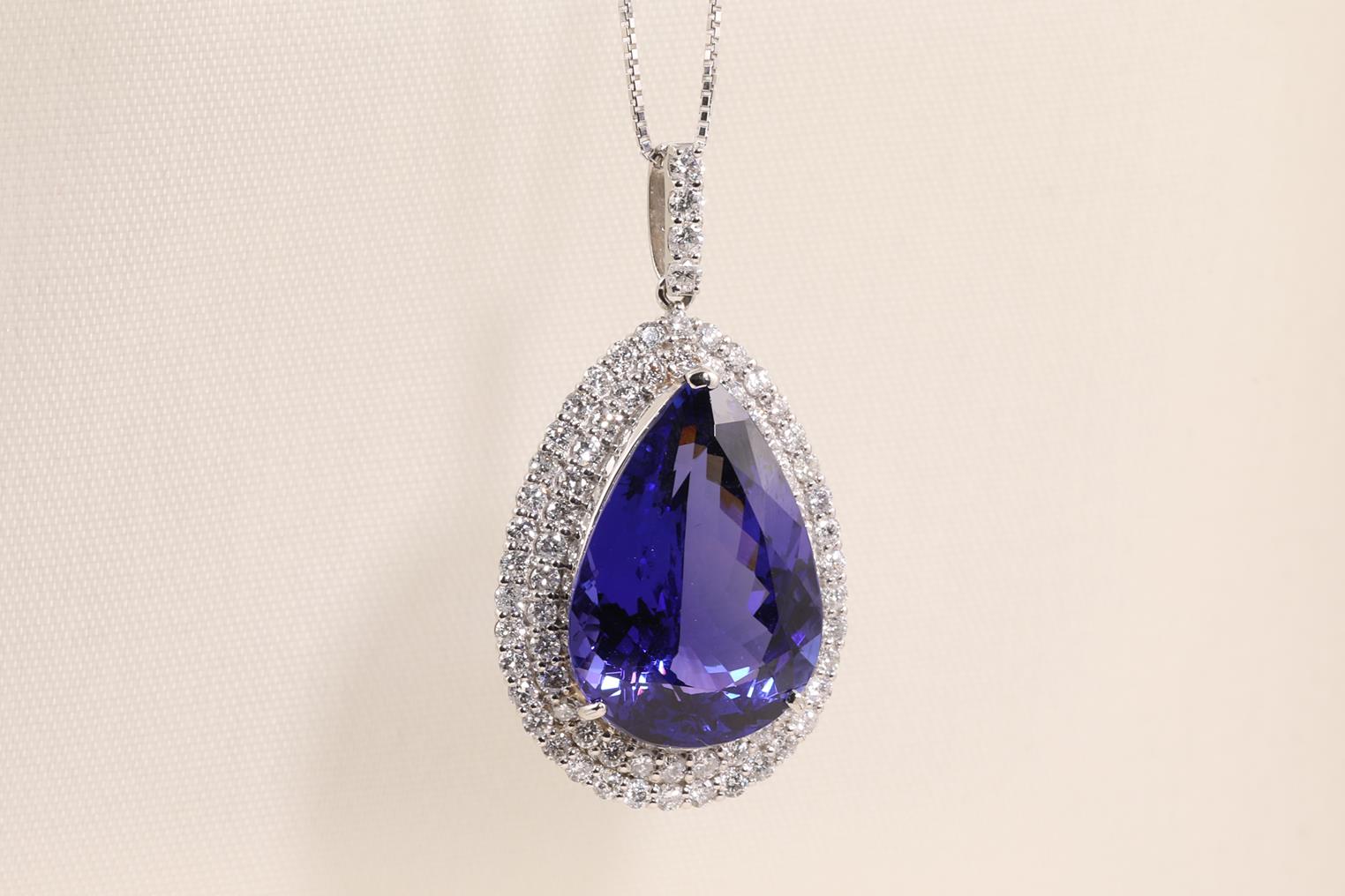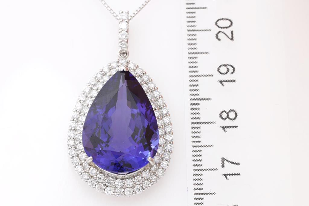 Tanzanite and Diamond pendant with a pear shape Tanzanite of 19.58ct and Diamonds totalling 1.70cts (Estimated grading: H SI). Platinum with 18ct white gold 45cm adjustable chain. Weight: 14.1g. With certificate #414782. (Pre-owned)