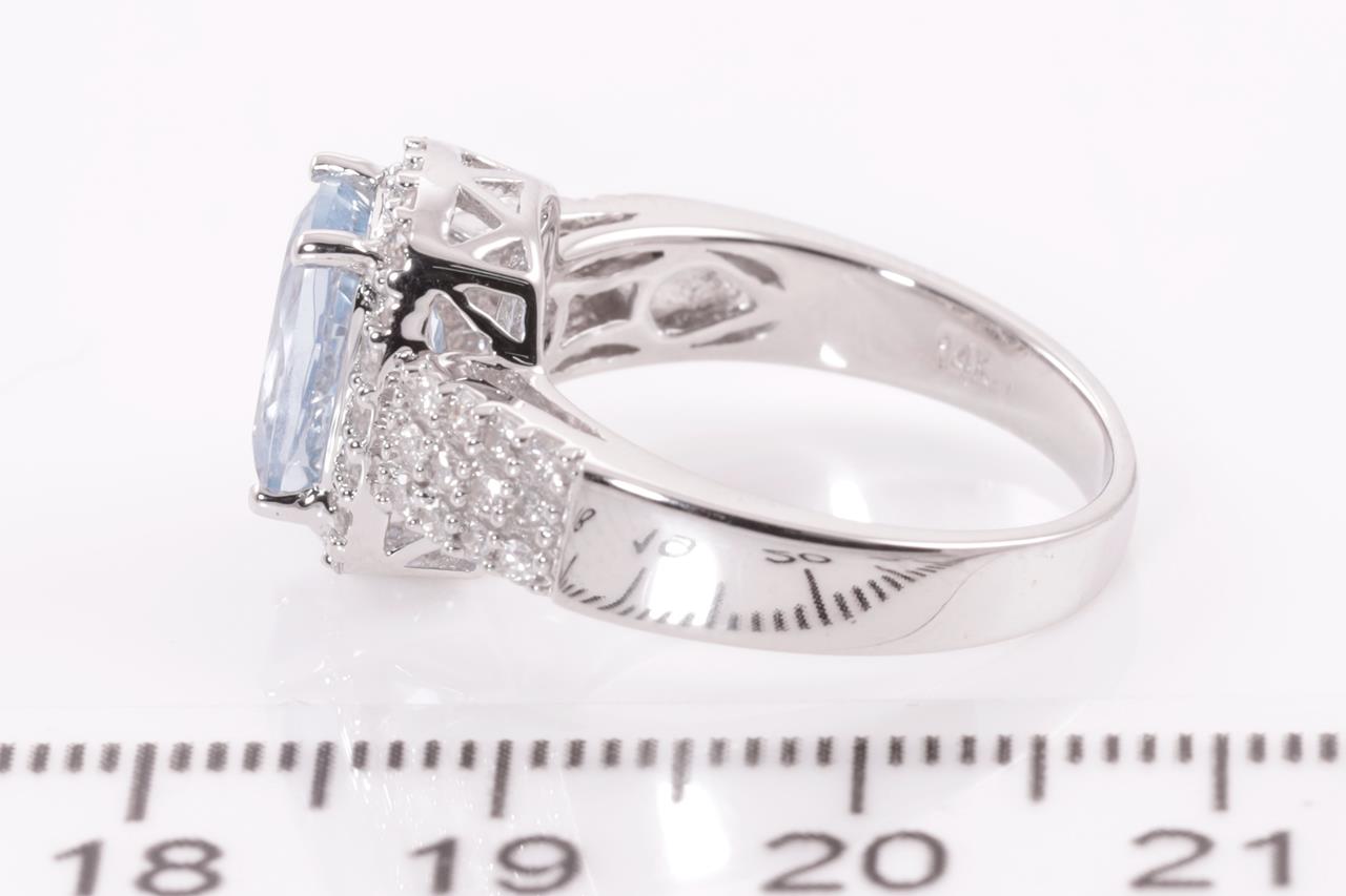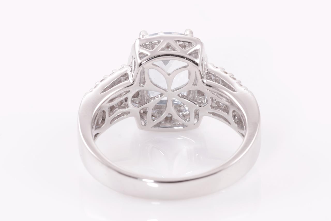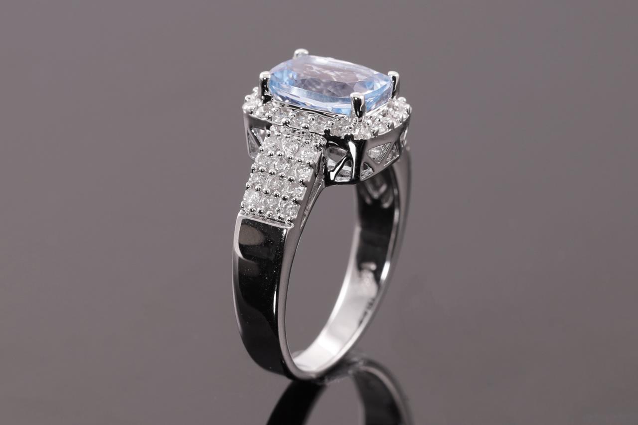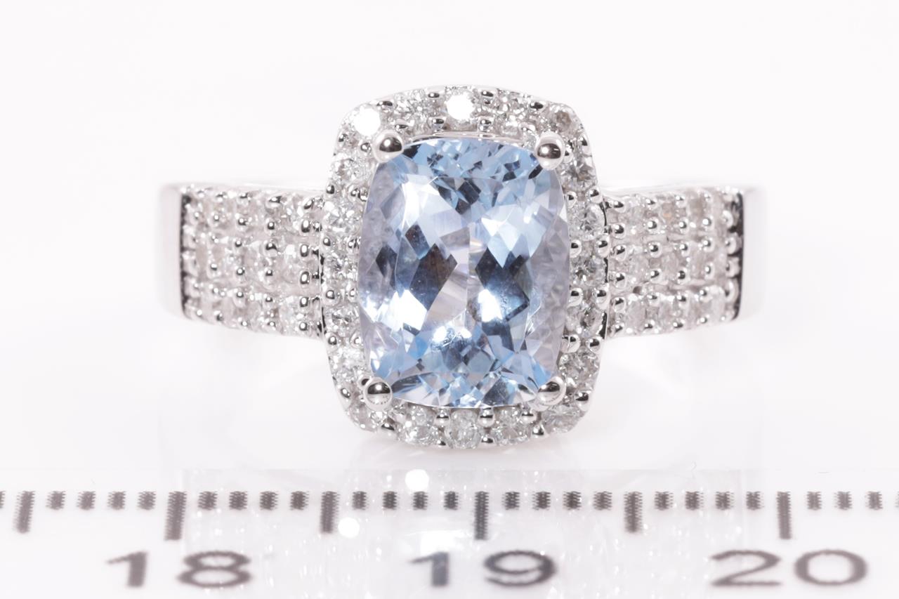 Aquamarine and Diamond Ring with cushion cut Aquamarine of 1.95cts and round Diamonds totalling 0.66cts (Estimated grading: H SI2-P1). 14ct white gold. Size: N1/2. Weight: 5.9g. (As new)