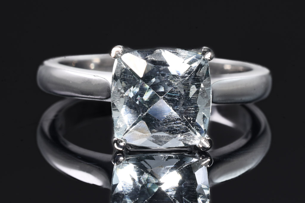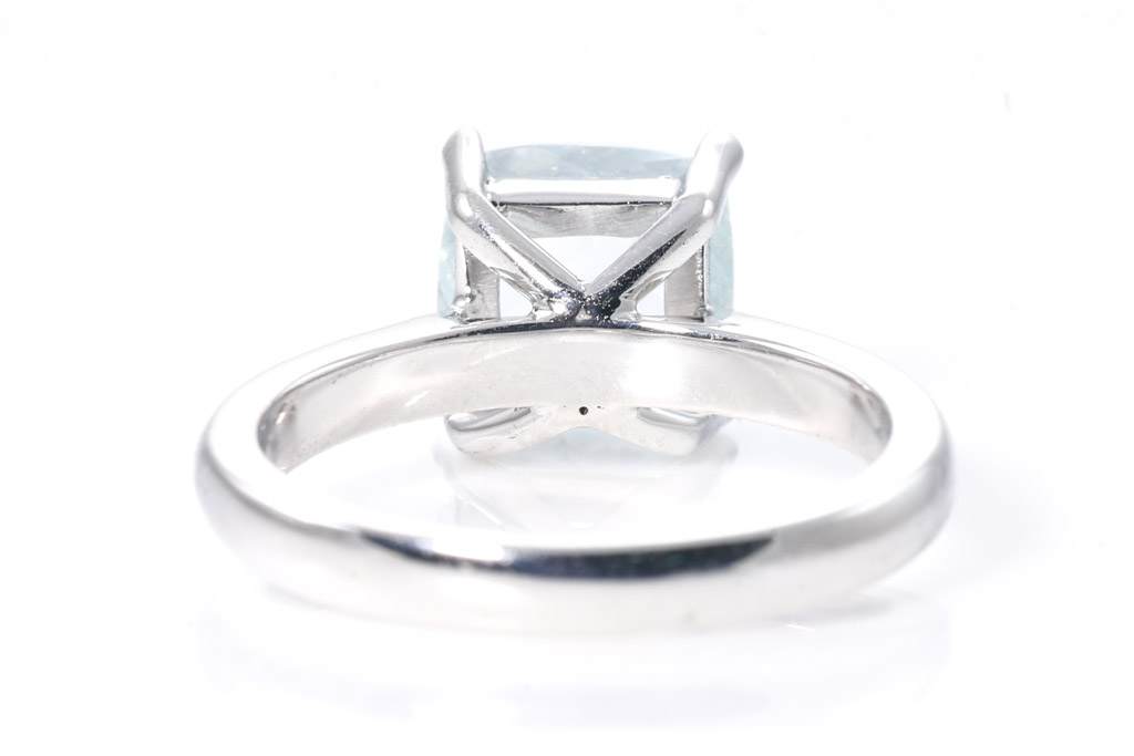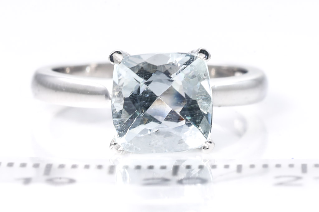 Aquamarine ring with centre cushion cut Aquamarine of 1.95cts. 18ct white gold ring. Ring Size K1/2. Weight 5.0g (New)