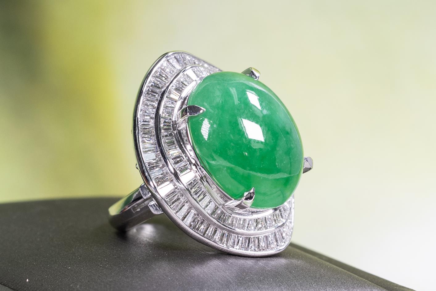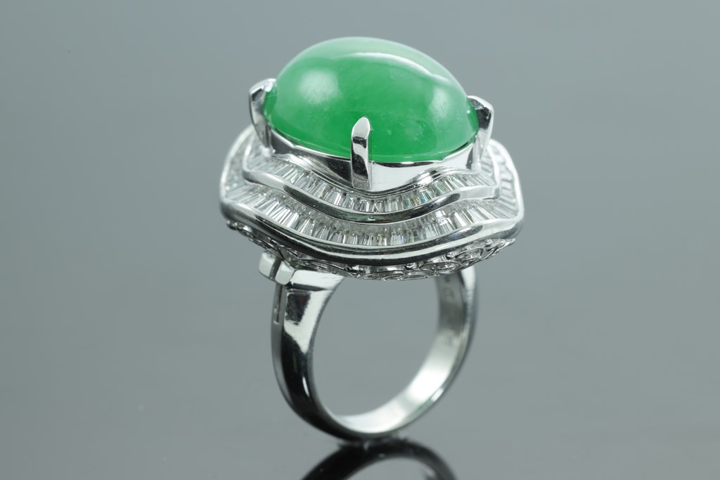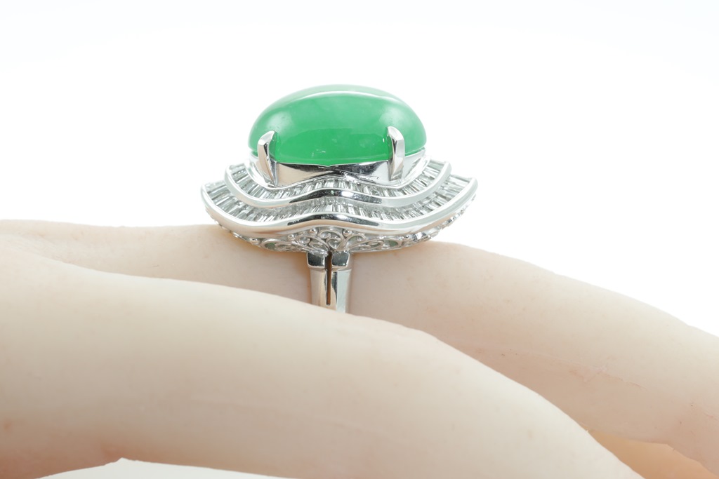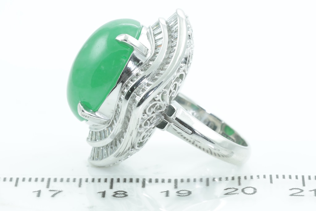 Jade and Diamond Ring with an oval cabochon cut natural Type A green Jadiete Jade of 19.68ct and baguette cut Diamonds totalling 2.45cts (Estimated grading: I-J VS). Platinum. Ring size G. Weight: 24.2g. With Certificate #415529. (Pre-owned)