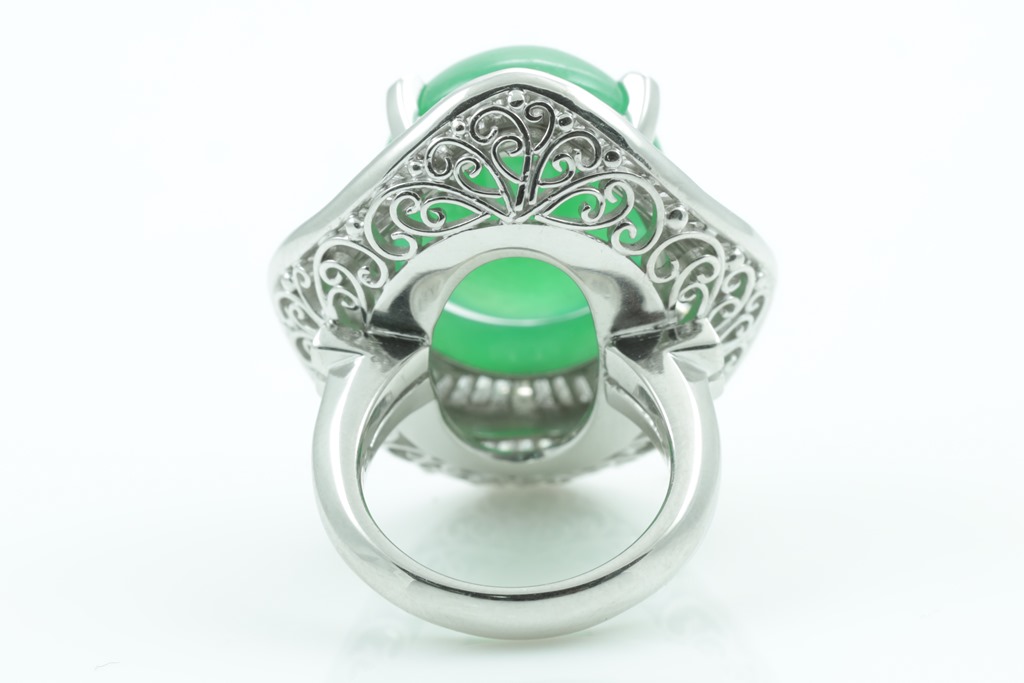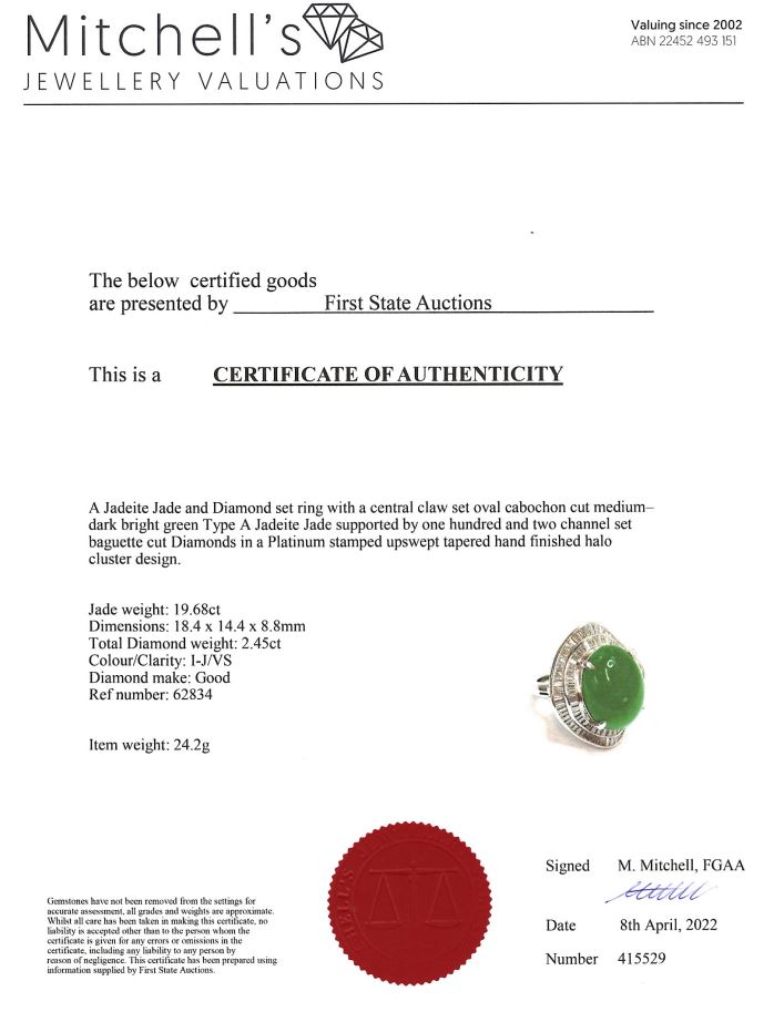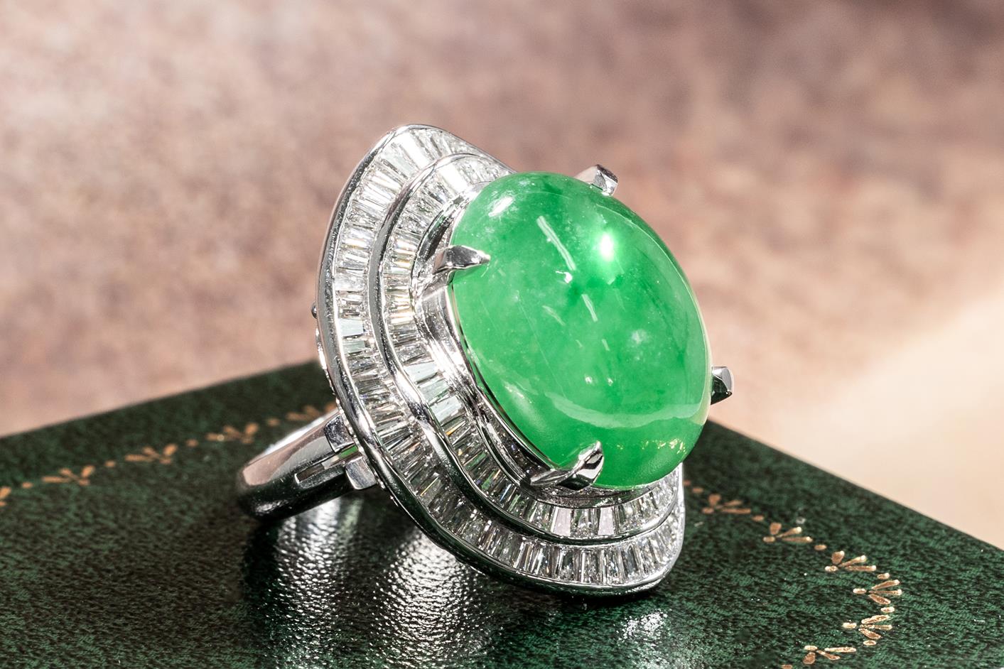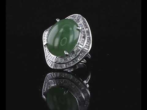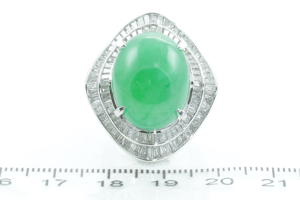 Jade and Diamond Ring with an oval cabochon cut natural Type A green Jadiete Jade of 19.68ct and baguette cut Diamonds totalling 2.45cts (Estimated grading: I-J VS). Platinum. Ring size G. Weight: 24.2g. With Certificate #415529. (Pre-owned)