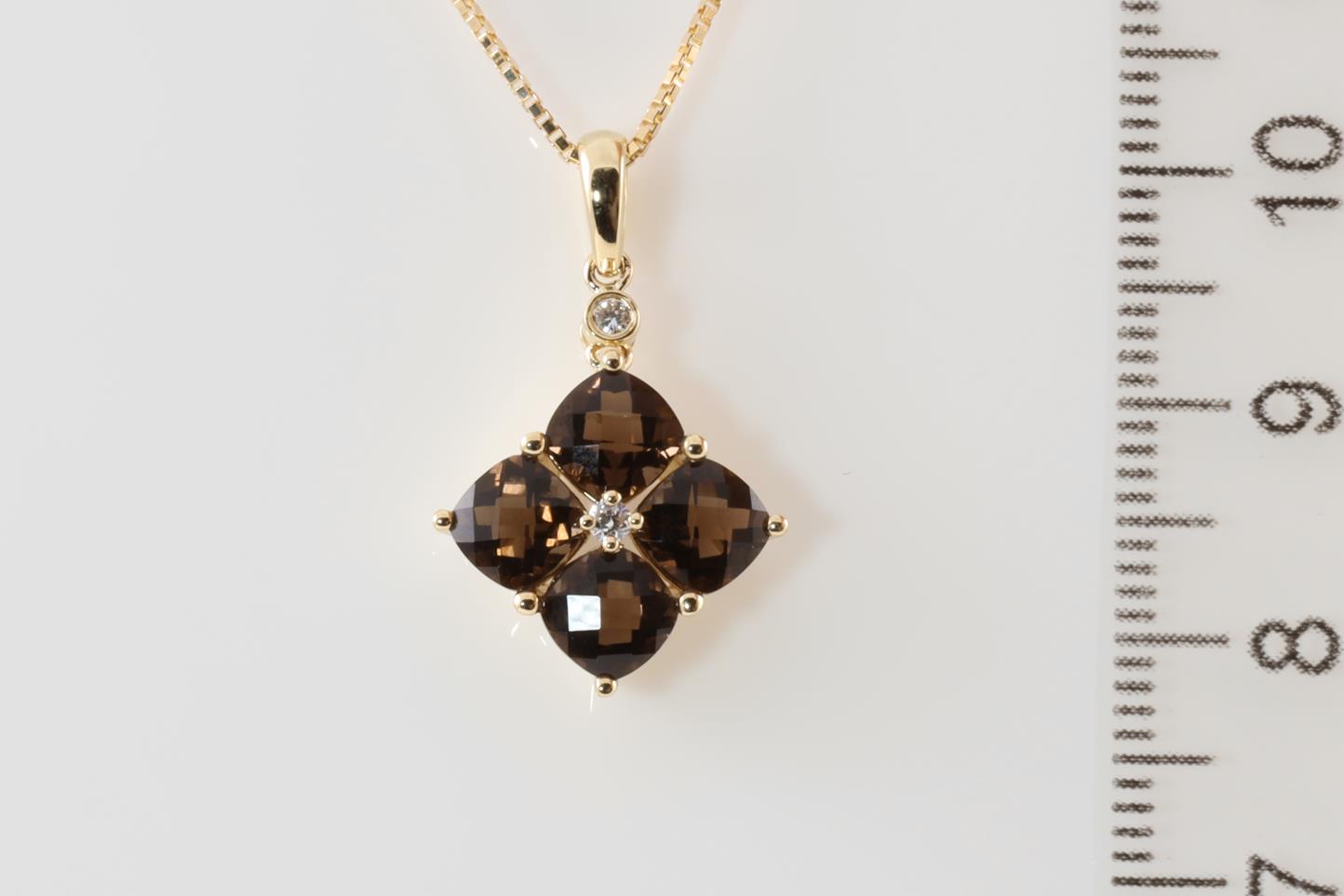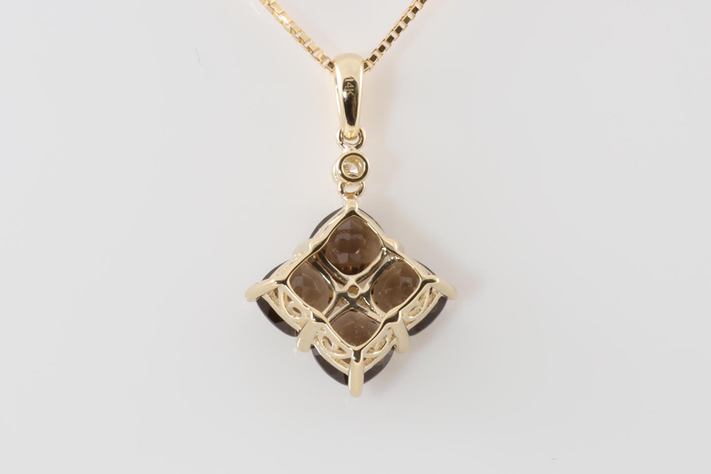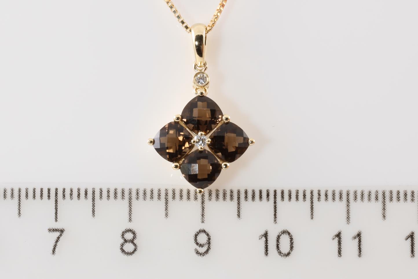 Quartz and Diamond pendant with cushion cut Smoky Quartz totalling 1.96cts and Diamonds totalling 0.05cts. 14ct yellow gold with 18ct gold adjustable 45cm chain. Weight: 3.80g (New)