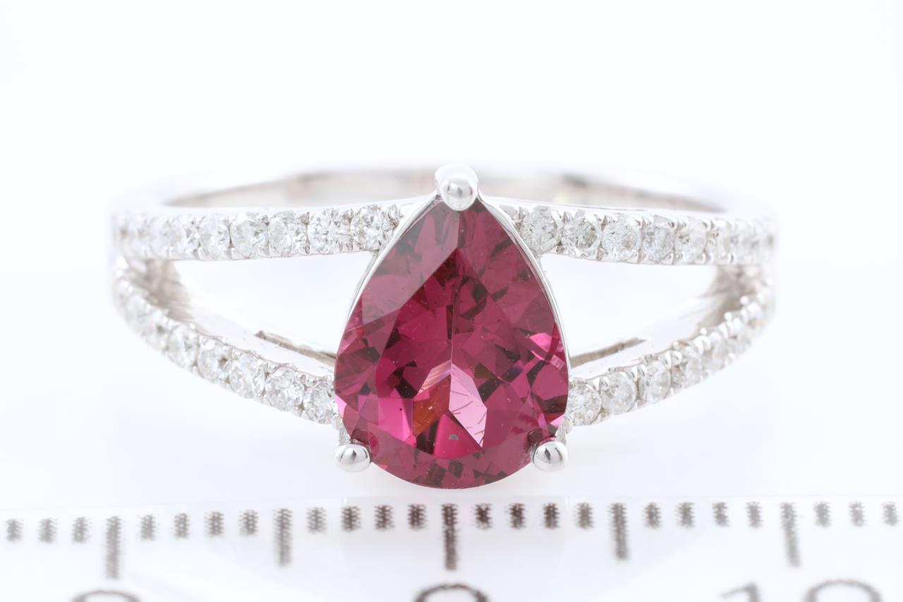 Garnet and Diamond ring with pear shape Rhodolite Garnet of 1.97ct and Diamonds totalling 0.30cts (Estimated grading: H P1). 14ct white gold. Ring size N. Weight: 4.0g (As new)