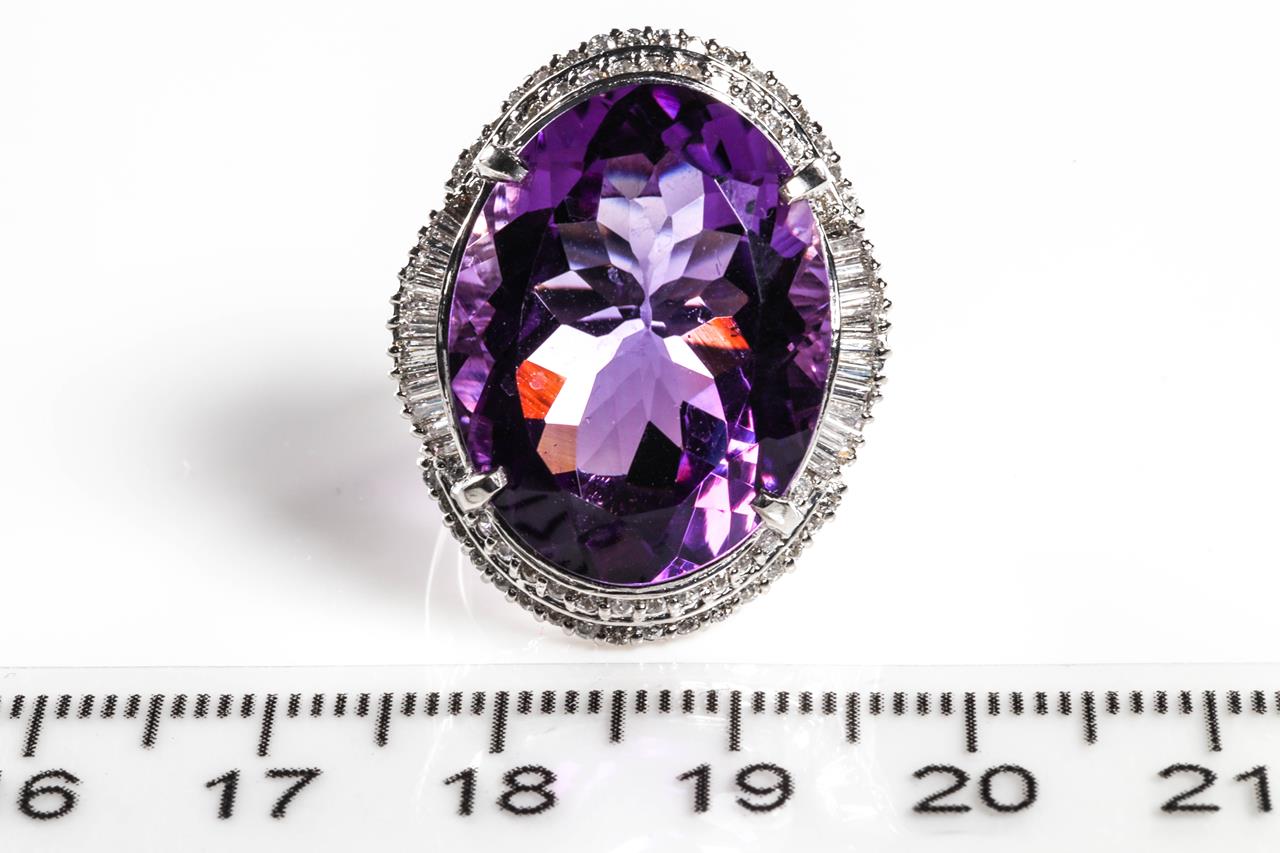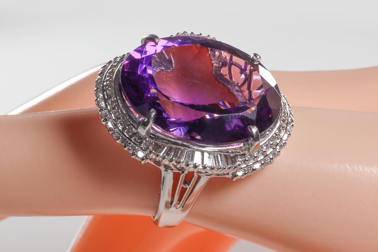 Amethyst and Diamond ring with centre oval shape Amethyst of 19.84cts and surrounding round and baguette cut Diamonds totalling 0.93cts (Estimated grading: G SI). Platinum. Ring size: L. Weight: 14g. (Pre-owned)