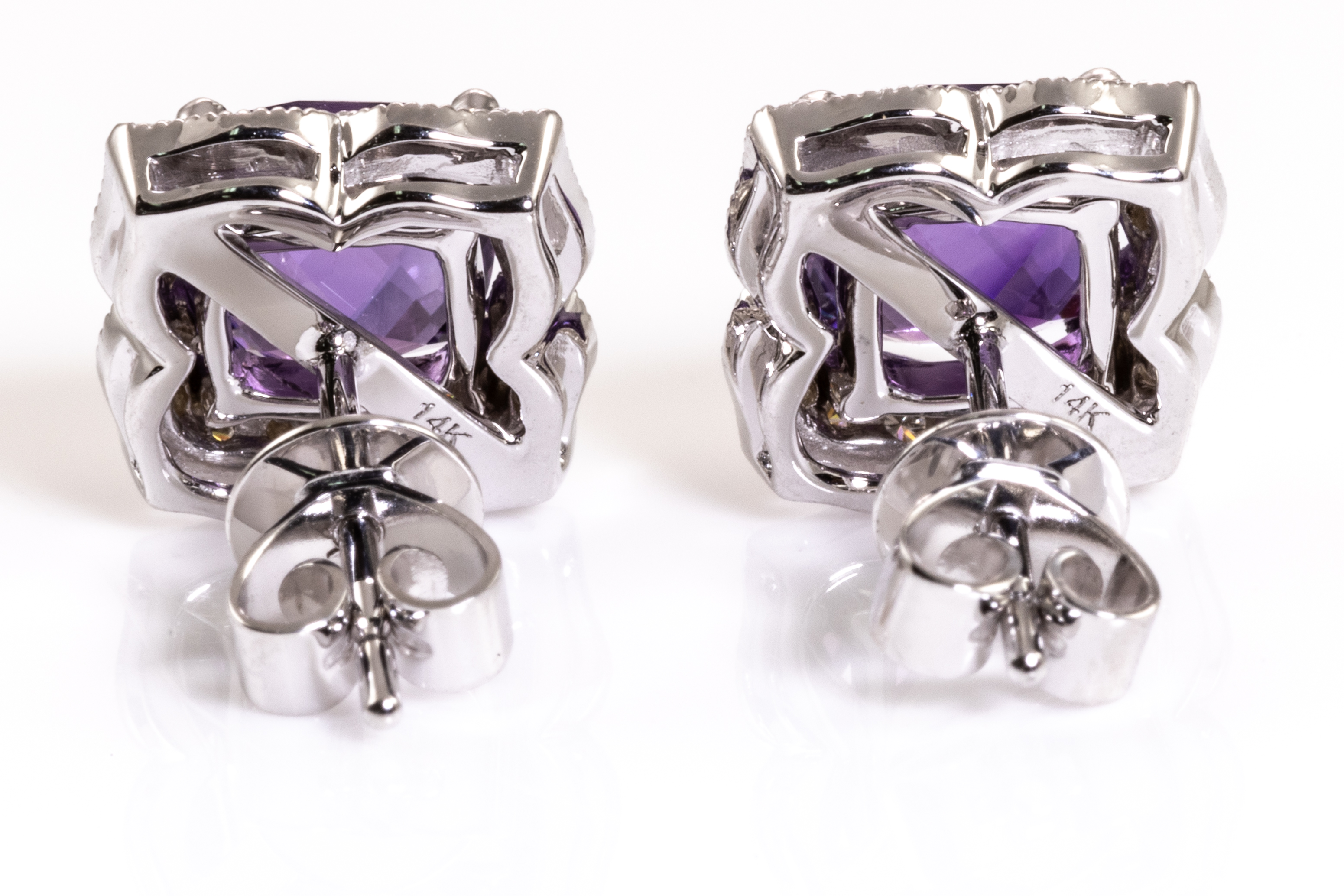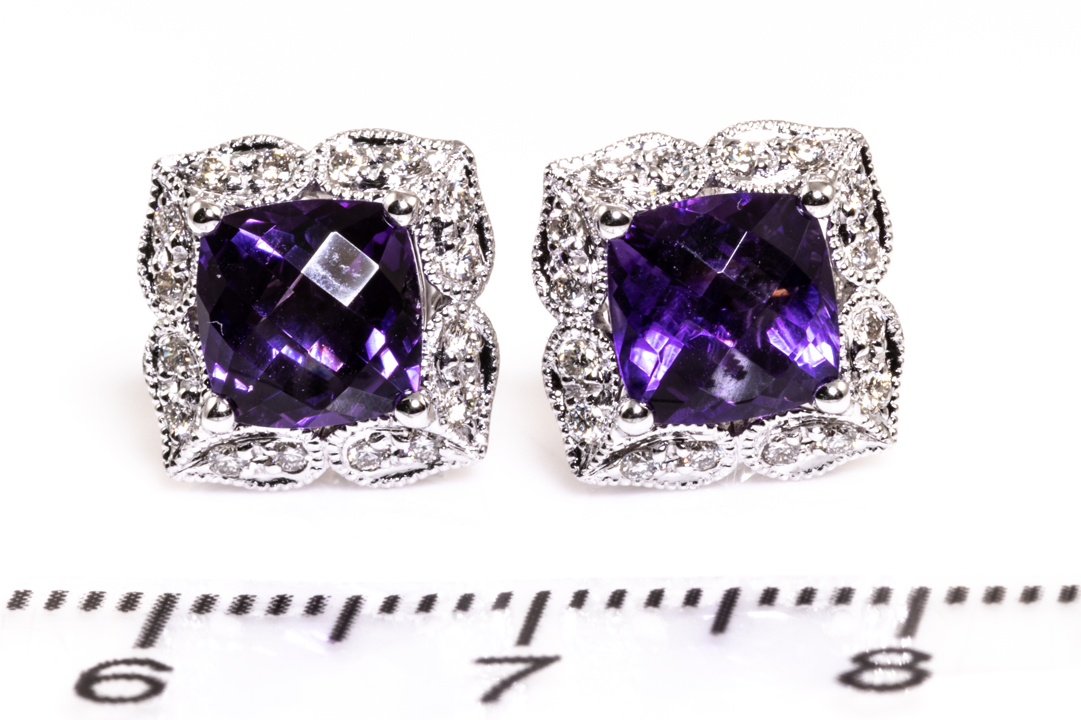 Amethyst and Diamond earrings with cushion Amethyst totalling 1.98cts and round Diamonds totalling 0.22cts. 14ct white gold. Weight: 3.5g. (New)