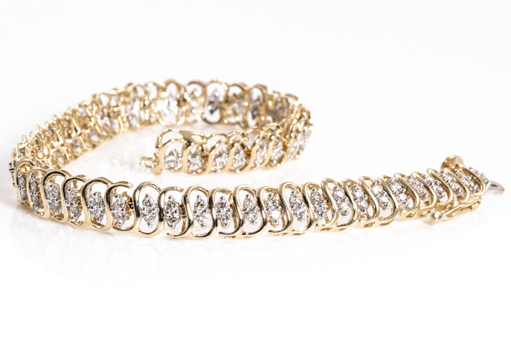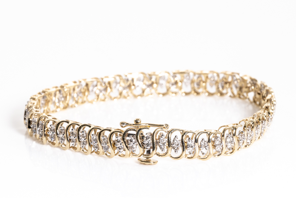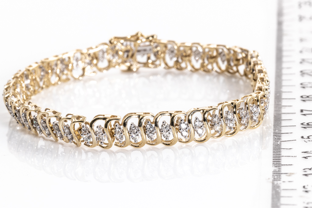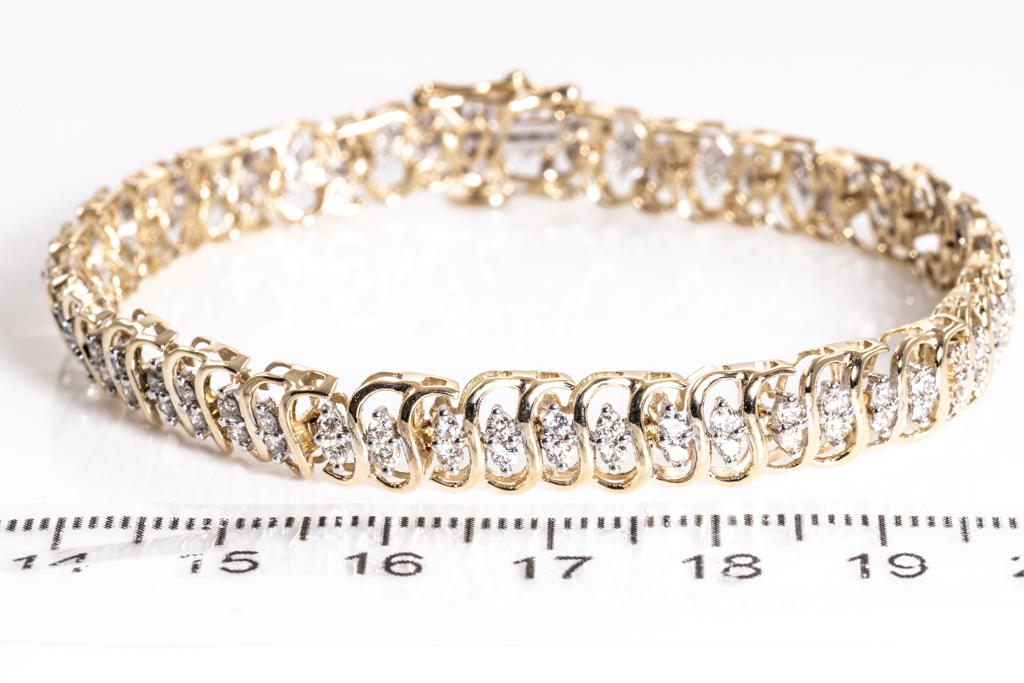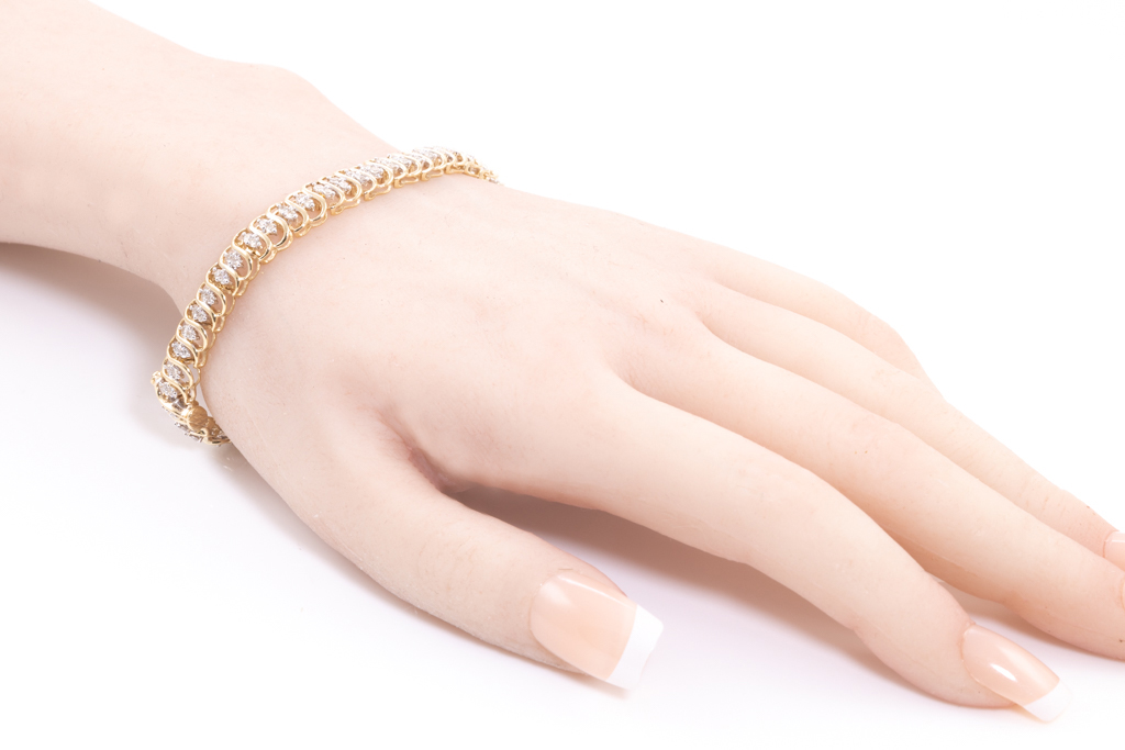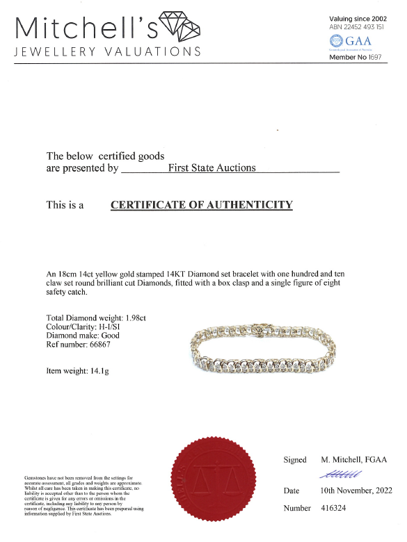 Diamond bracelet with 110 round Diamonds totalling 1.98cts (Estimated grading: H-I SI). 14ct yellow gold. Length: 18cm. Weight: 14.1g. With Certificate #416324. (New)
