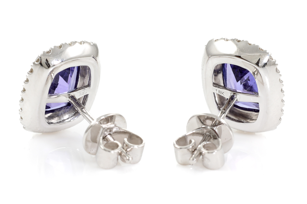 Tanzanite and Diamond earrings with cushion Tanzanite totalling 1.98ct and Diamonds totalling 0.24cts. 18ct white gold. Weight: 3.3g. (New)