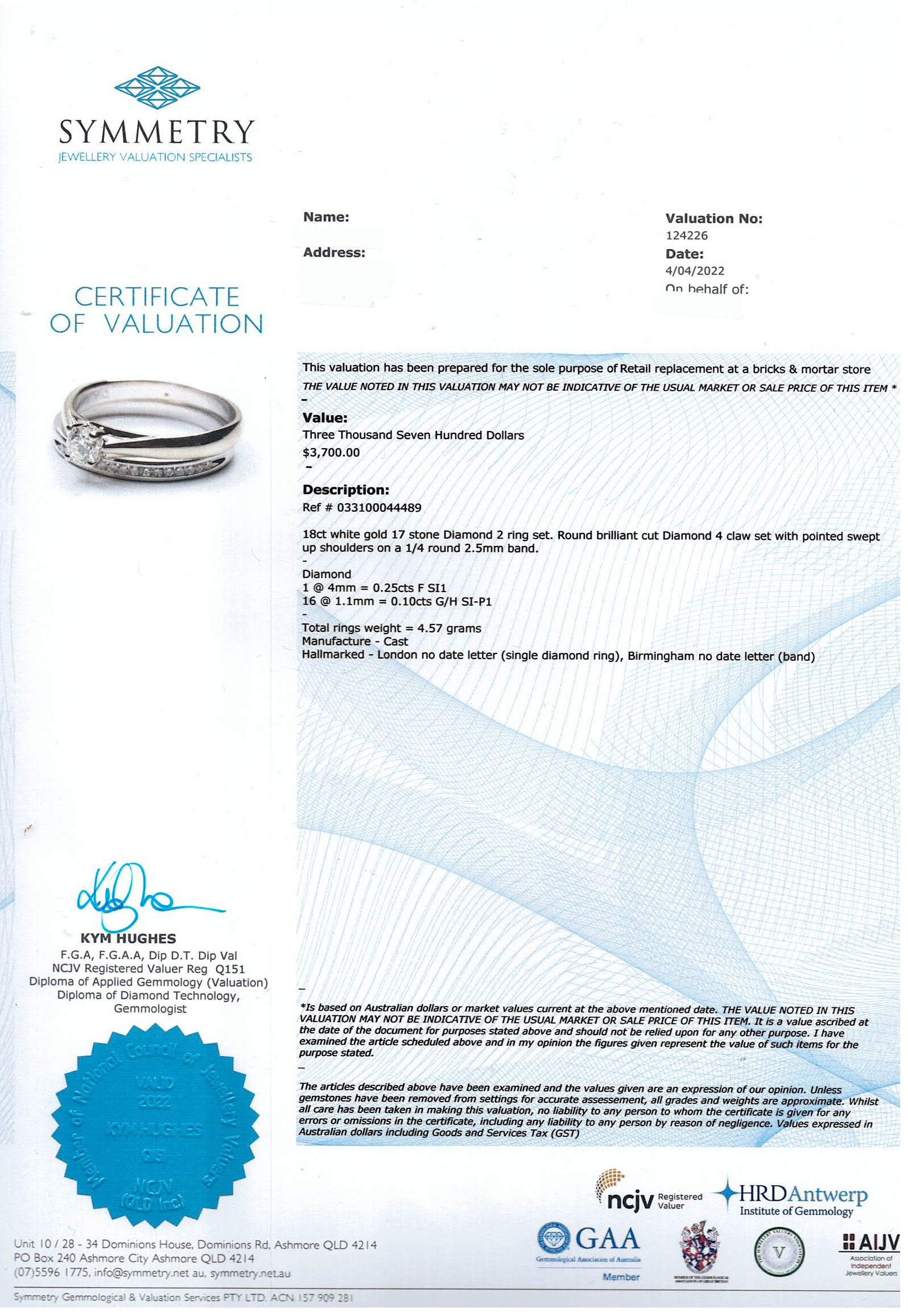 Diamond solitaire ring with round brilliant cut Diamond of 0.25cts and matching eternity ring with Diamonds totalling 0.10cts. Both 18ct white gold. Both ring size: N. Combined weight: 4.6g. With Valuation Certificate #033100044489. Solitaire ring may need rhodium plating. (Pre-owned)
