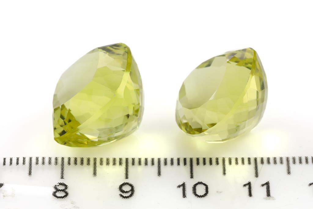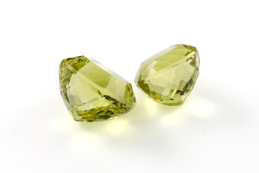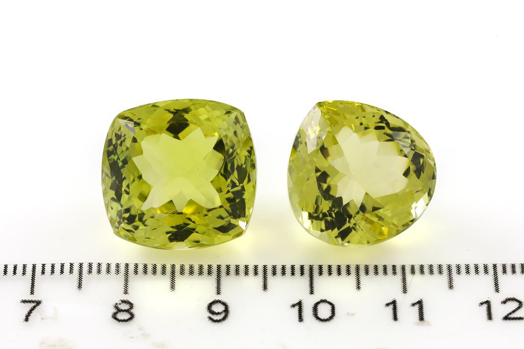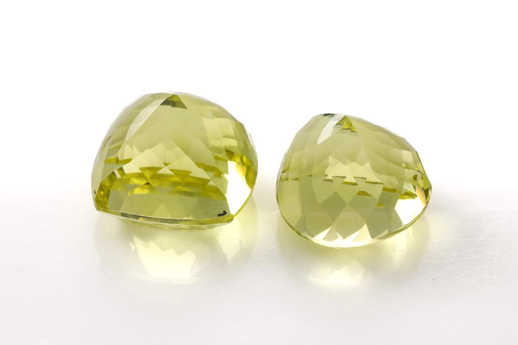 A loose pear shape Lemon Quartz of 19.75ct. Dimensions: 15 x 15 x 12.4mm. With a loose cushion cut Lemon Quartz of 25.00ct. Dimensions: 16 x 16 x 13.4mm. (As New)