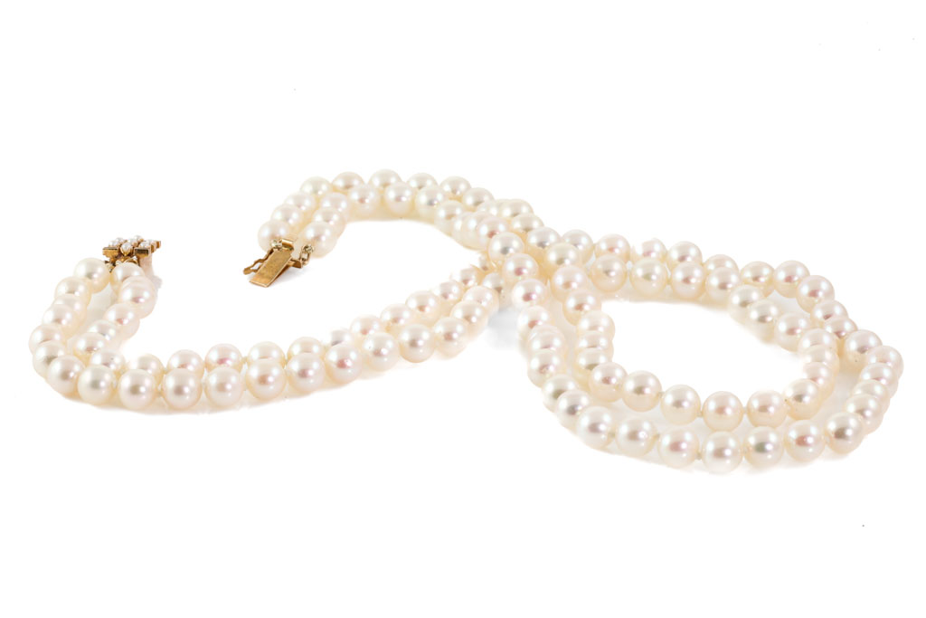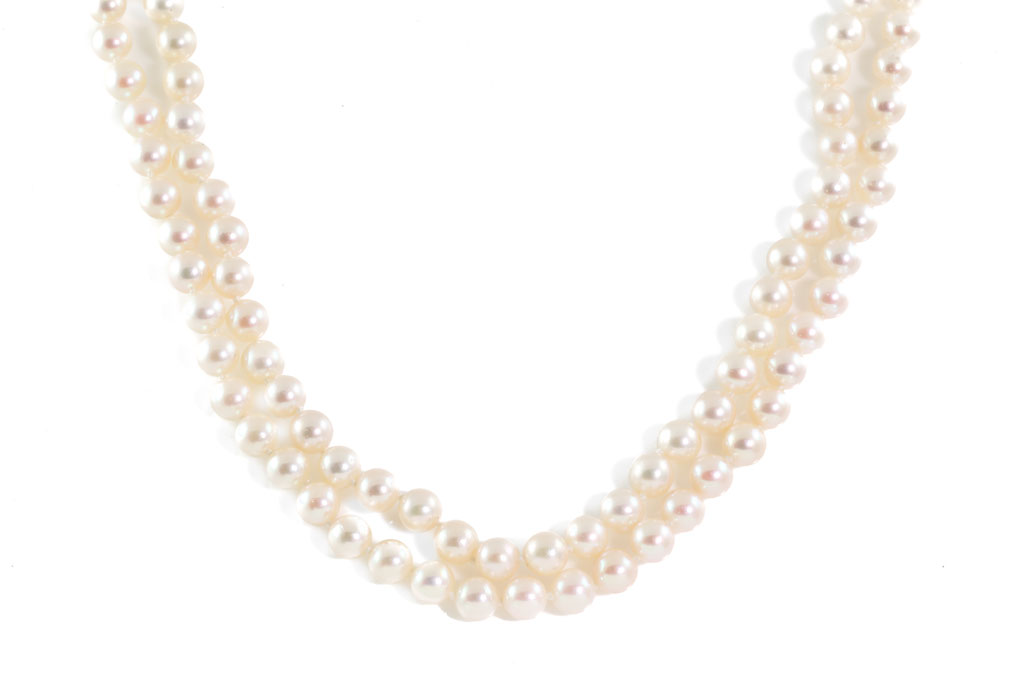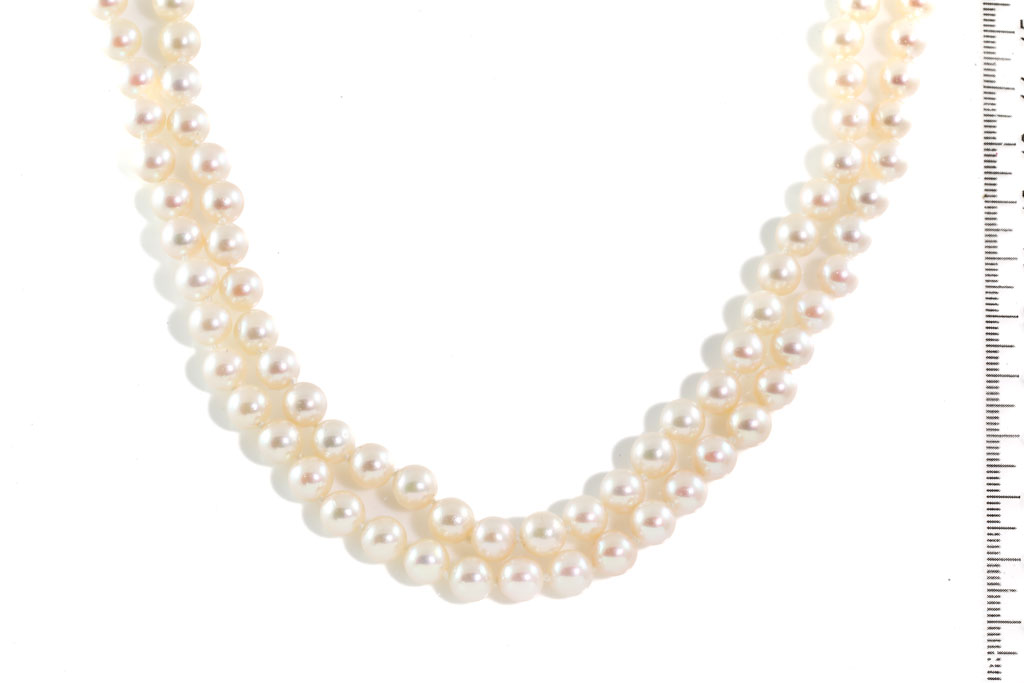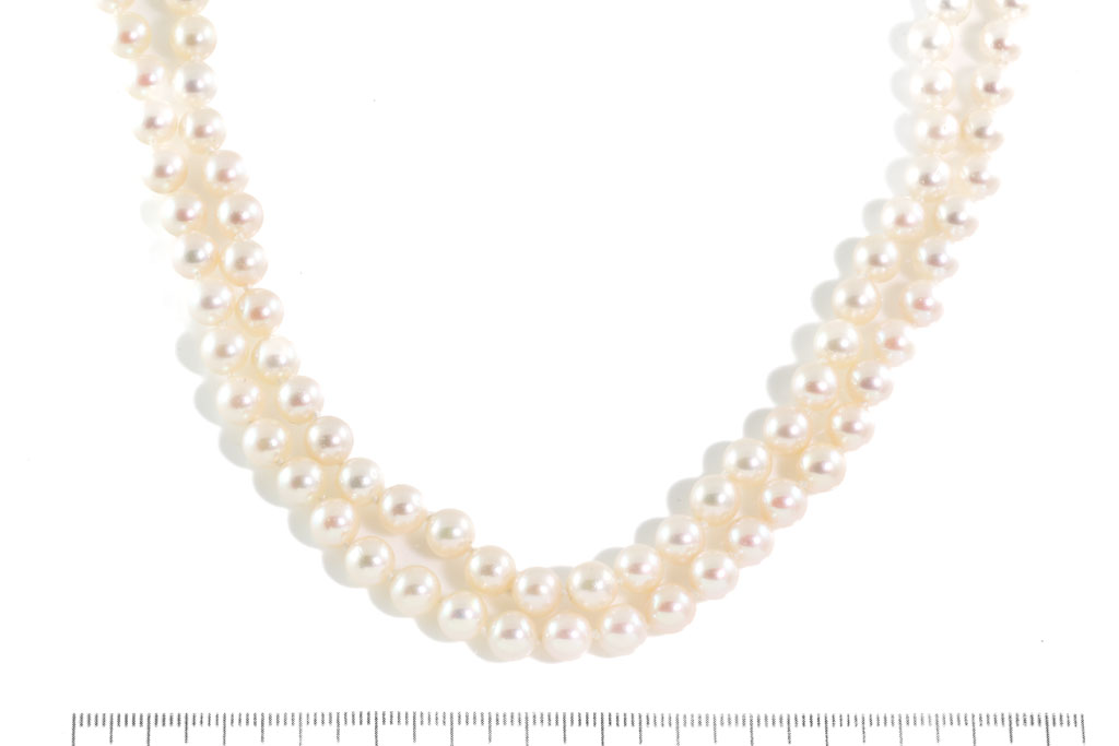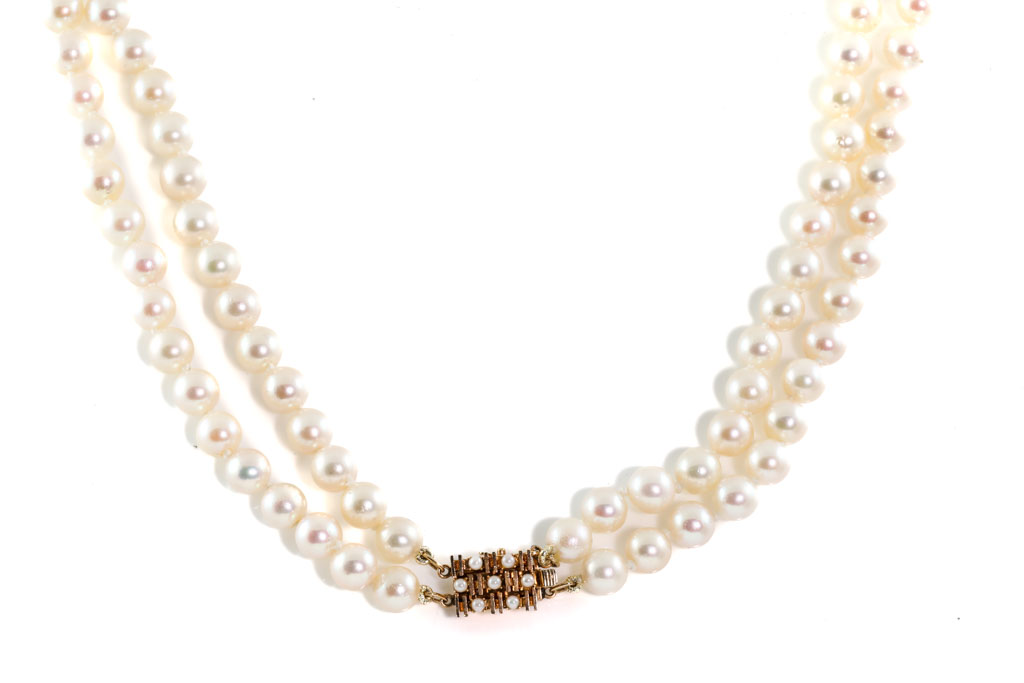 Pearl necklace with 2 rows of Akoya Pearls of 6.4-6.8mm. 14ct yellow gold clasp with 7 seed pearls of 2mm. Length: 45cm. Weight: 55.8g. (Pre-owned)