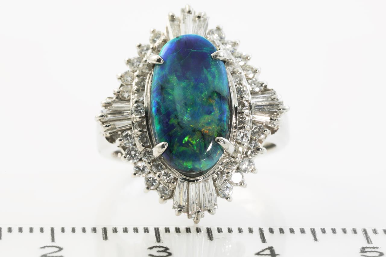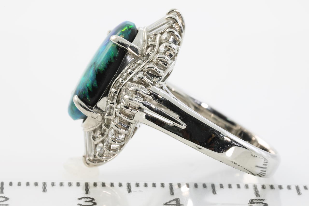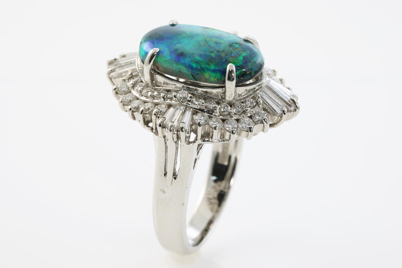 Opal and Diamond ring with oval shape Black Opal of approximately 2.00ct and Diamonds totalling 0.97cts (Estimated grading: H SI). Platinum. Ring size: K1/2 Note it is not recommended to resize this ring smaller. Weight: 10.4g (Pre-owned)