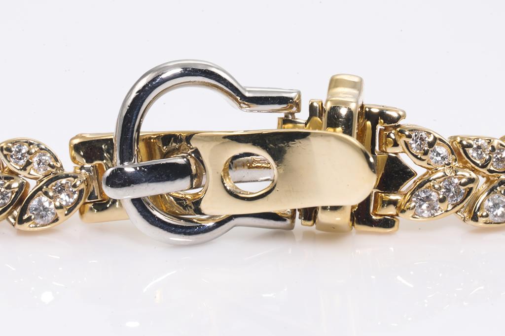 Diamond buckle design bracelet with round Diamonds totalling 2.00cts (Estimated grading: I-J SI). 18ct yellow gold and platinum. Length: 18cm Weight: 19.6g. With certificate #415311. (Pre-owned)